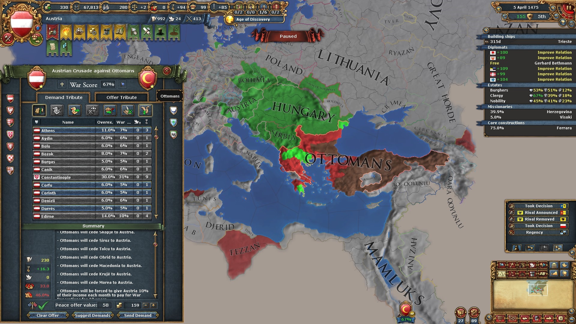 オスマン軍がマムルーク領に攻めてくれたお陰で、自軍は黒海を迂回しアナトリア方面の占領も出来ました。