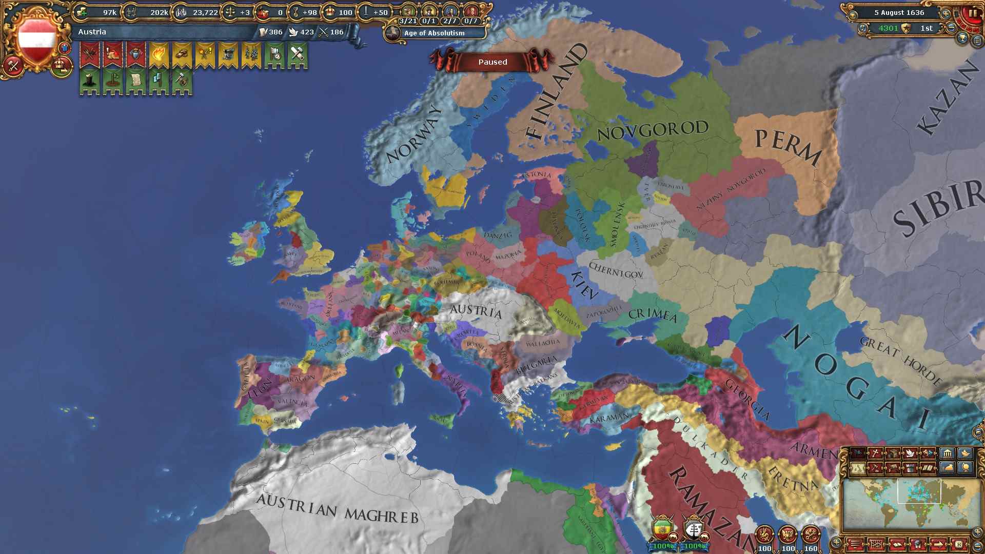 現バージョンで変更された神聖ローマ帝国のシステムの仕様を確かめつつ世界征服を目指しました。