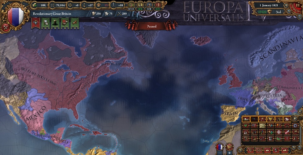 革命政権になり大幅な補正を受けているためFLは格段に伸びています。それを除いてこの国力は拡張プレイのイングランドと比べてどのようなものなのでしょうか?北アメリカの富はほぼイギリス海峡に流していますが、思ったほどの交易収入は得られず。普通に拡張プレイした方が国力の伸びもいいでしょう。今のVerだと開幕百年戦争してないので、フランスを打ち負かすのは以前よりは簡単でしょう。