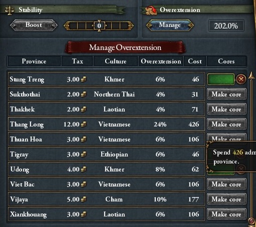 東南アジアはコア化コストの高い地域でござる。それを一気に併合しては、とても中核化が間に合いませぬ!!