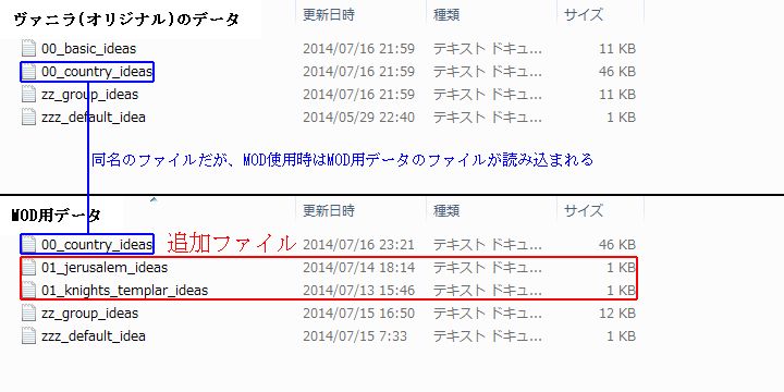 ですので変更したい箇所のデータ、もしくは新期追加のデータを用意するだけでMODは稼働します。但し、新期追加分のデータは既存のデータファイルと同名にしないでください。従来のデータが読み込まれず動作が不安定になります。