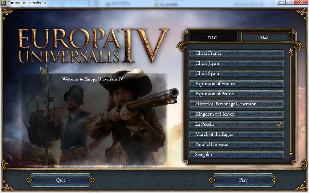 EU4のゲームランチャーを立ち上げ「Mod」のタブをクリックし「La Pucelle」にチェックを入れてください。