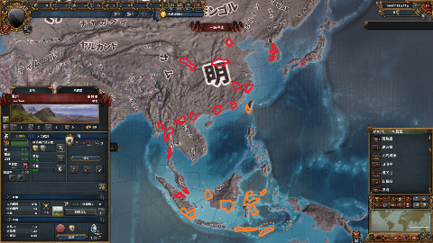 あとはひたすら国力をつけて明の朝貢国に挑む。プレイ途中で本国が欧州なのかザンジバルなのかわからなくなる(というか欧州の存在を忘れる)かもしれないが、欧州でも周辺国を抑止できるぐらいには力をつけたほうがいい。さりげなく日本の摂津/Naniwaにも陶磁器州がある。油断しているとポルトガルに取られたりするので注意だ。