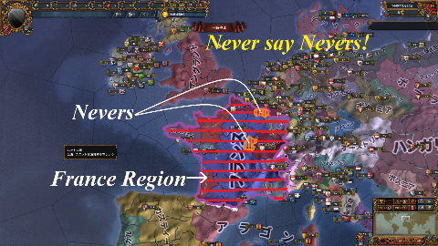 初戦でシャンパーニュの旧領を回復したらこれを併合しつつ二戦目では首都南のブルボネー/Moulinsとオーヴェルニュ/Clermontを奪いオーヴェルニュにガスコーニュを属国解放しよう。AEに余裕があればパリもとりたいが戦勝点を馬鹿みたいに食うのでこの後でもいい。三戦目で南仏のガスコーニュコアを回復したらこれを併合してトゥールーズを復活させ、四戦目でこれのコアを奪う。あとは青蛙の搾りカスを回収しつつ対イングランドで動くことになる。フランス戦での注意点としてはイングランドにパリを絶対渡さないことだ(同君化されたら厄介)。100年戦争の続きだとおもってフランスリージョンからイギリスを叩き出そう。スコットランドがまだ息をしていればNOCBからの属国化などしてブリテン島に橋頭堡を築くと対英戦をスムーズに進められるかもしれない。