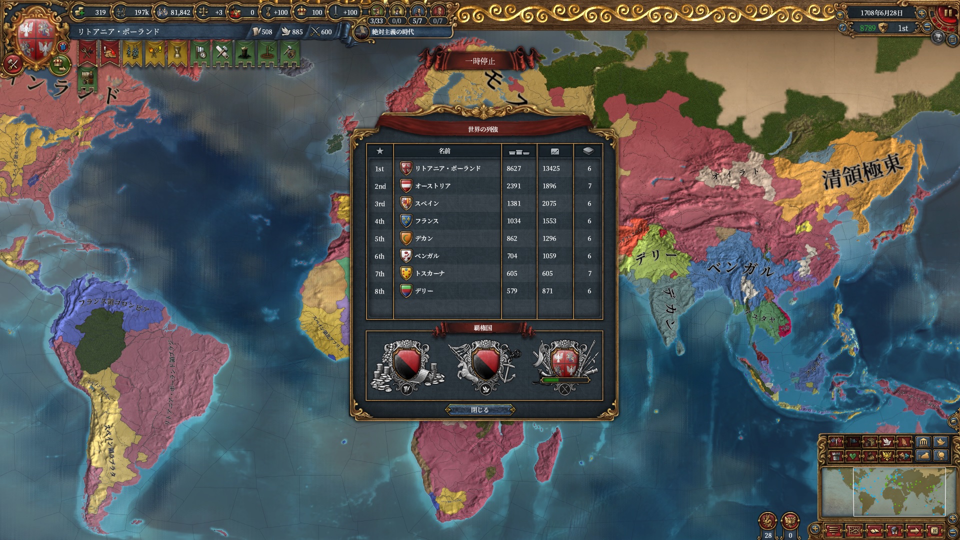 自身の次に列強スコアが高い相手が植民地国家持ちのスペインで2000程度、苦戦する要素はなさそうです。