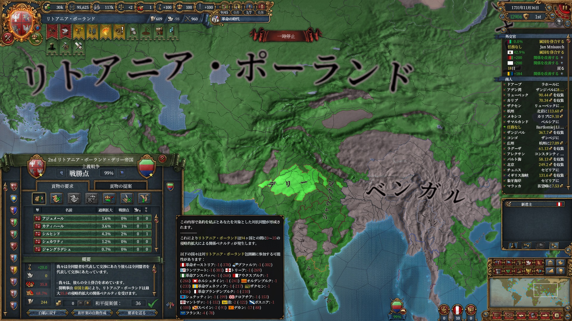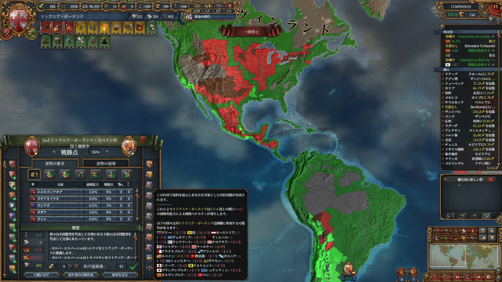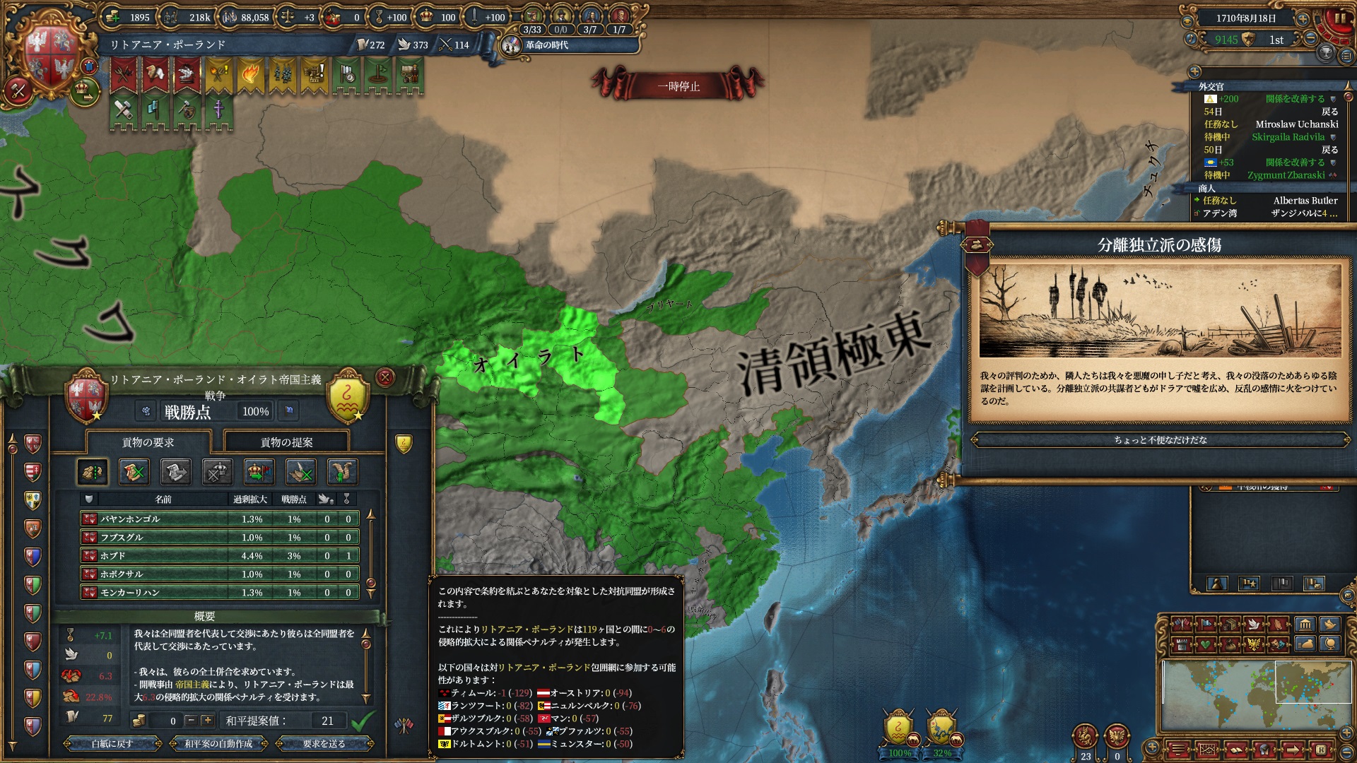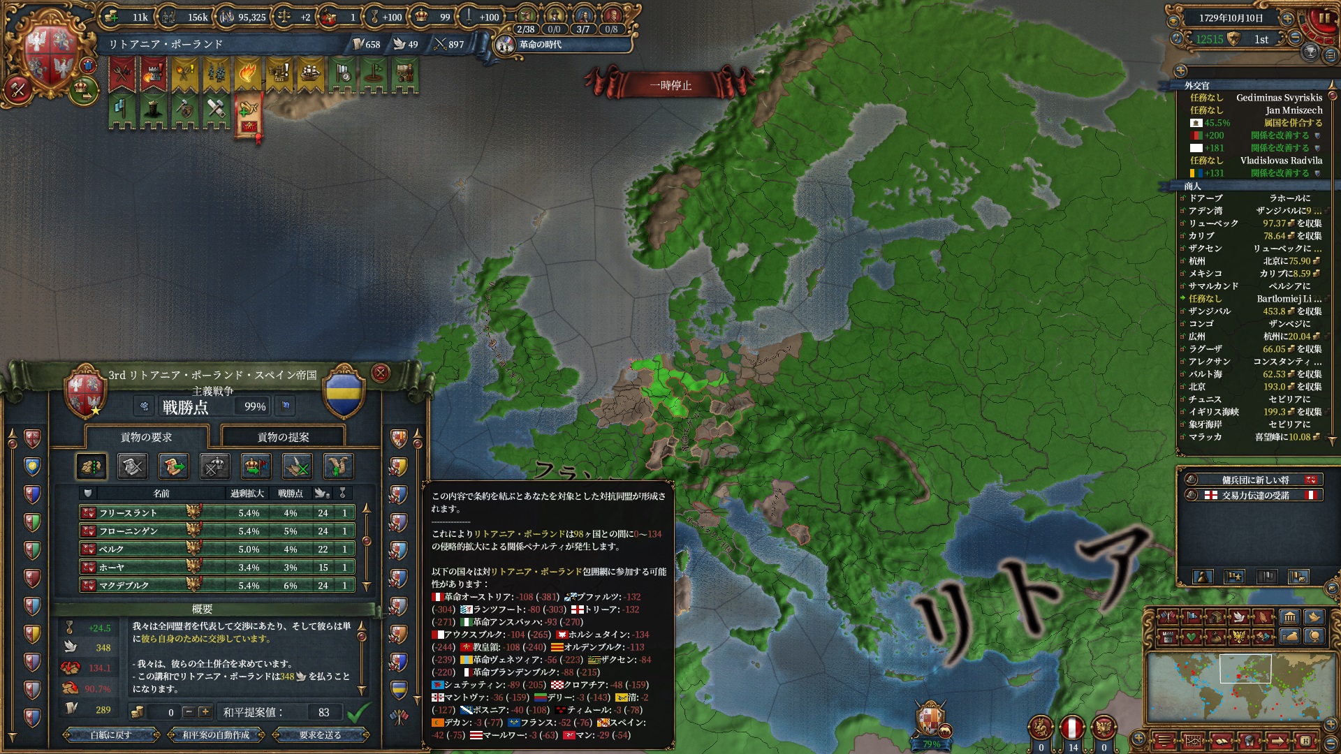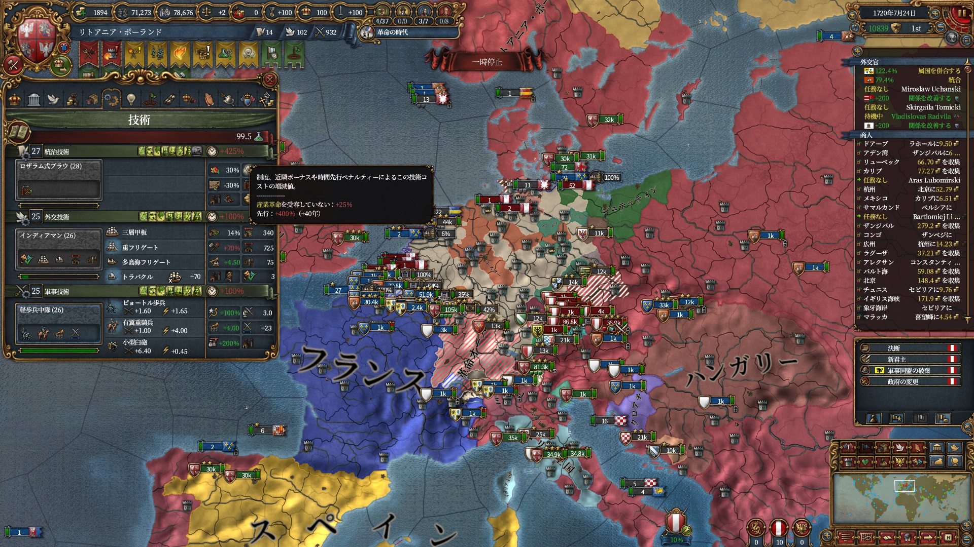 ゲーム後半はリトアニア=ポーランドNI・権勢アイデア・権勢統治ポリシーが合わさり属国併合コストは-60%に達します(特権込みで65%)。