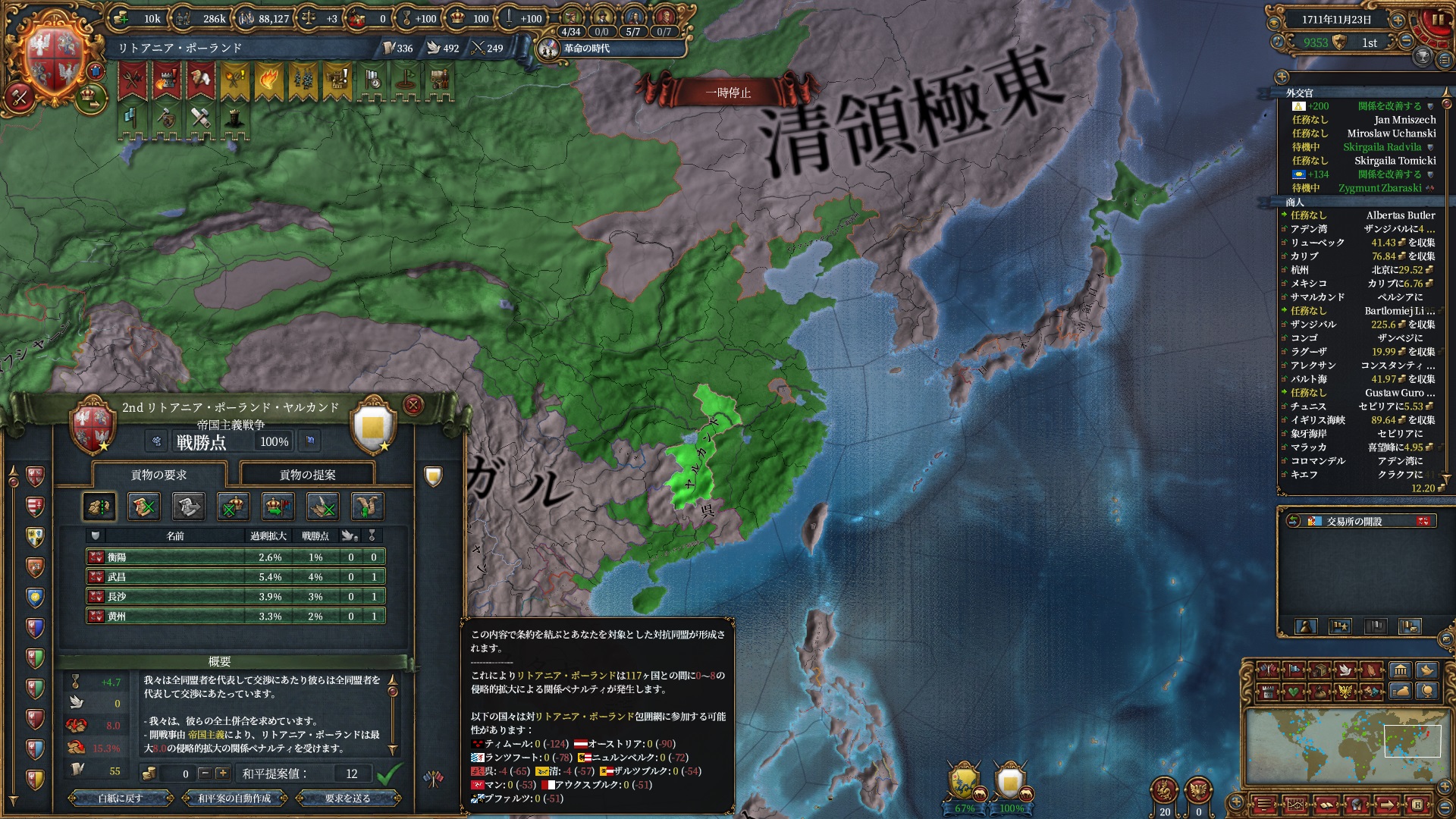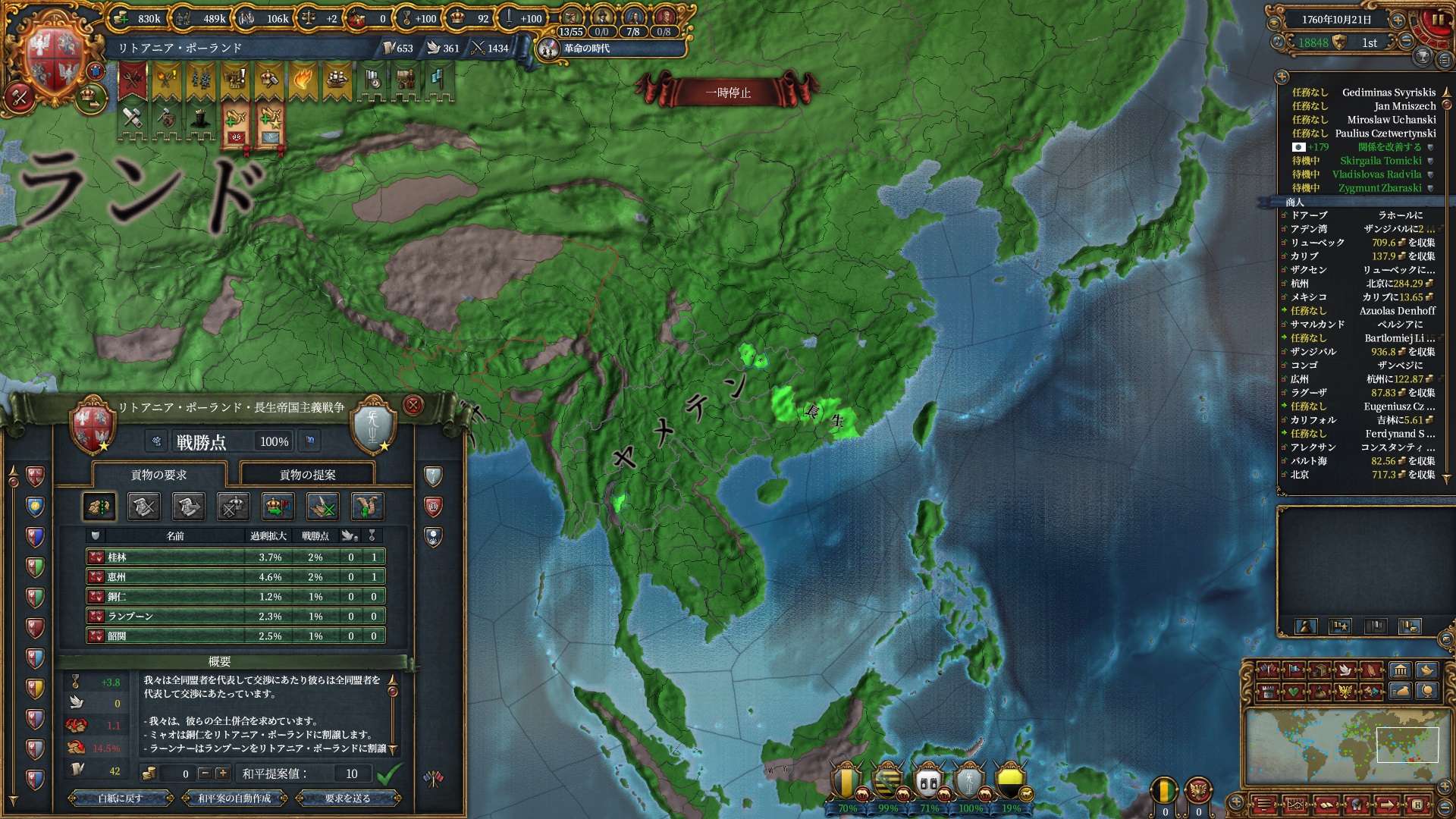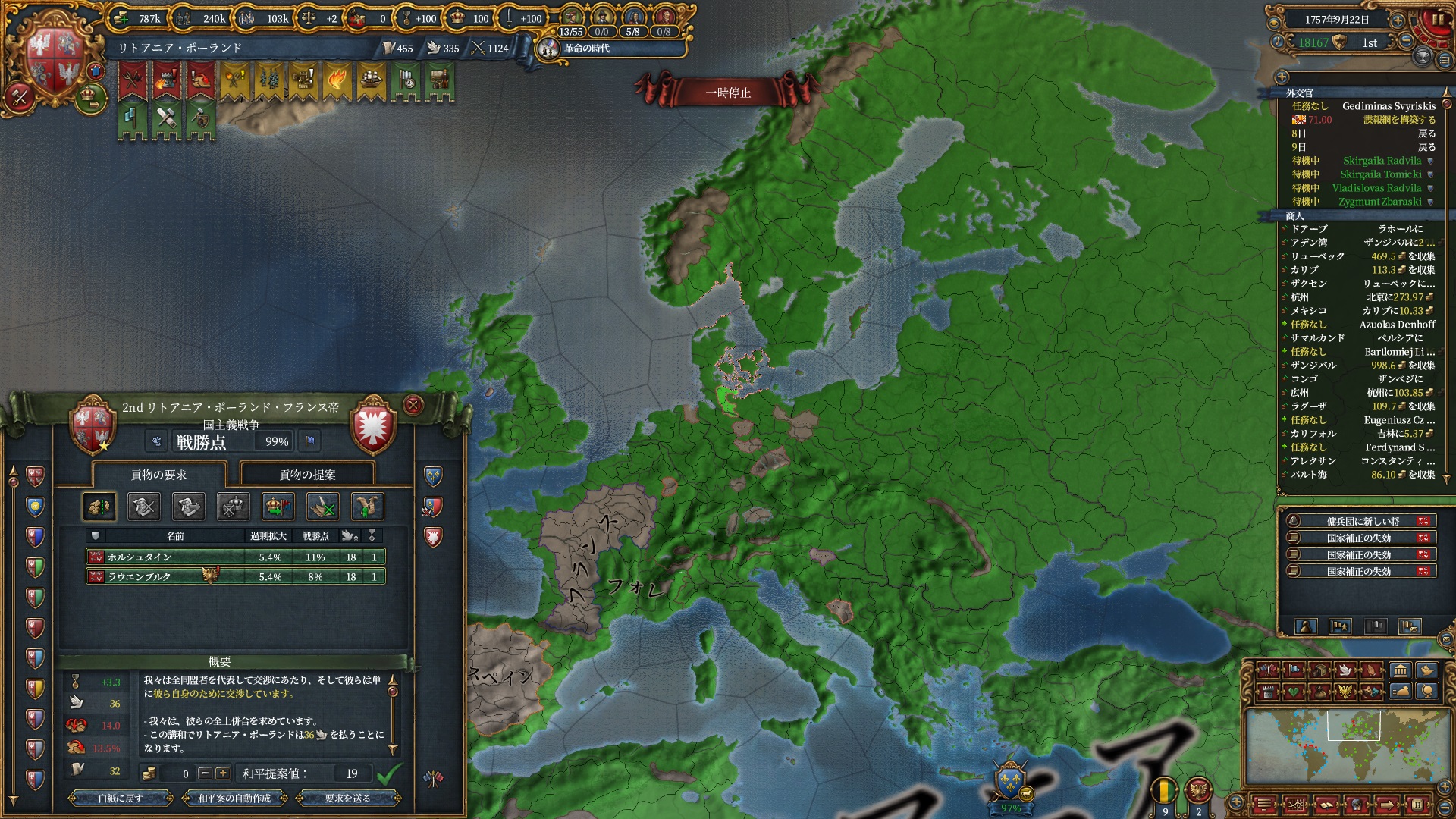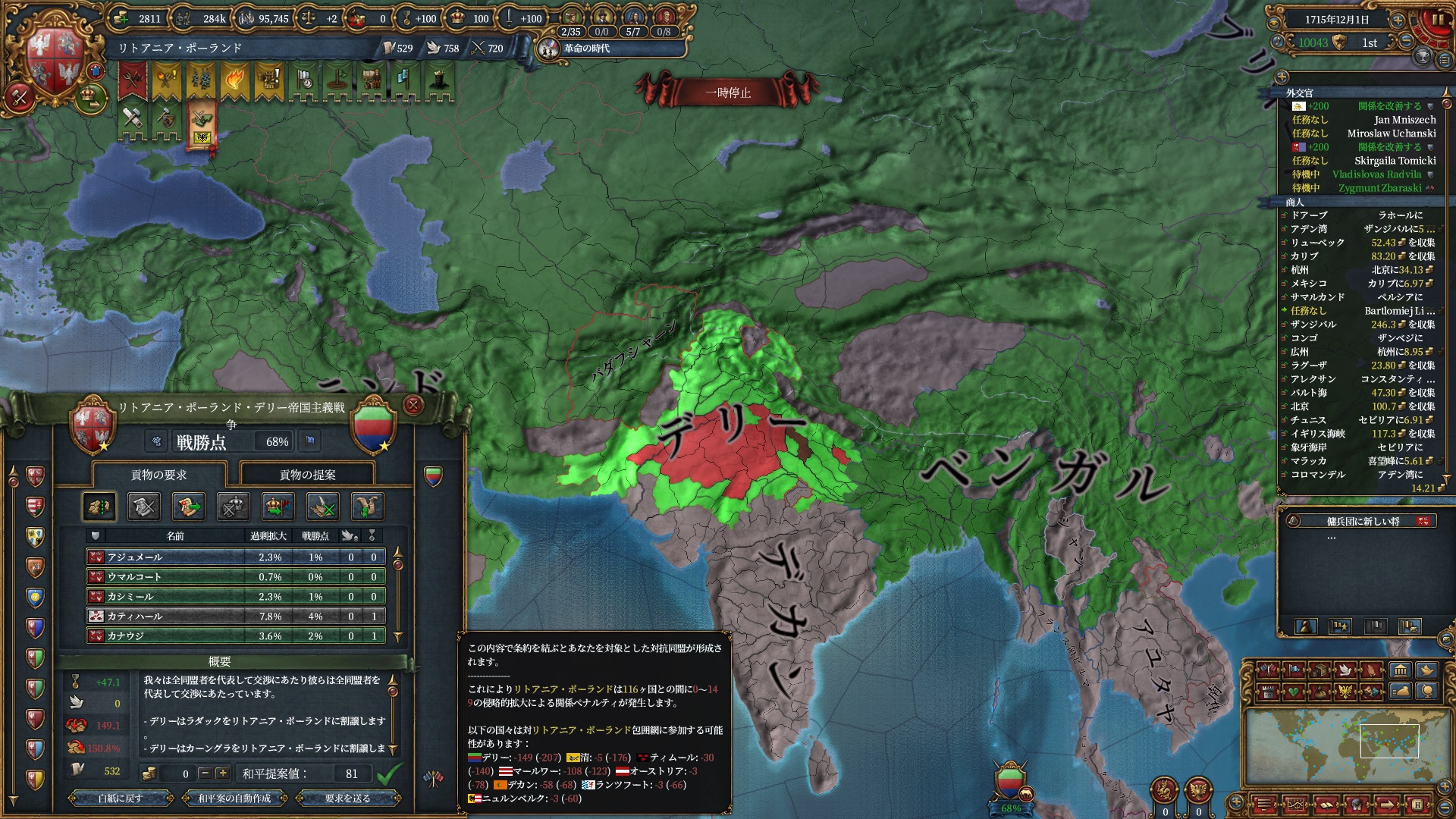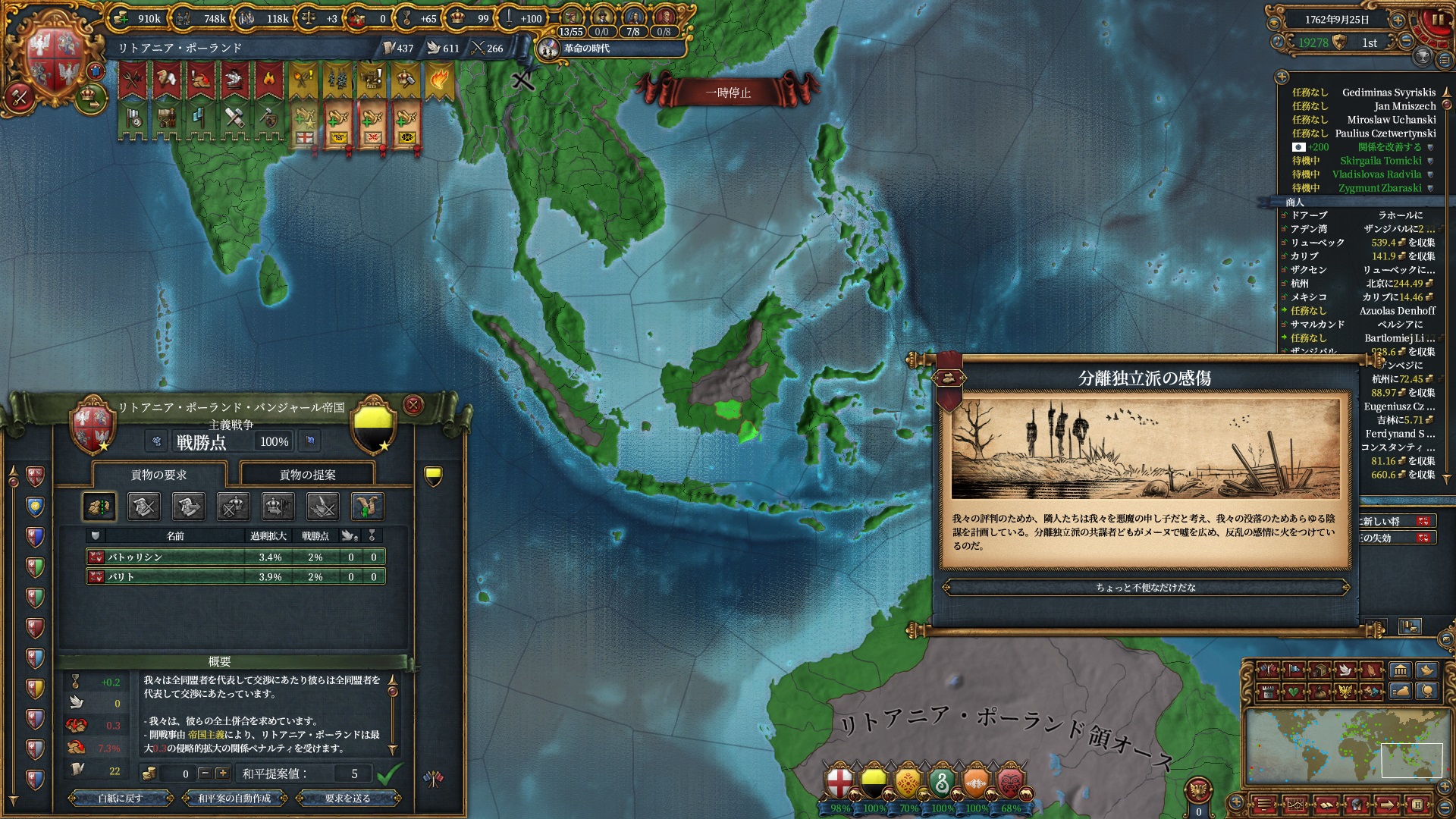 ゲーム後半はリトアニア=ポーランドNI・権勢アイデア・権勢統治ポリシーが合わさり属国併合コストは-60%に達します(特権込みで65%)。