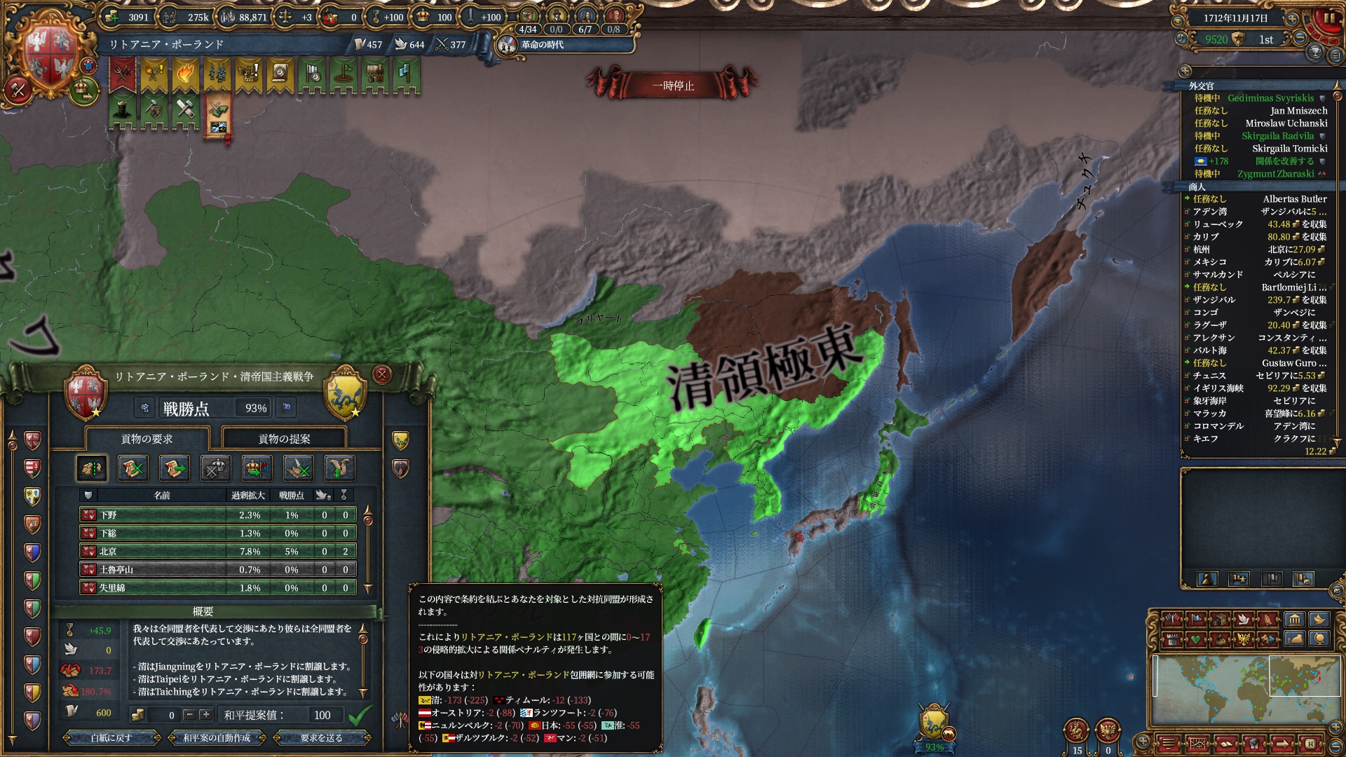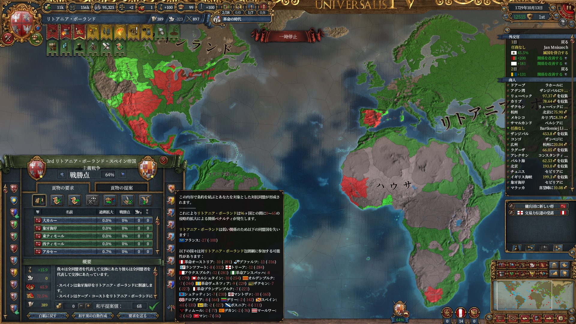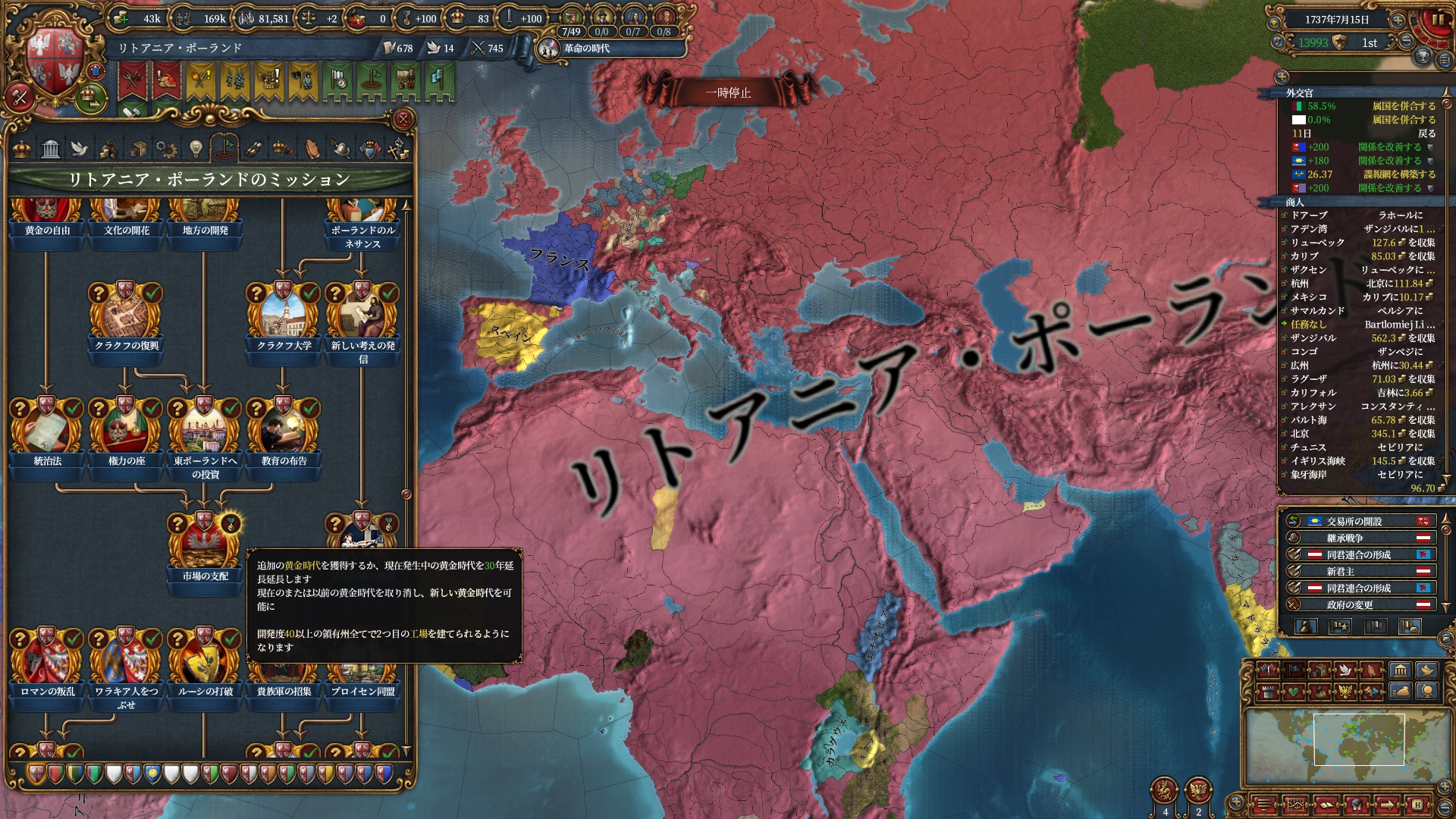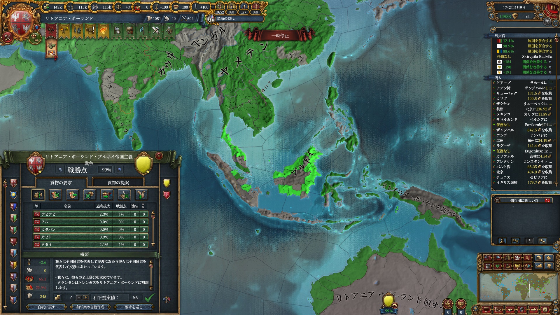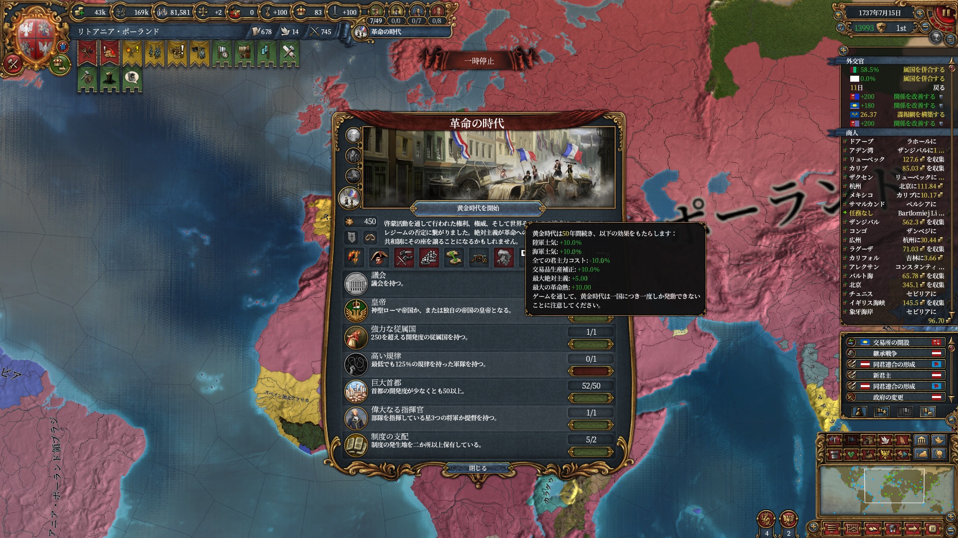 ゲーム後半はリトアニア=ポーランドNI・権勢アイデア・権勢統治ポリシーが合わさり属国併合コストは-60%に達します(特権込みで65%)。