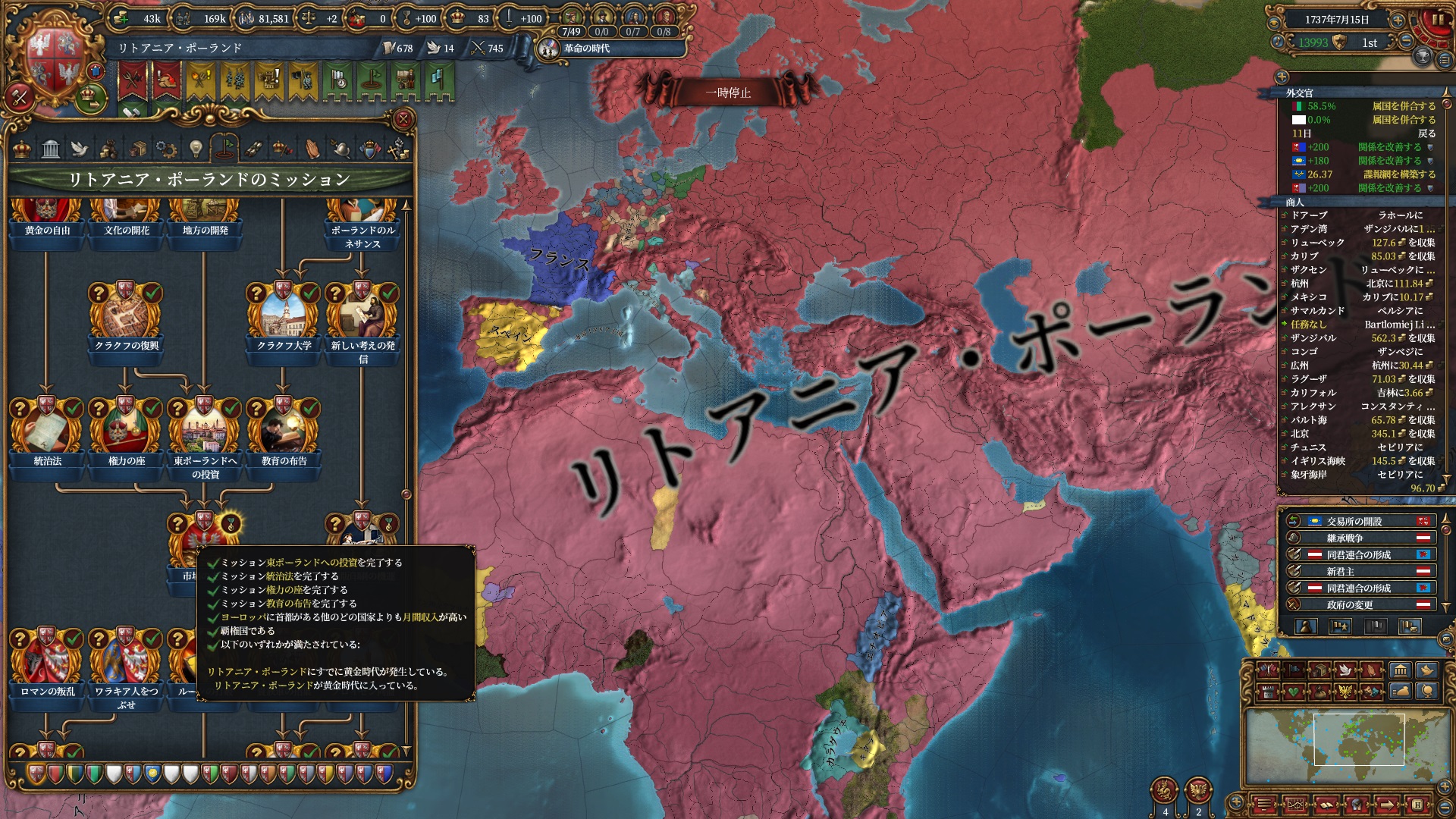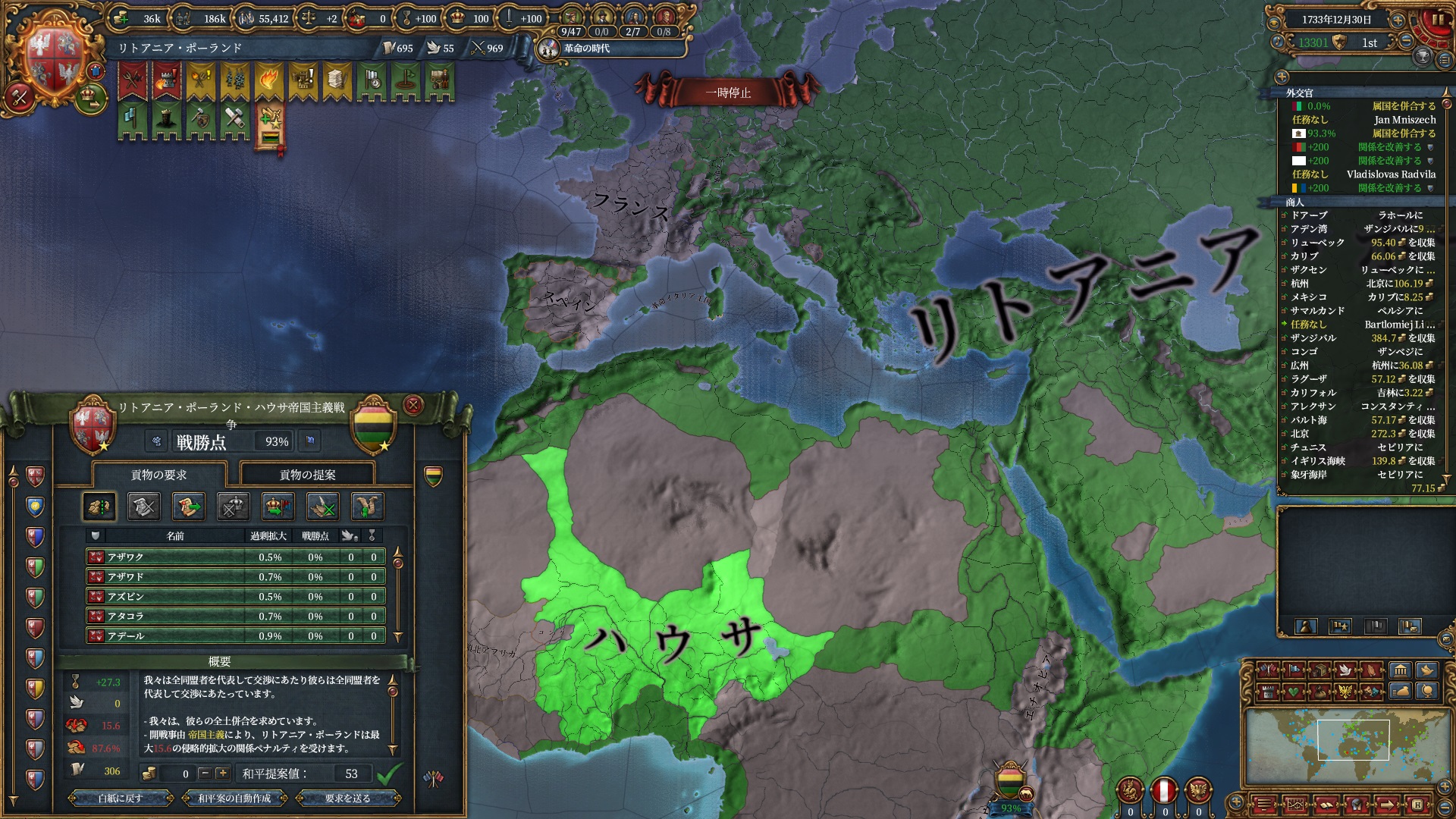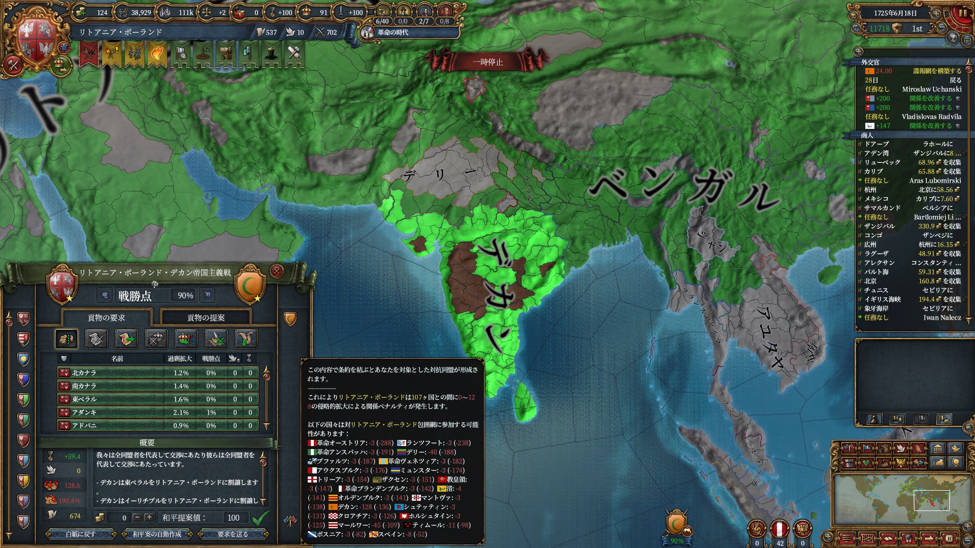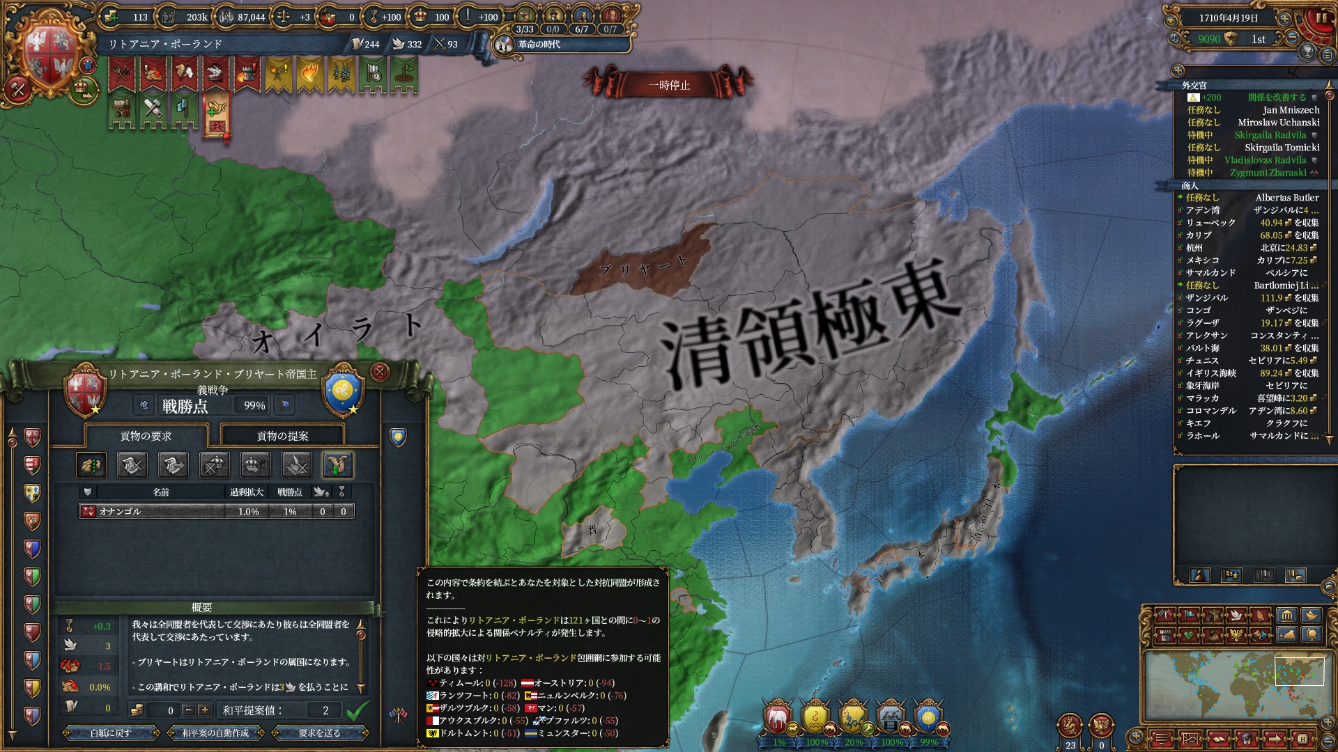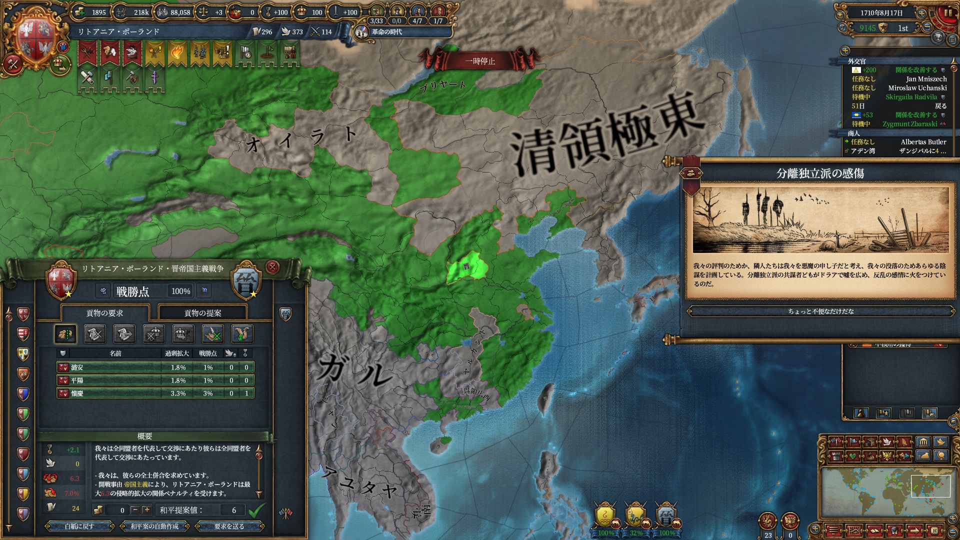 ゲーム後半はリトアニア=ポーランドNI・権勢アイデア・権勢統治ポリシーが合わさり属国併合コストは-60%に達します(特権込みで65%)。