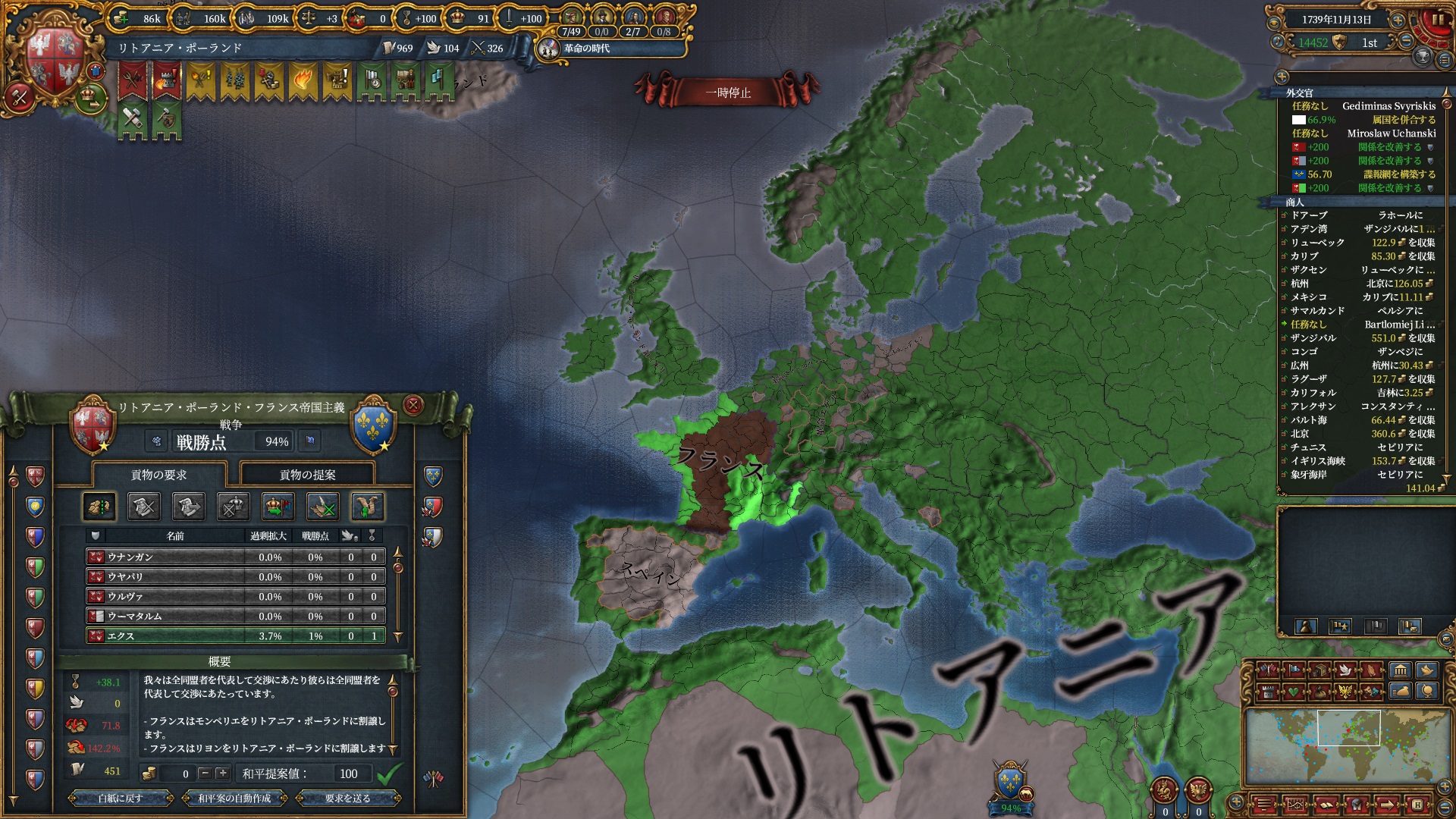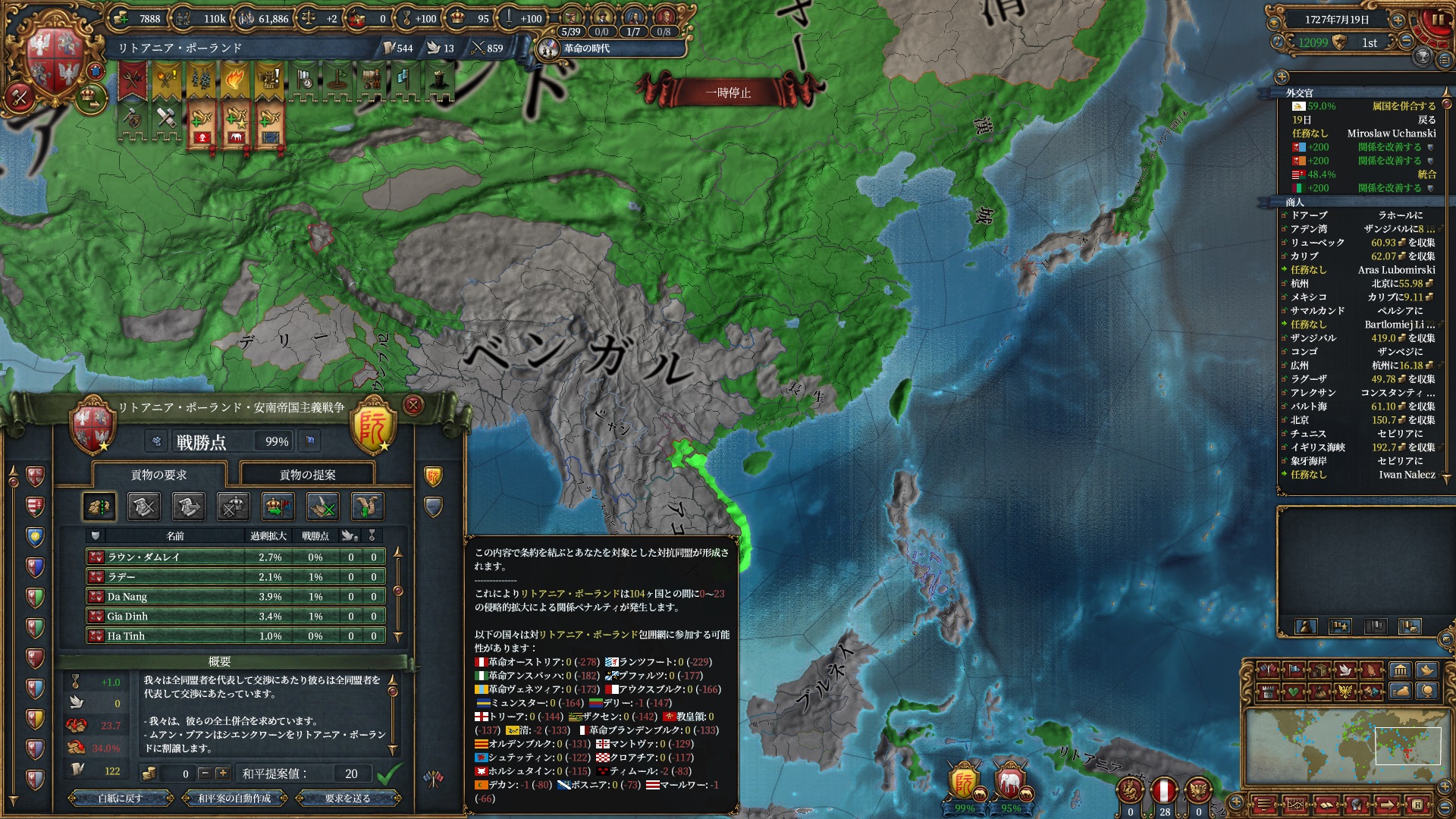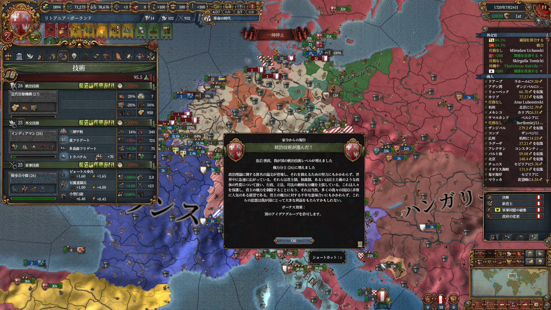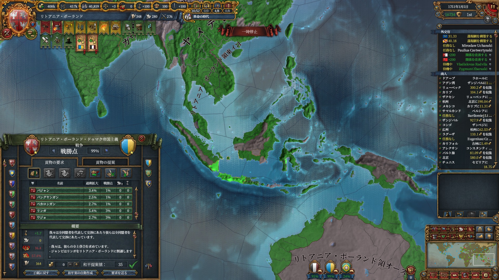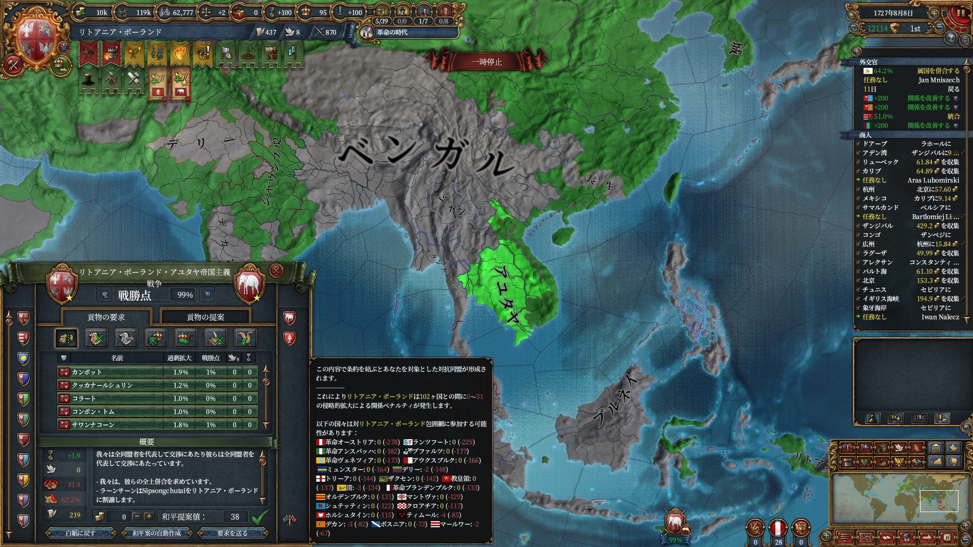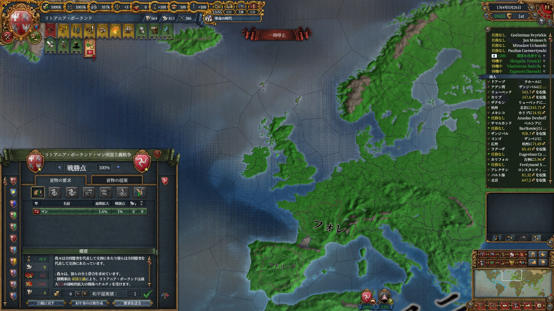 ゲーム後半はリトアニア=ポーランドNI・権勢アイデア・権勢統治ポリシーが合わさり属国併合コストは-60%に達します(特権込みで65%)。