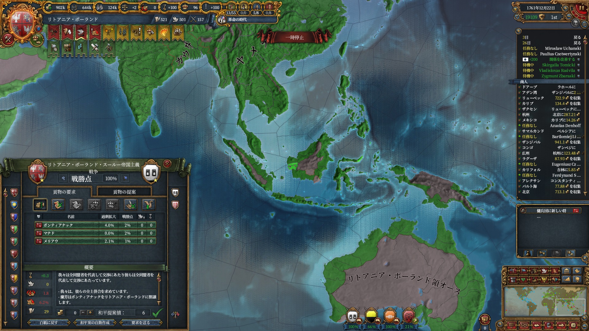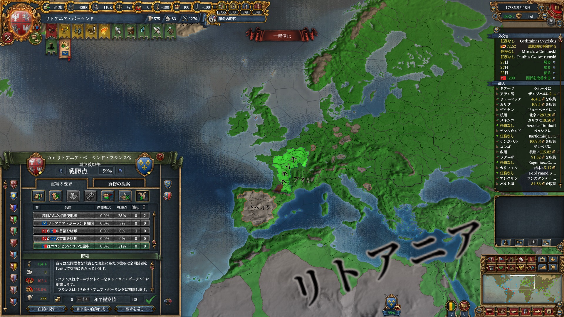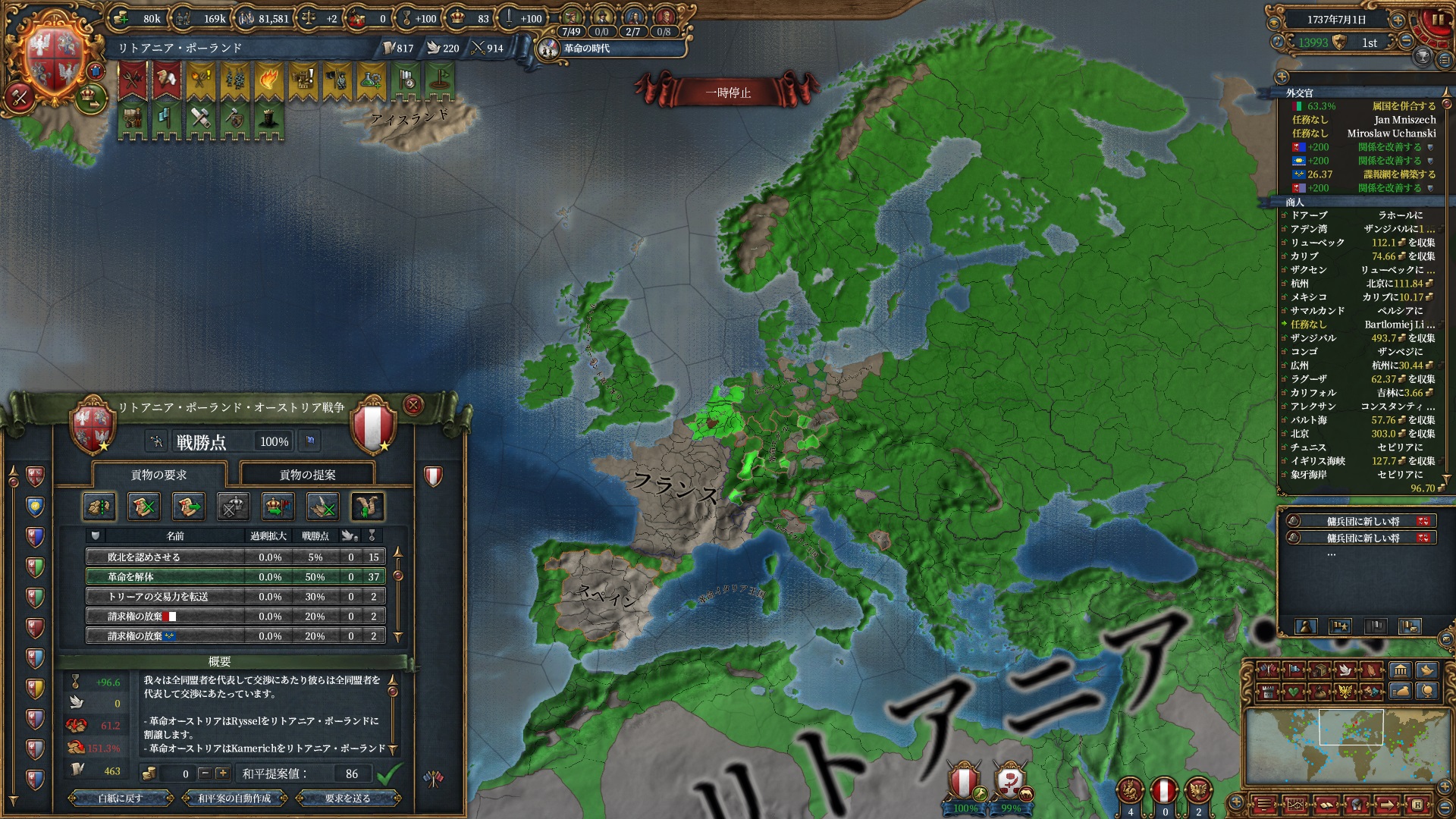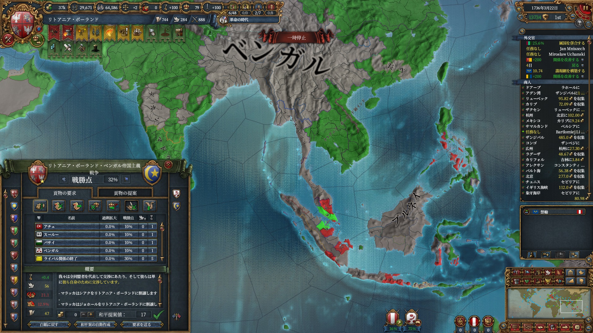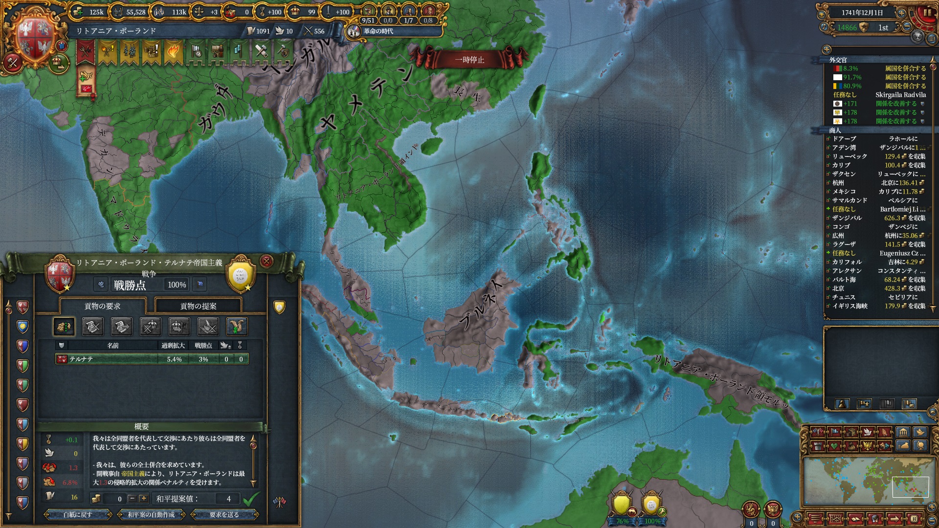 ゲーム後半はリトアニア=ポーランドNI・権勢アイデア・権勢統治ポリシーが合わさり属国併合コストは-60%に達します(特権込みで65%)。