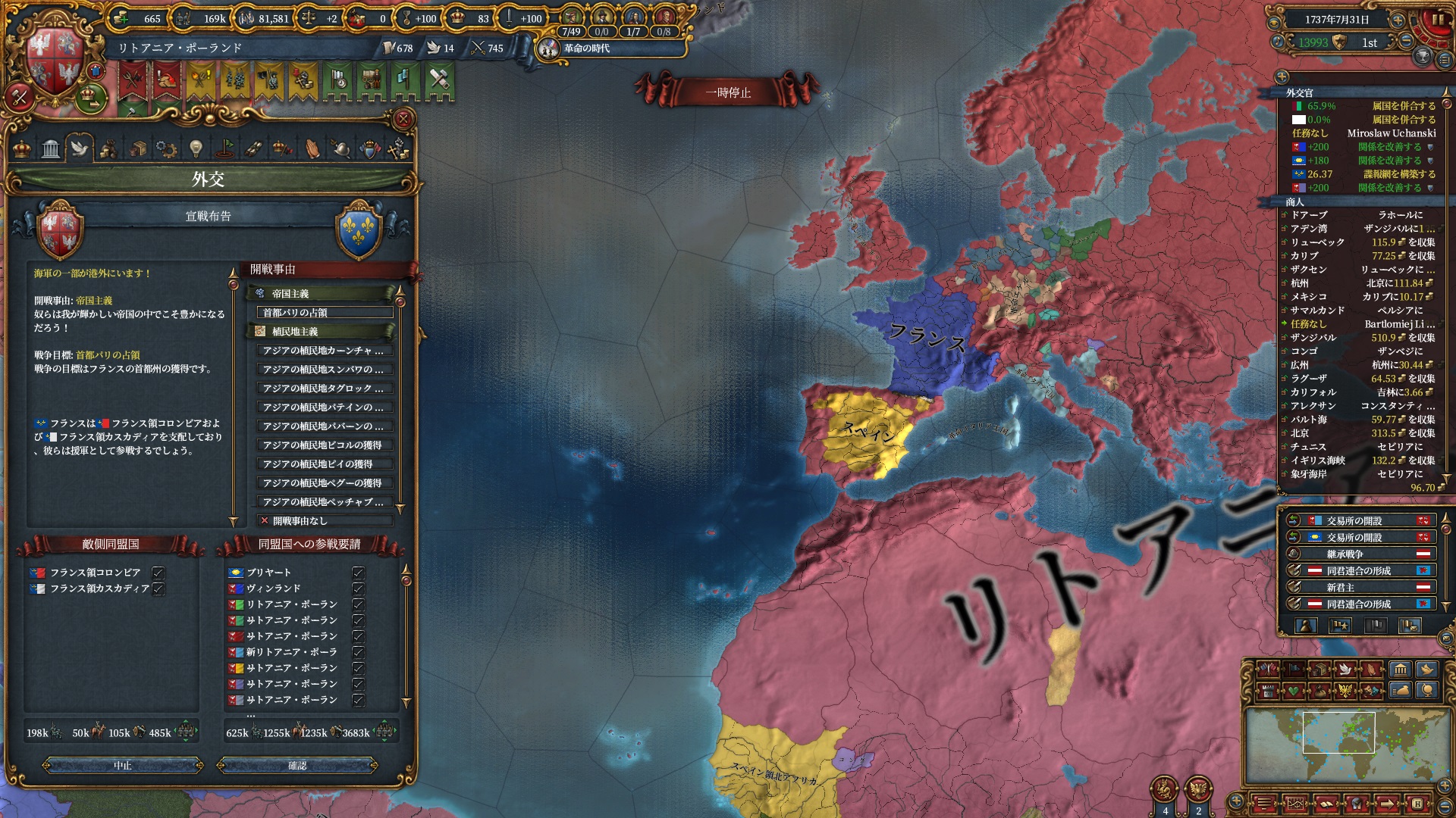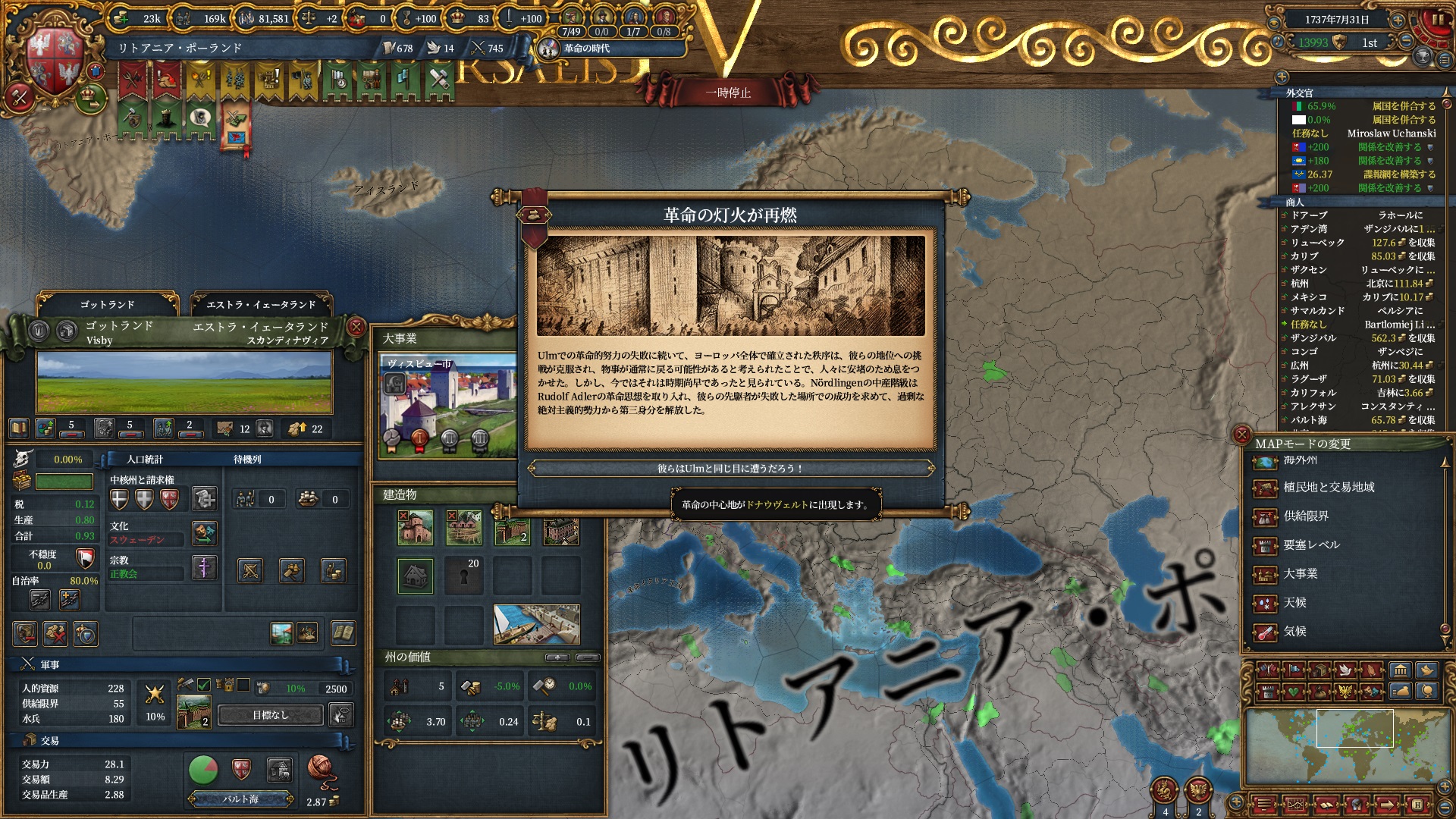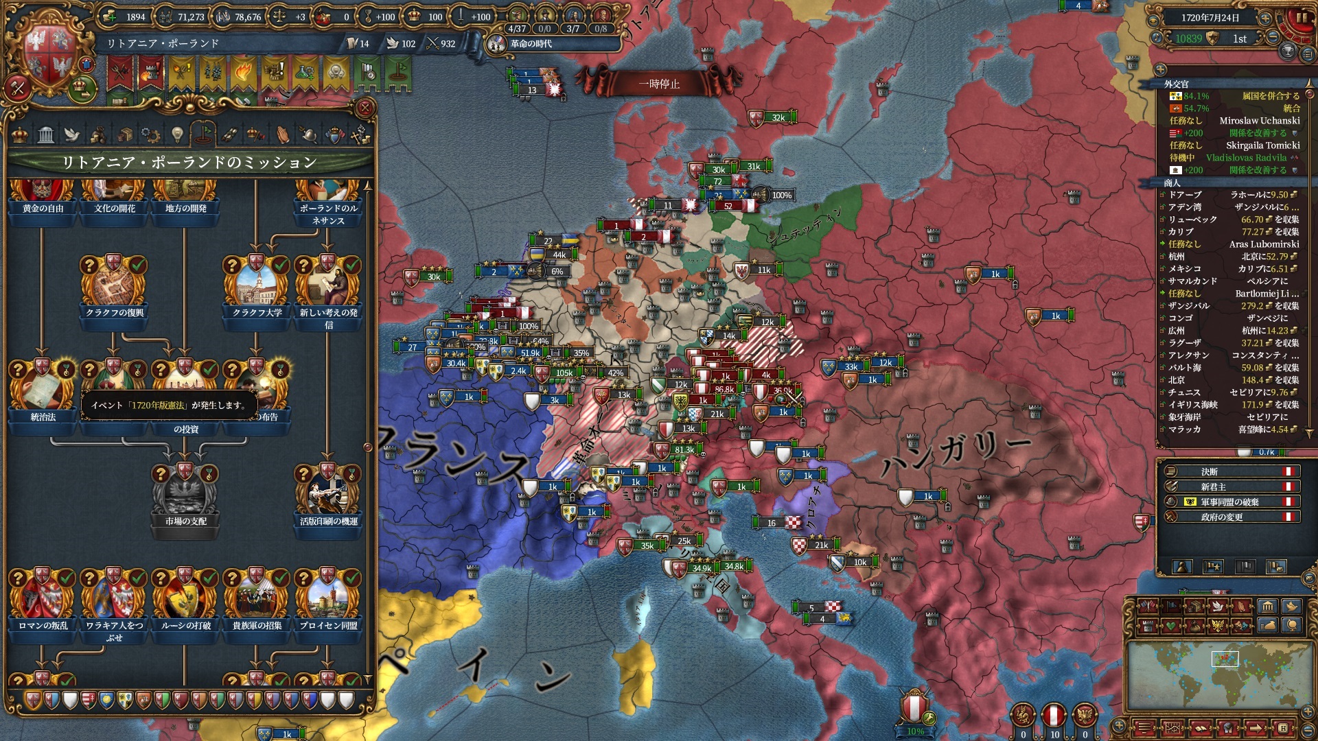 ただアイデア由来の反乱軍イベントが妙に多彩(農民反乱x3、分権派x1)です。その分反乱軍が沸く頻度が多いかは分かりませんが、妙に印象に残っています。