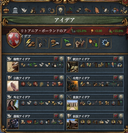 権勢→統治→宗教→攻勢→外交→貴族→諜報→拡張