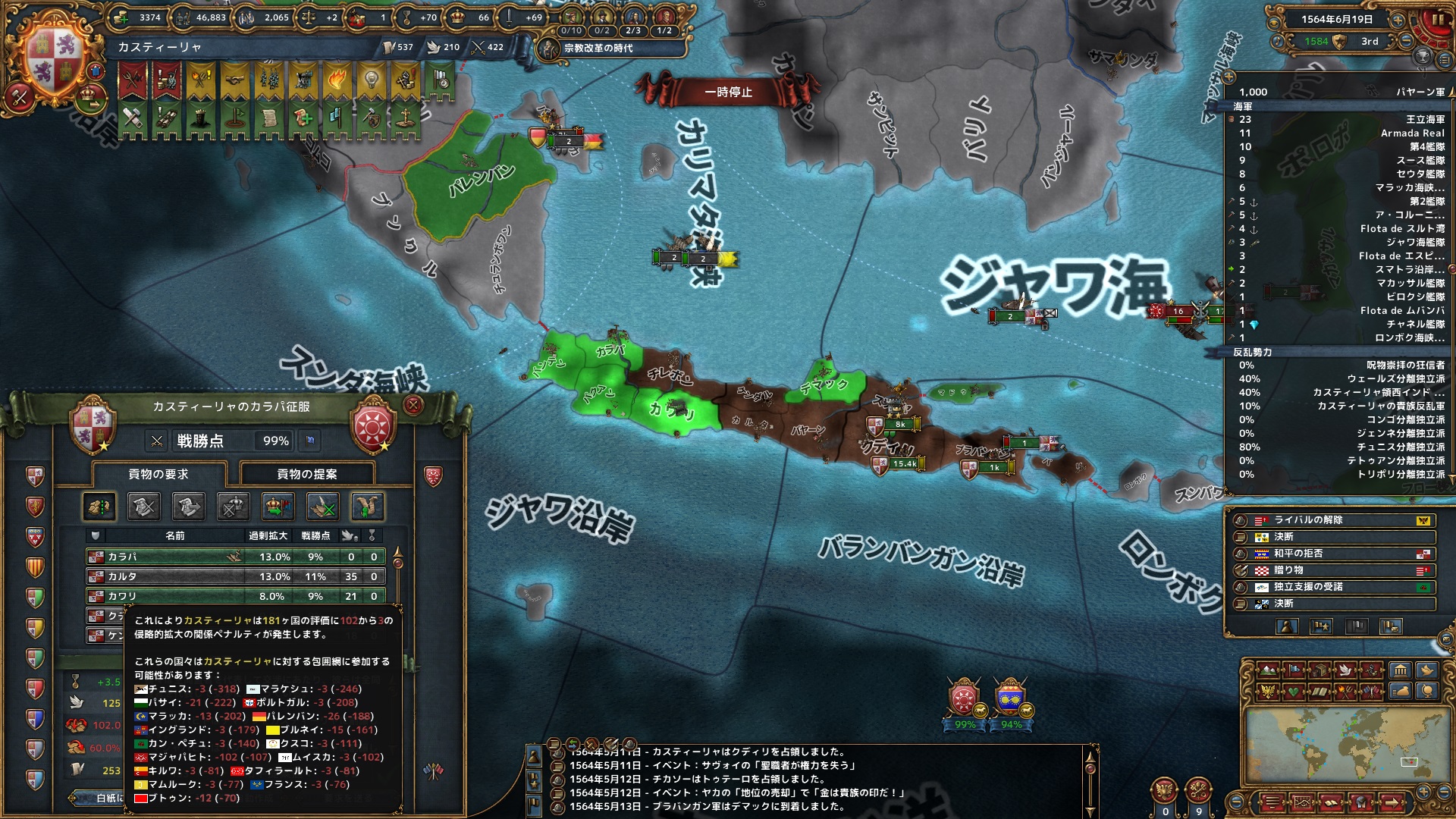 計8州を奪って停戦。Devの高いアレクサンドリアと周辺の州をアラゴンに取らせ、カスティリャは紅海沿岸とペルシャ湾に支配地を獲得した。