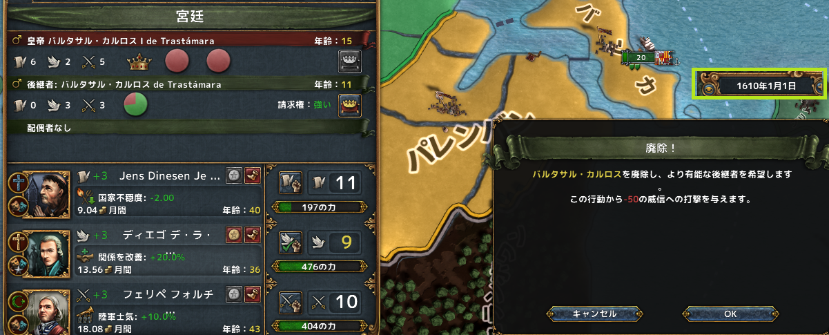 11歳の後継者(弟だろうか)もバルタサル・カルロス、とどういうわけか完全に同じ名前だ。(0/3/3)は即廃嫡に決めた。