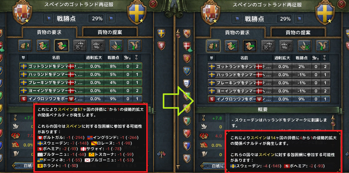 影響によりAE超過する国の数は、中核州の返還の場合には11か国にのぼるのに対し、デンマークによる占領→割譲の方法では交戦相手の2か国だけで済むので、後者を選択している。どちらの場合にもデンマーク領になる結果であれば、再征服CBによるAE-75%が適用になることは変わらない。