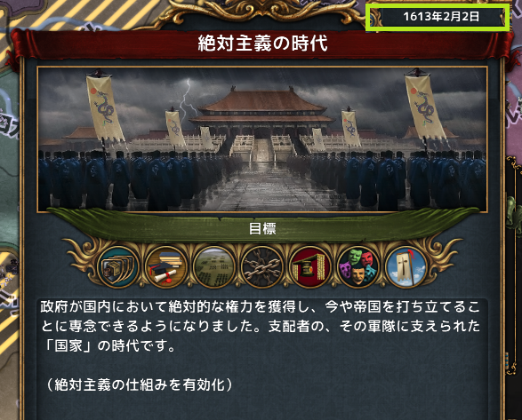 1月 権勢アイデアをコンプして、併合コスト割引と外交関係枠+1の政策を設定した。