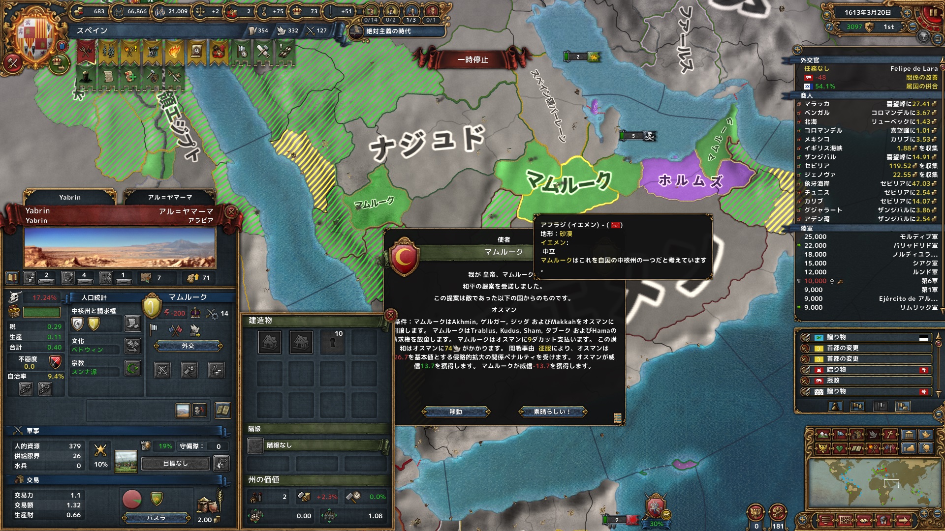 城塞や次の布石を狙いつつ7州を獲得している。マムルークから独立させたナジュドが属国に落ちていたので解放させる。