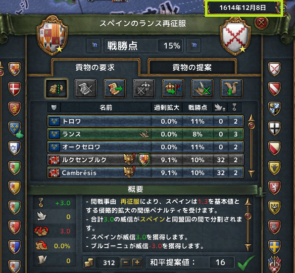 12月 どうも分がよろしくなく、長引くのもイヤなので、今回もランス1州のみをフランスに奪還して停戦とする。