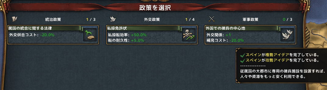 属国2つの統合と割引ポリシー獲得のための外交点が足りなくなりそうだったので。顧問の昇格とかいろいろ手段を講じたが、外交枠の超過分も空けることにした。