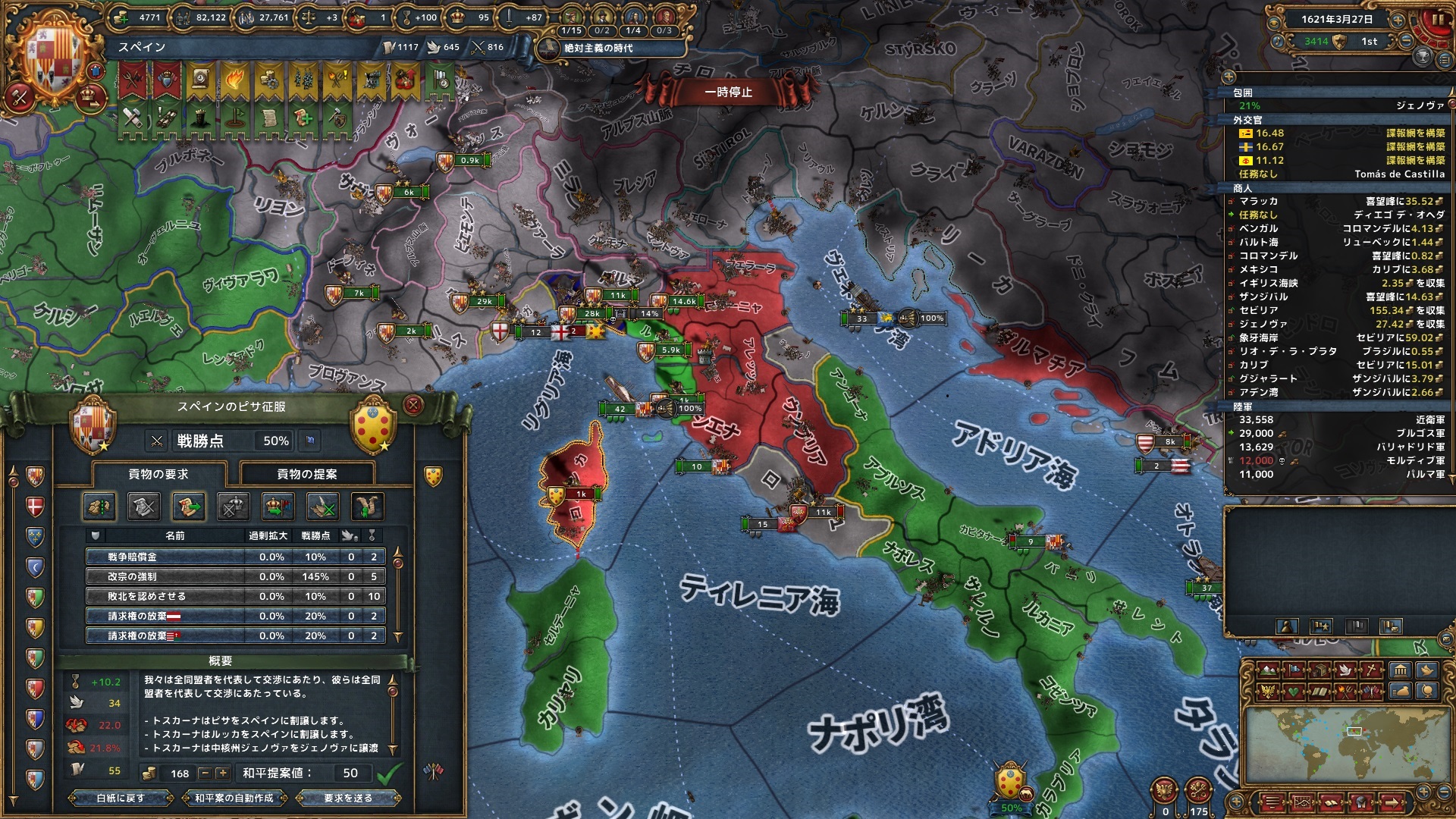 3月 トスカーナから2州を獲得。また、ジェノバから奪取していた中核州も元通りにしてもらう。