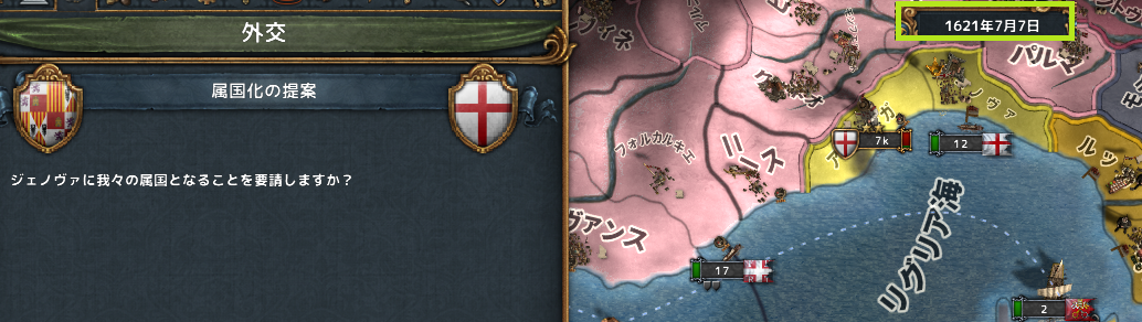タイミング的には、カラマンと合わせるためにはもっと前に併合開始しなければいけなかったのだが、うっかり忘れてブルゴーニュの宣戦ボタンを押してしまったので、併合開始できずにいた。