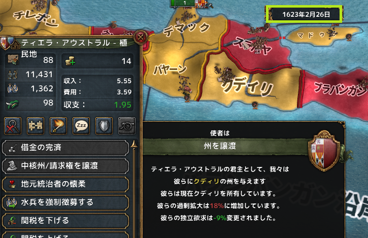 マジャパヒトから獲得した領土は、中核化せずにオーストラリア植民地に譲渡。こうすることで中核化するコストを払わずに自勢力下に置くことができる。