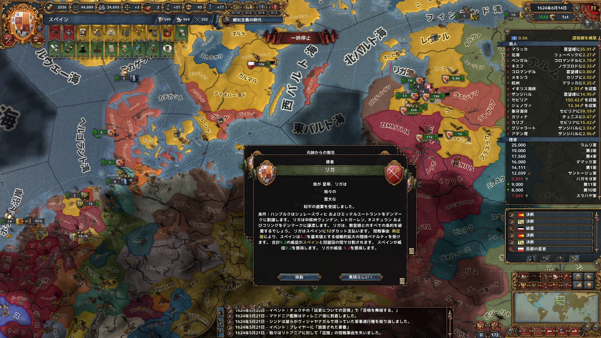 5月 リガへの援軍で参戦していたリトアニアと停戦。2州を獲得。