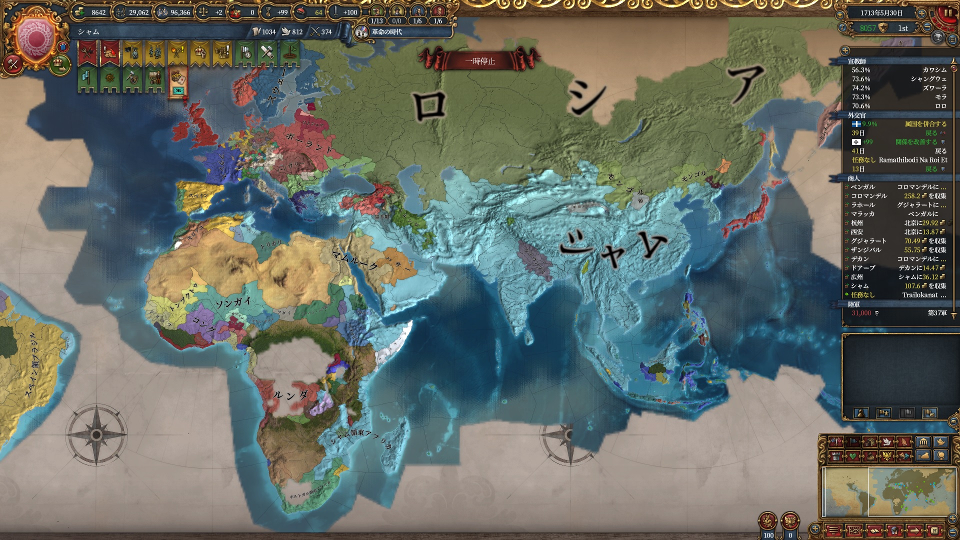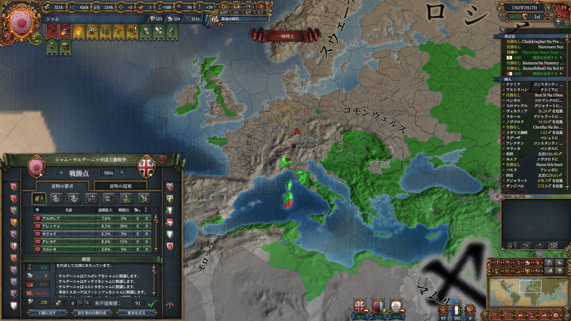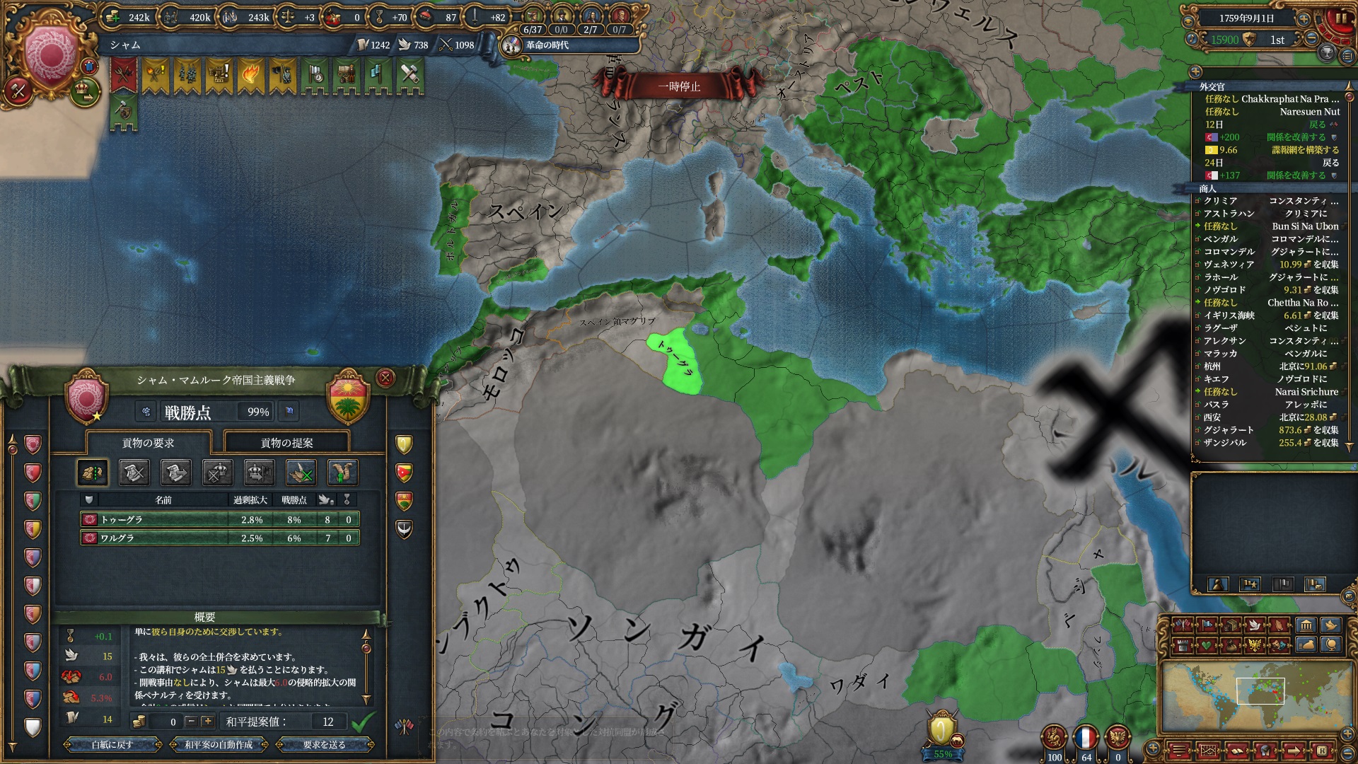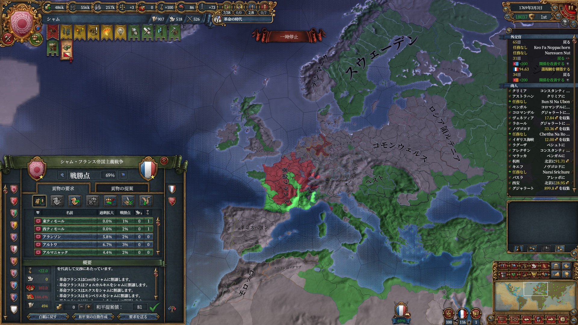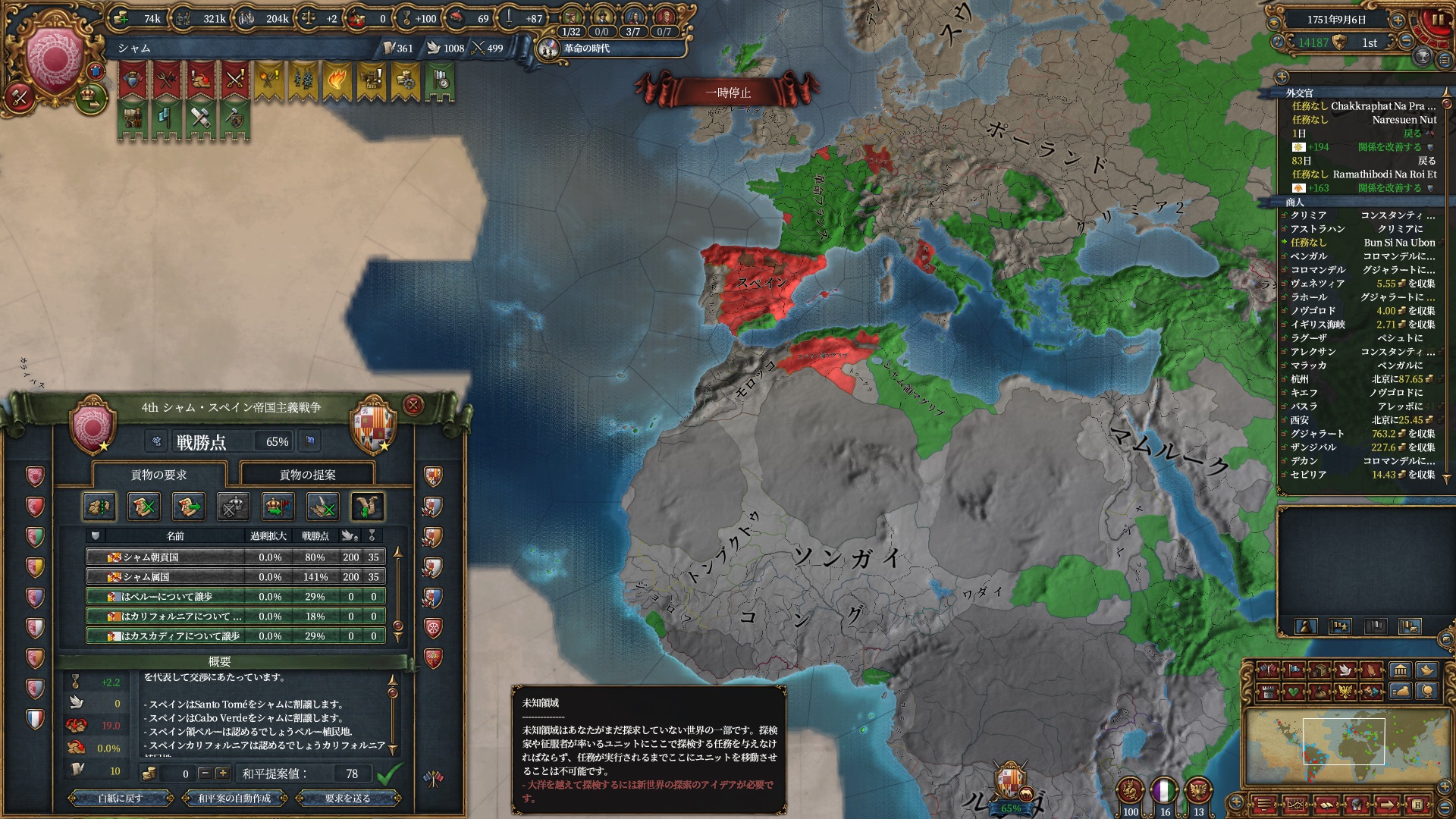 この一連の征服でフランス・スペイン・イギリス・ロシアが大きく弱体化したため、残り年数は少ないですが停戦破りをしないといけない程厳しいといった事は無さそうだと思います。