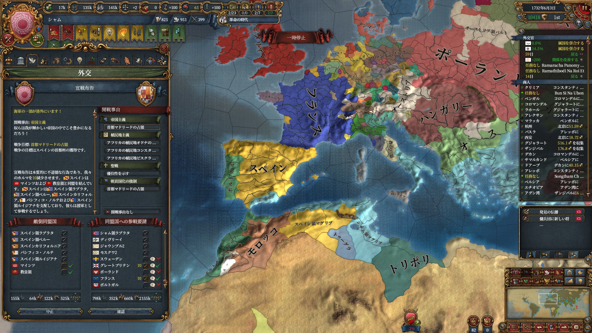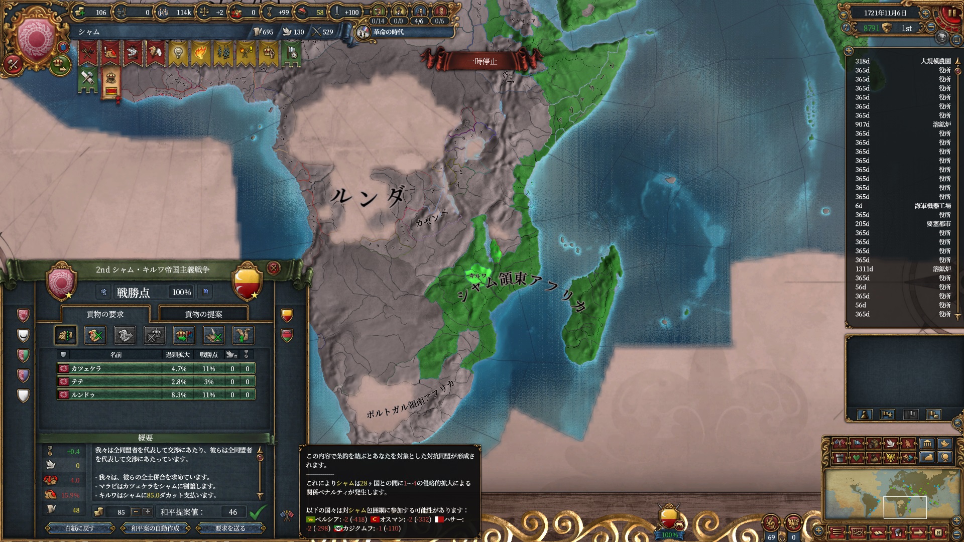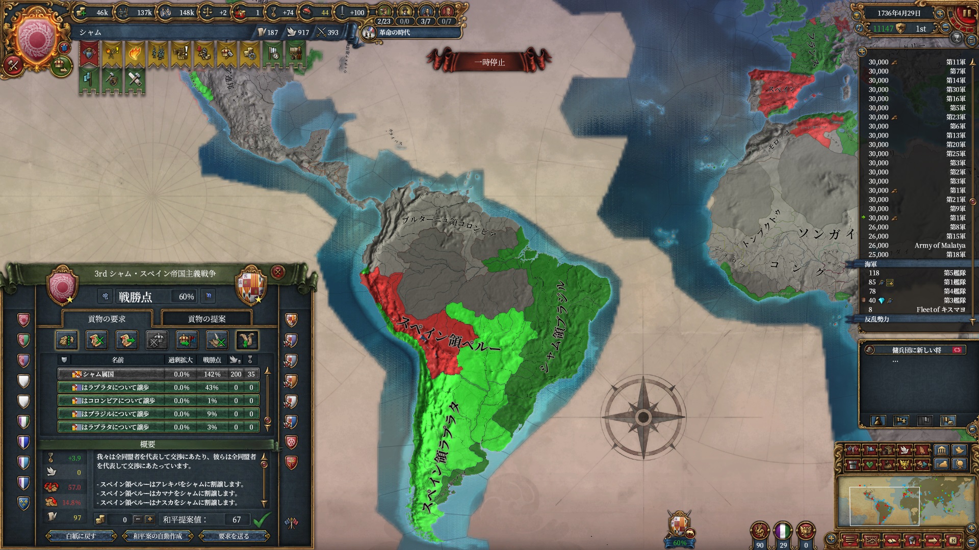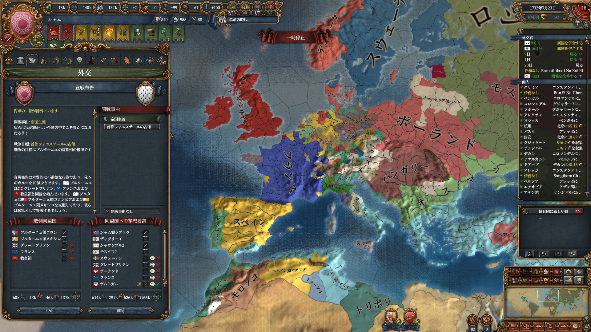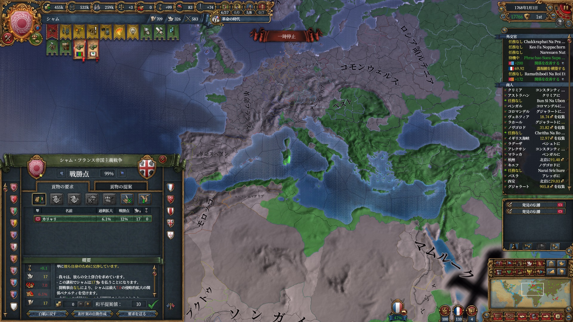 この一連の征服でフランス・スペイン・イギリス・ロシアが大きく弱体化したため、残り年数は少ないですが停戦破りをしないといけない程厳しいといった事は無さそうだと思います。