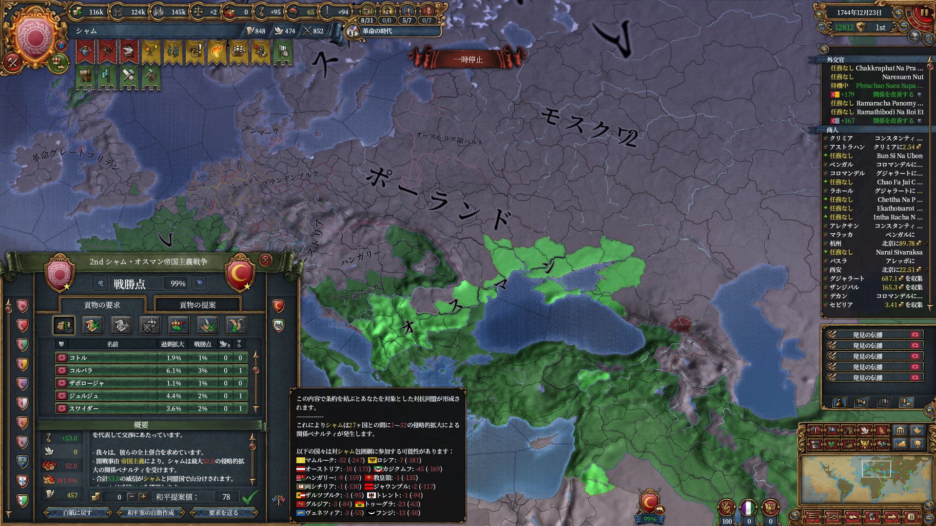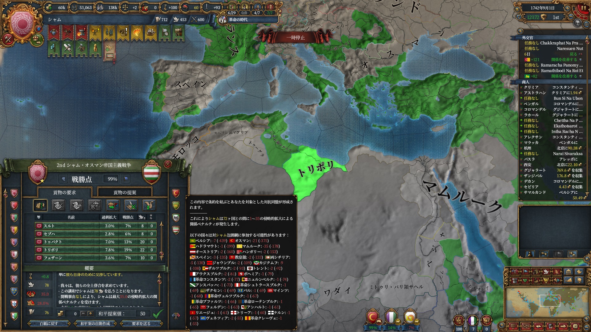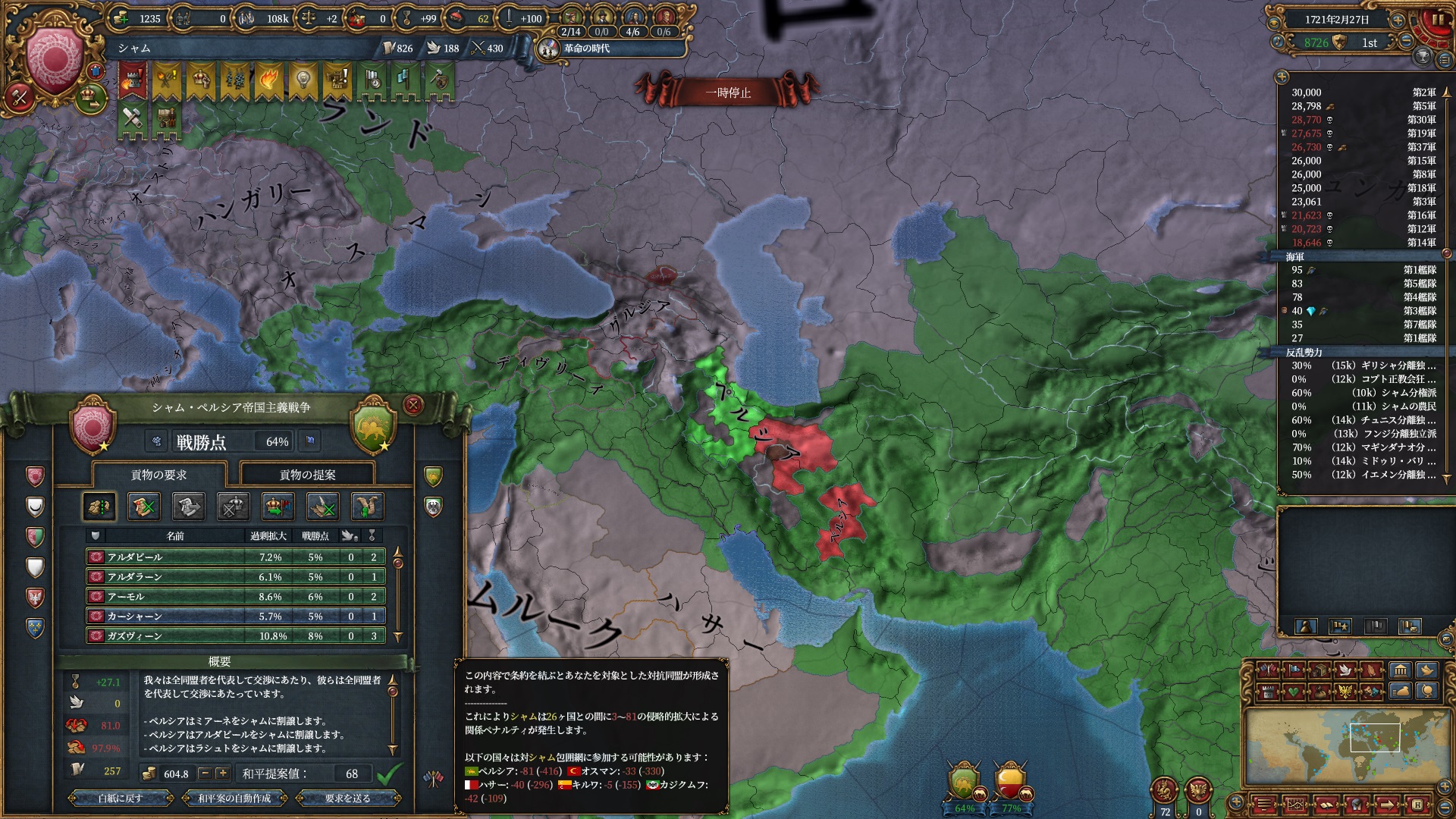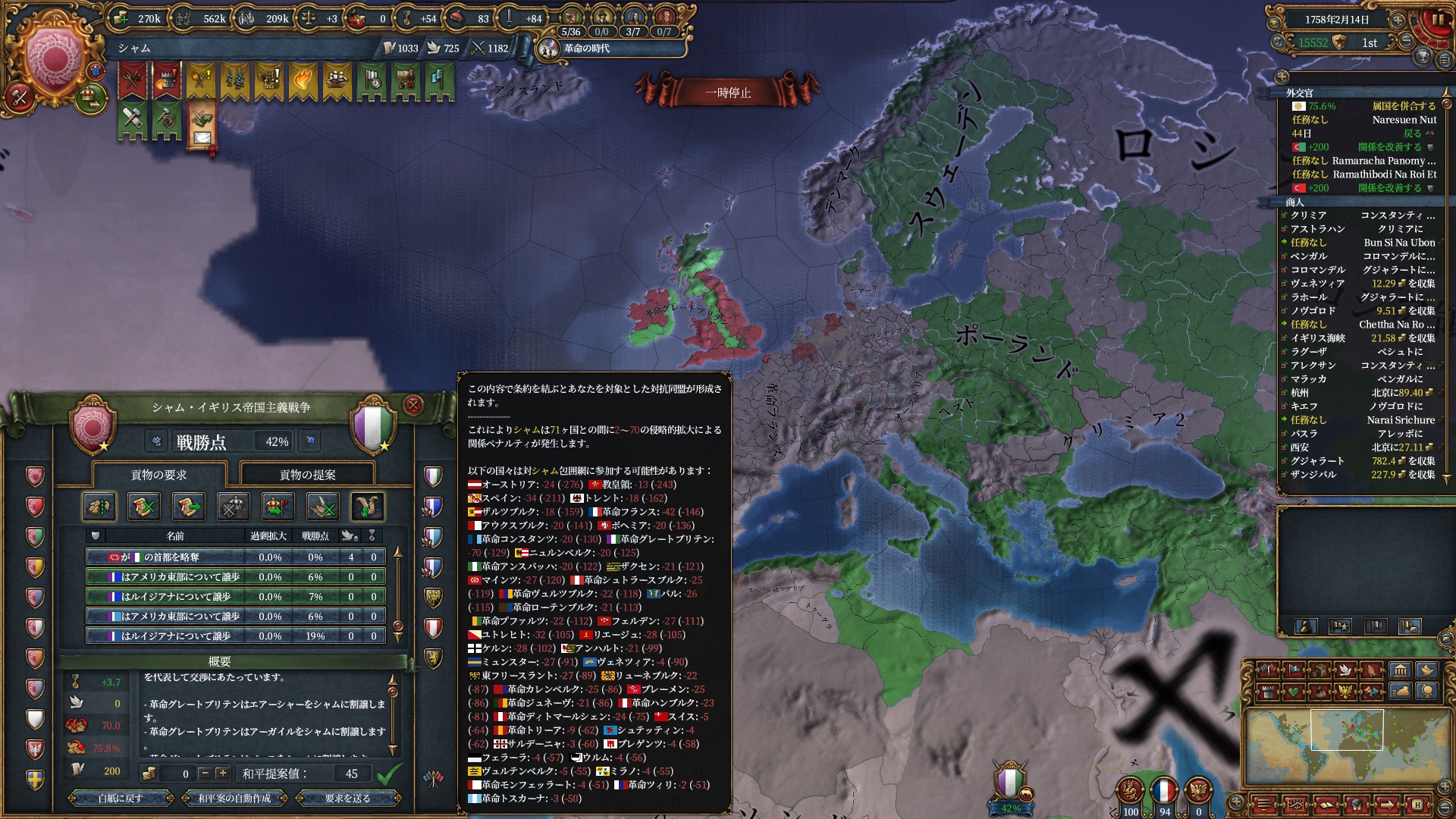 この一連の征服でフランス・スペイン・イギリス・ロシアが大きく弱体化したため、残り年数は少ないですが停戦破りをしないといけない程厳しいといった事は無さそうだと思います。