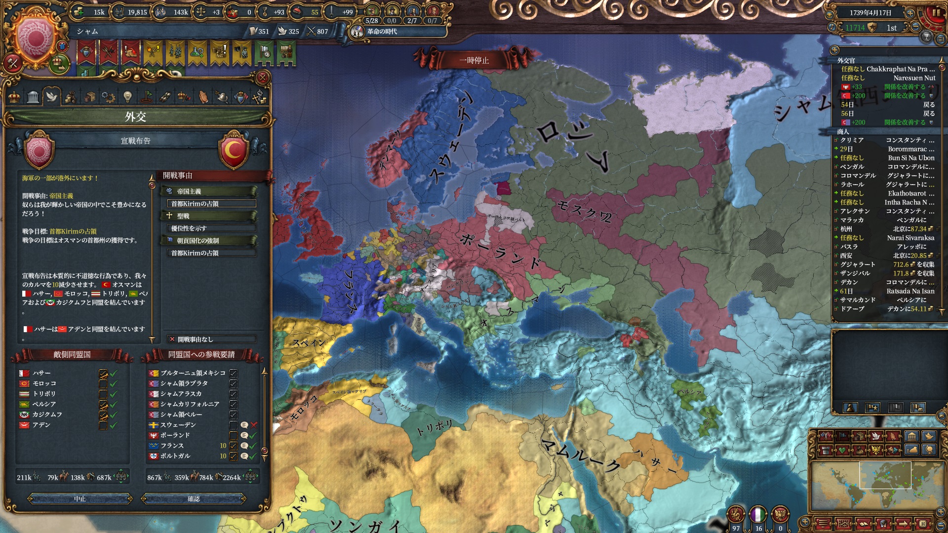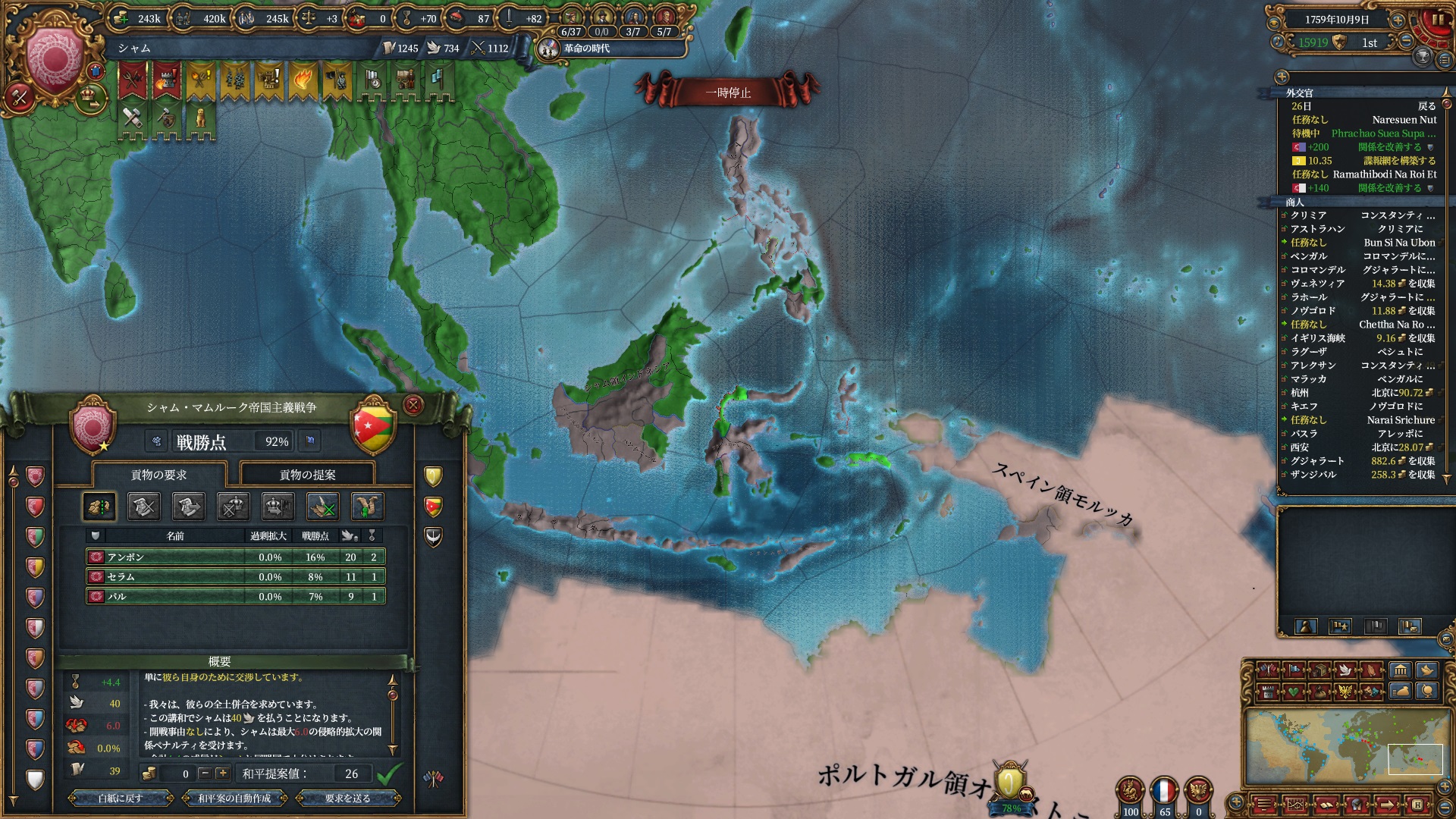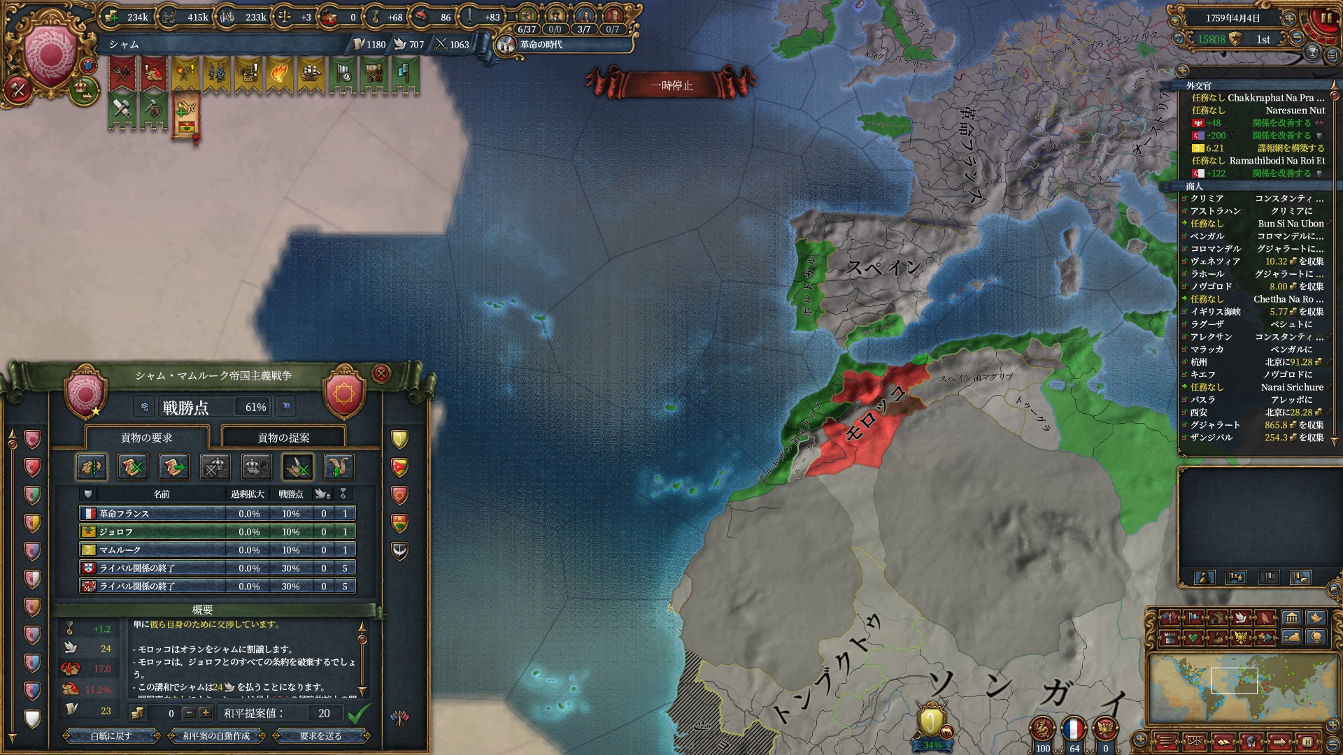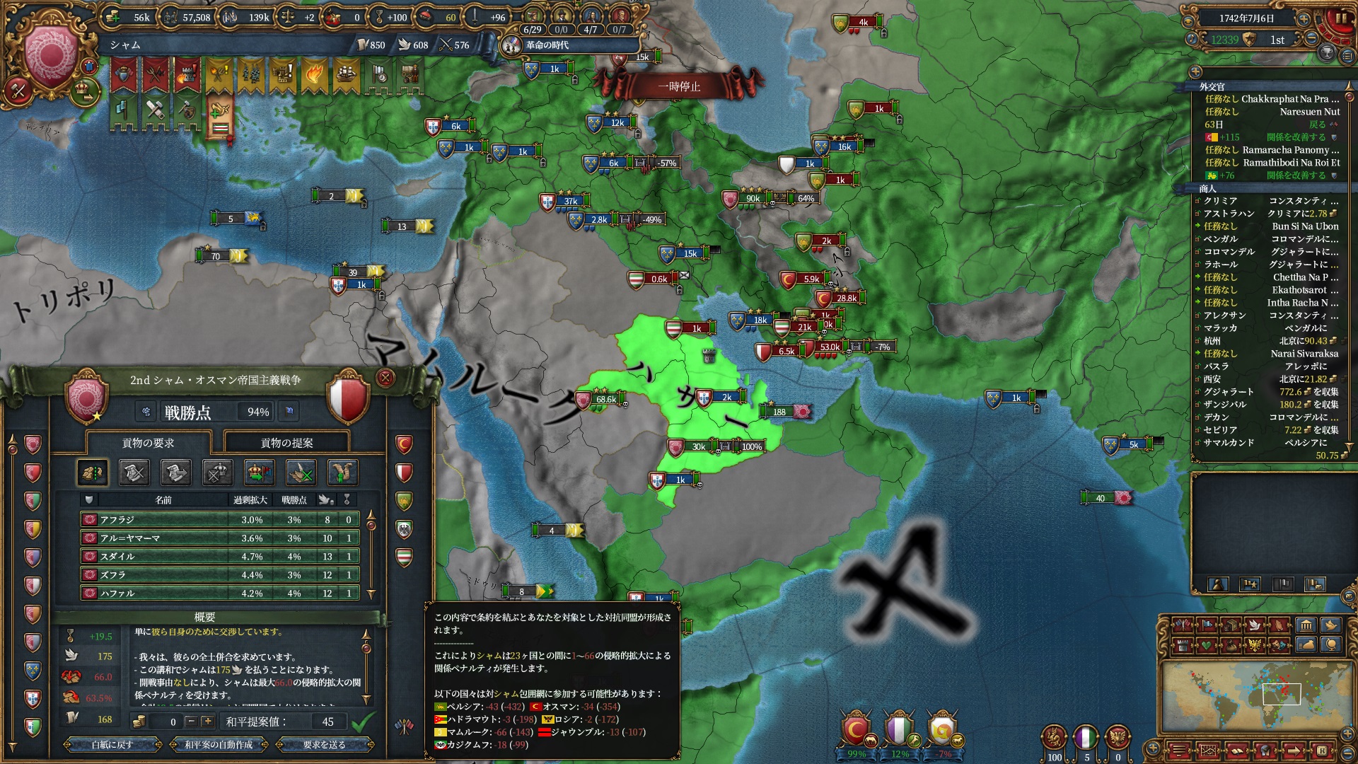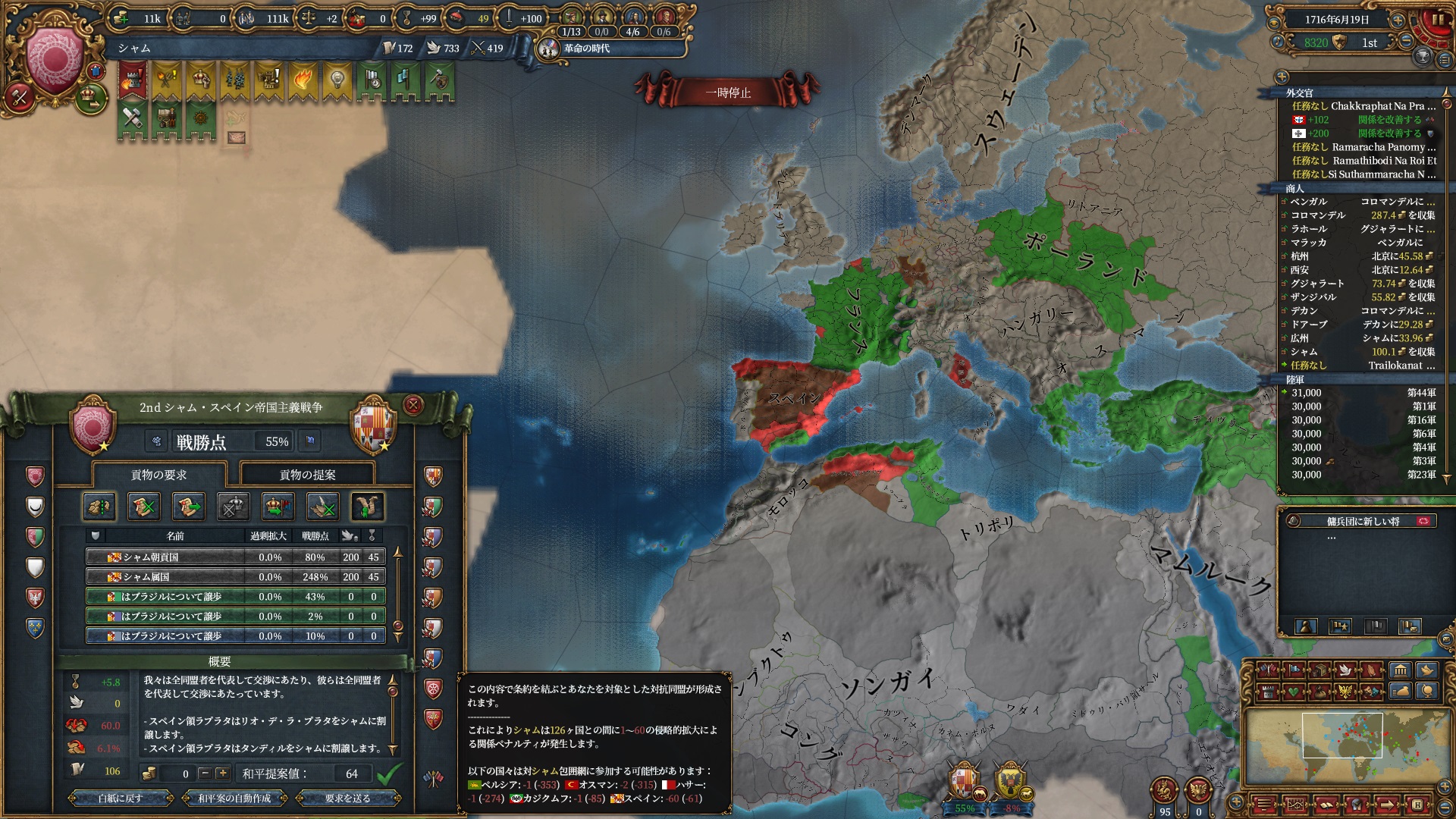 この一連の征服でフランス・スペイン・イギリス・ロシアが大きく弱体化したため、残り年数は少ないですが停戦破りをしないといけない程厳しいといった事は無さそうだと思います。