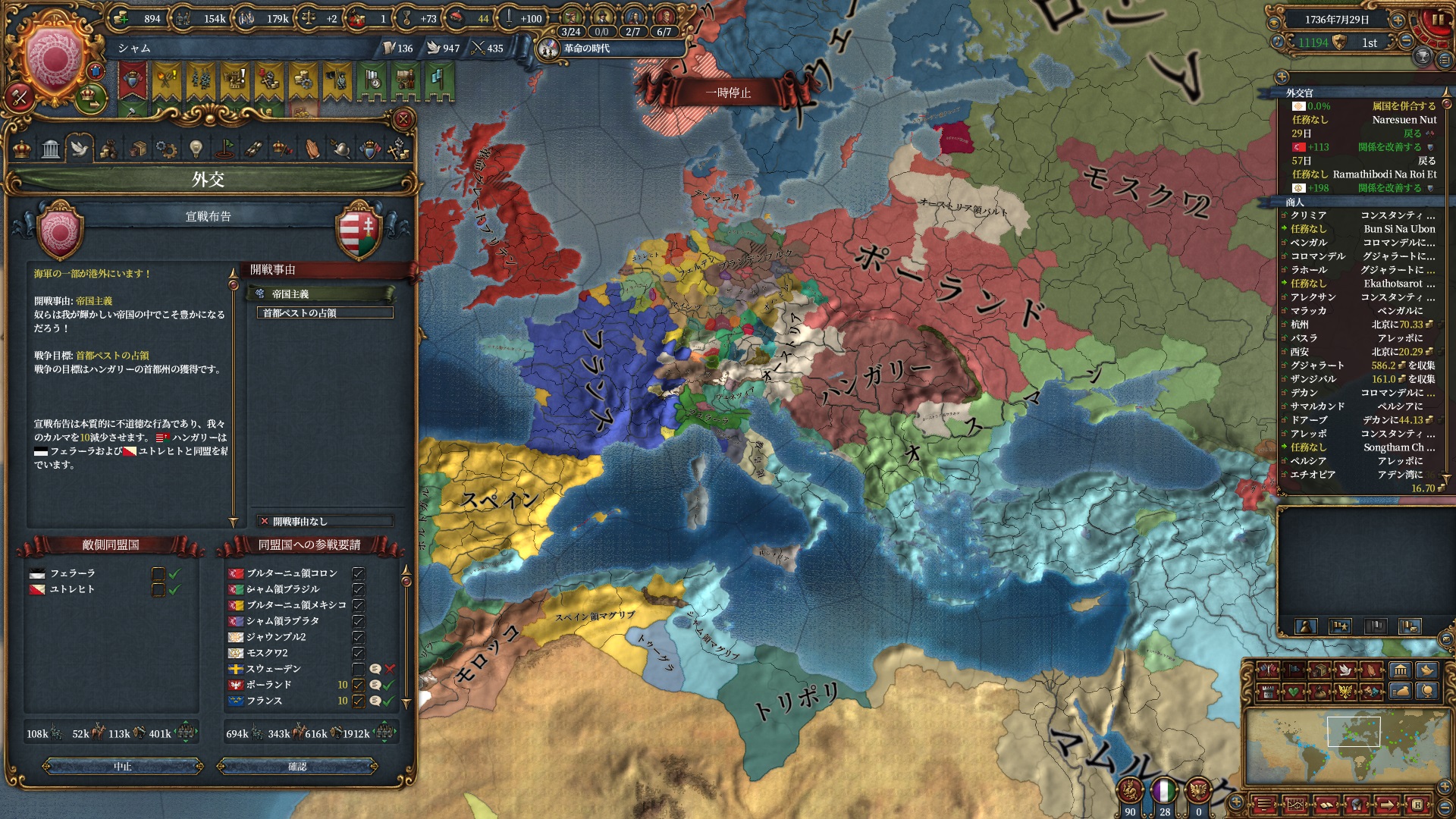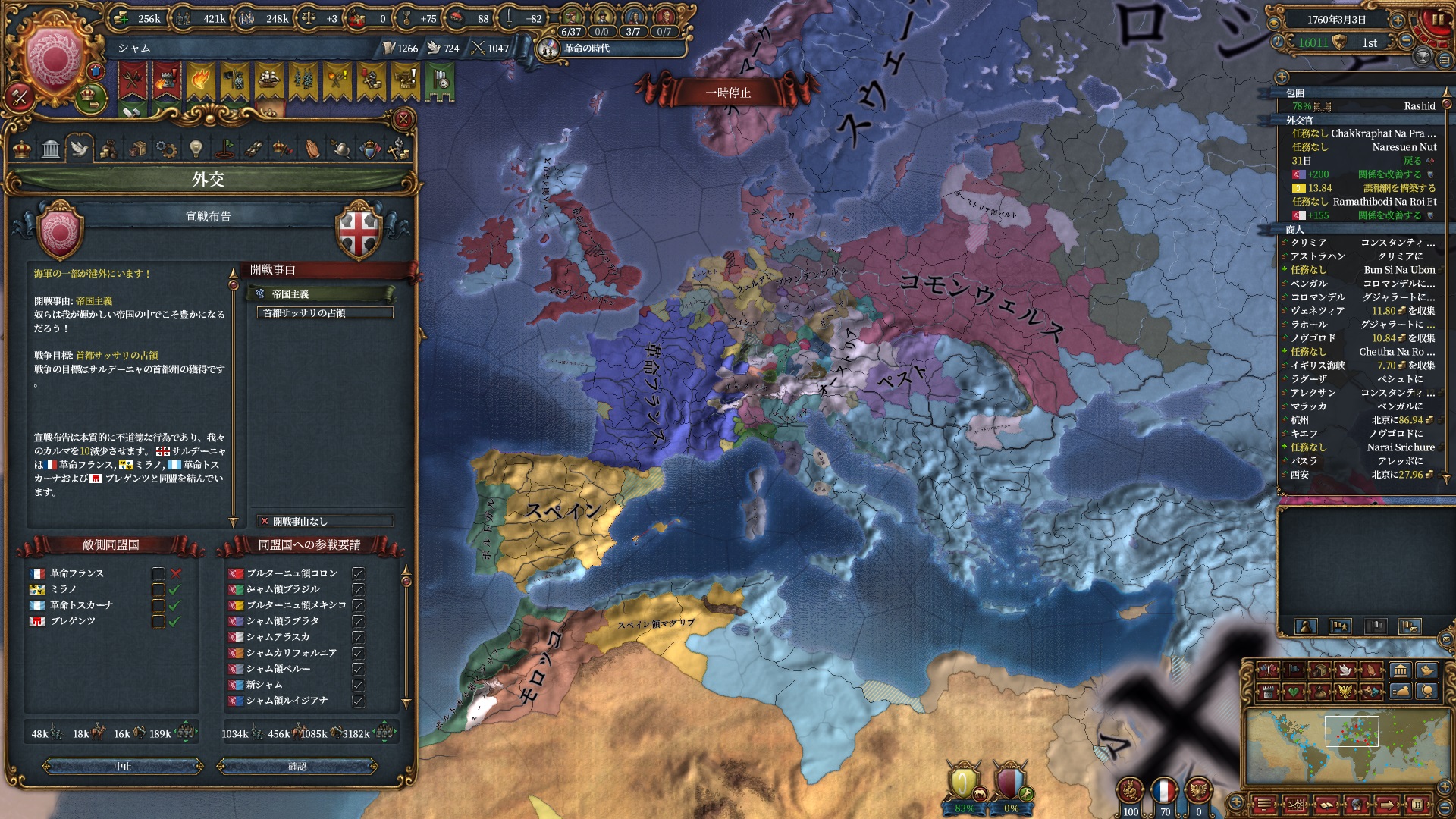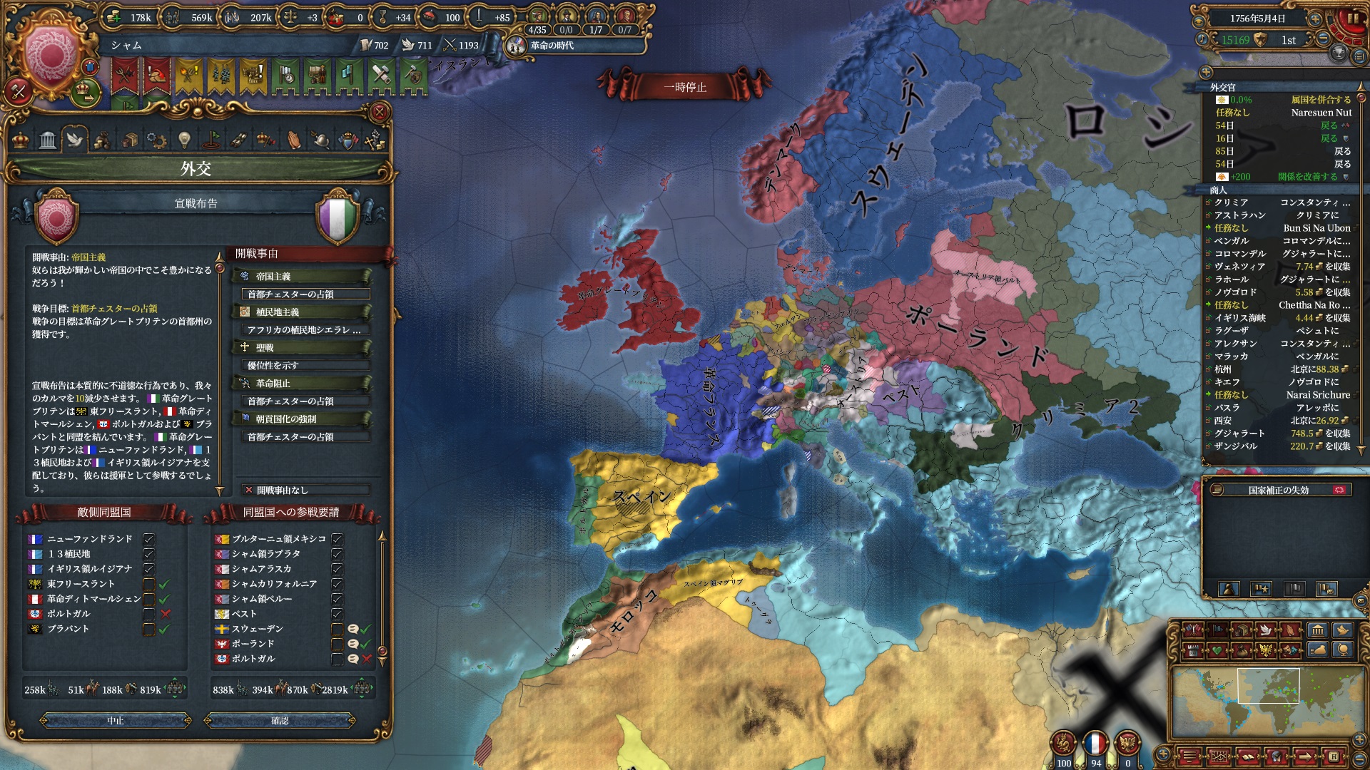 列強をしばいて回るのは勿論ですが、欧州側で衛星国が作れるエリアがあまり無いのでなるべく衛星国ラインを延ばせるように侵略したいところです。
