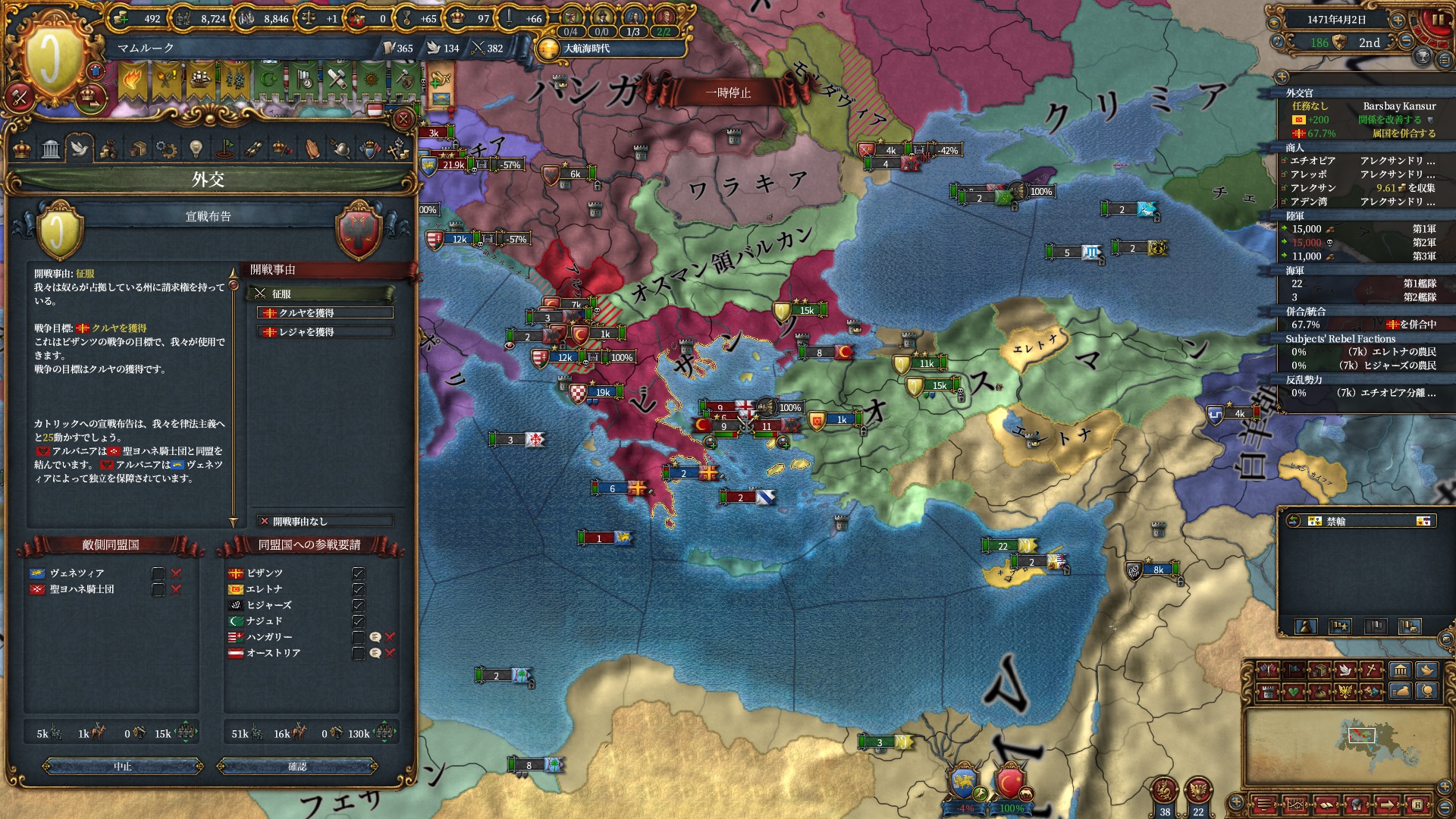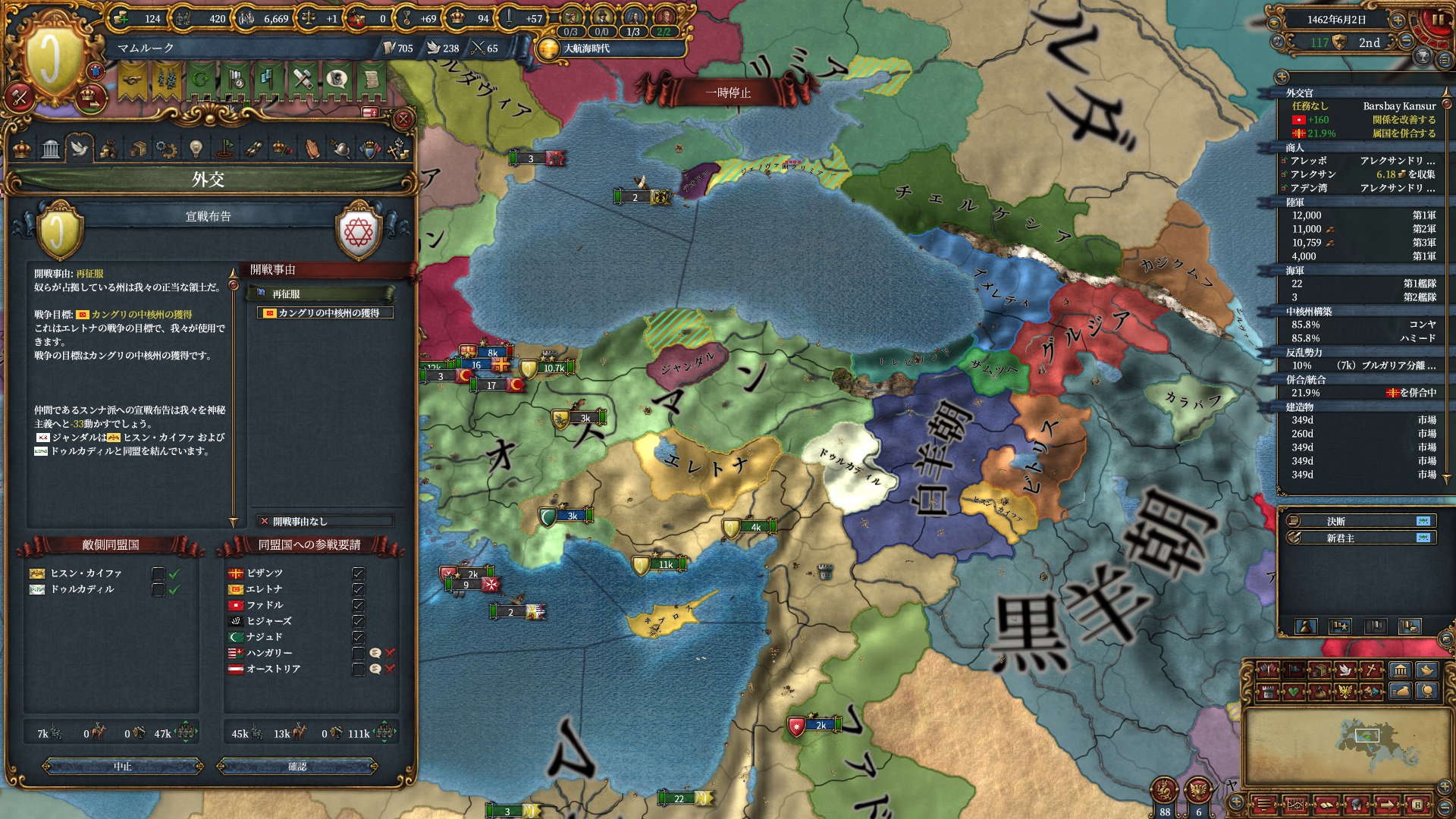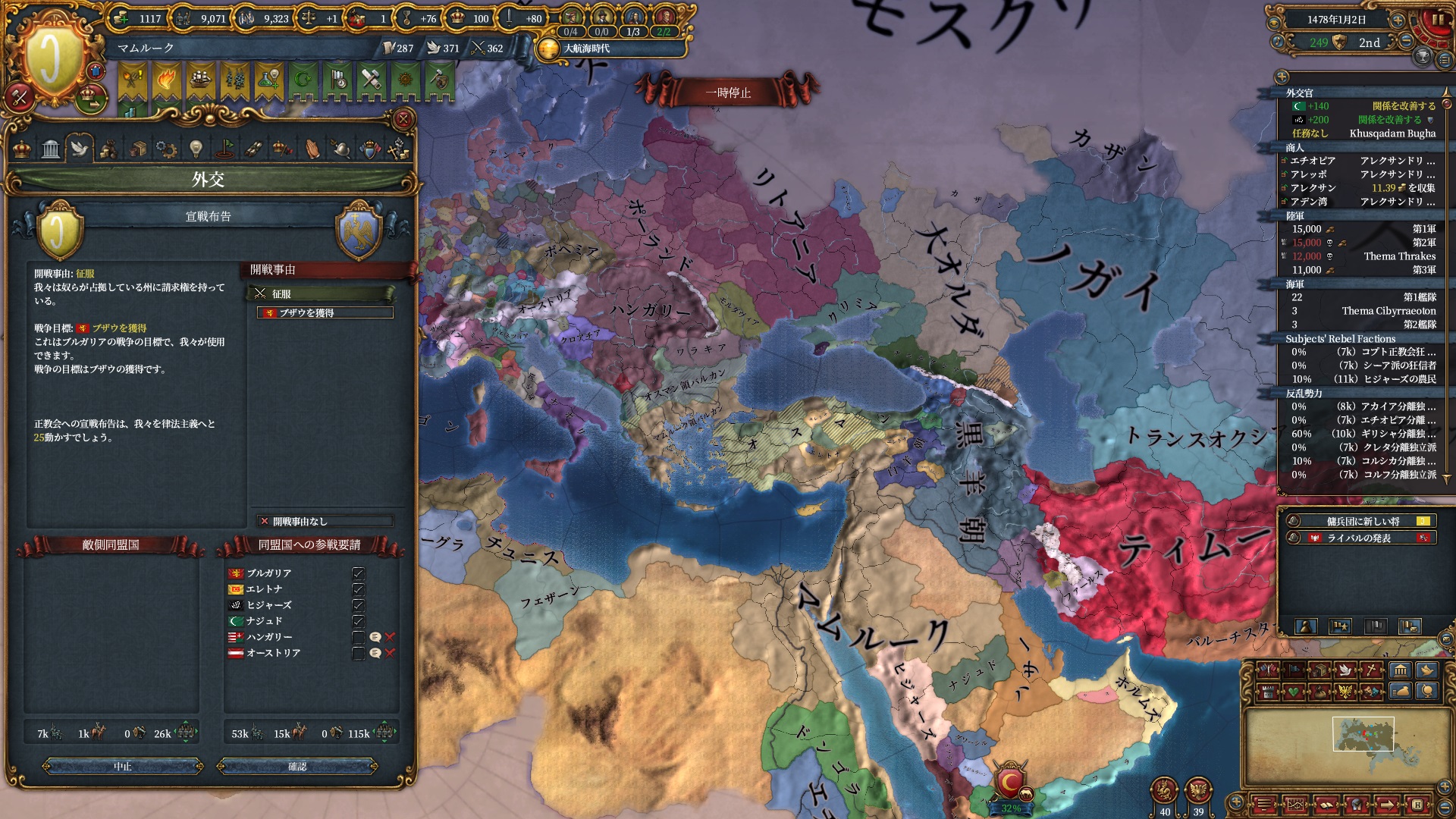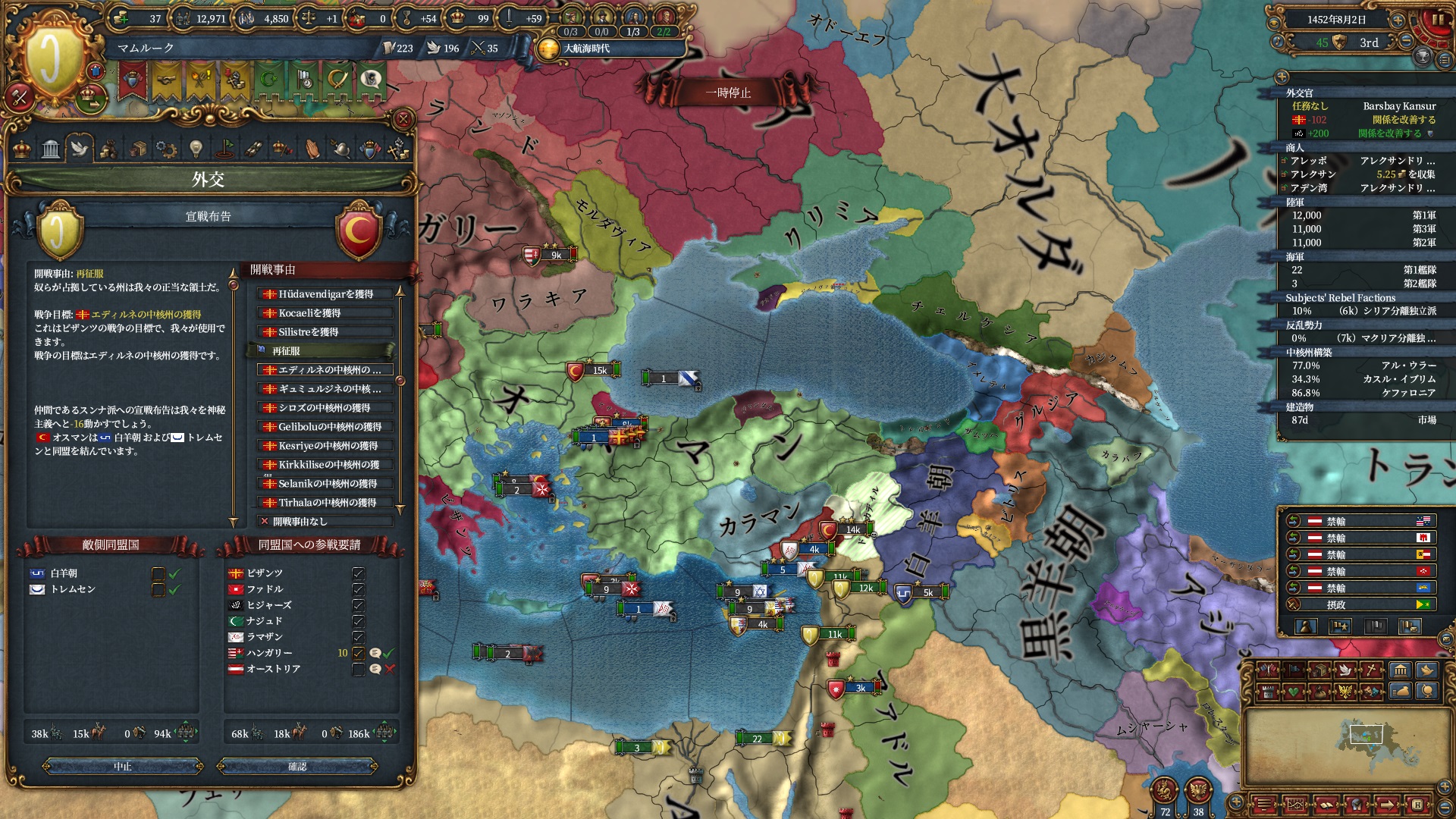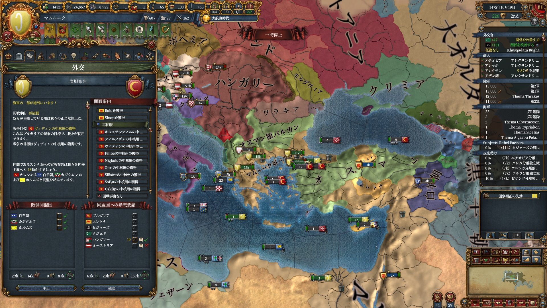 ブルガリアを属国解放しオスマン戦です。エレトナも既にいるため再征服対象は非常に豊富です。
