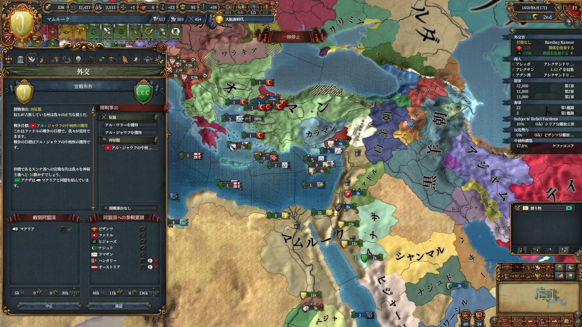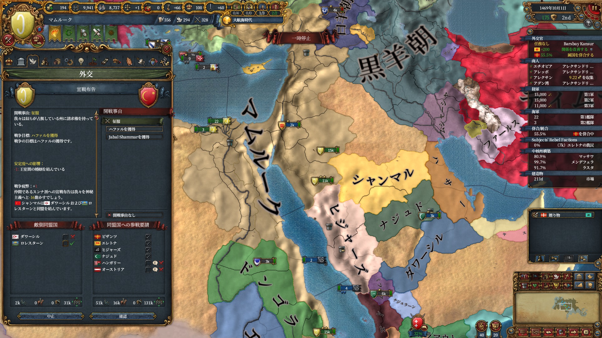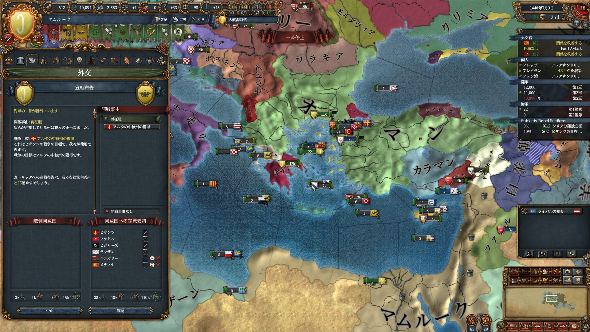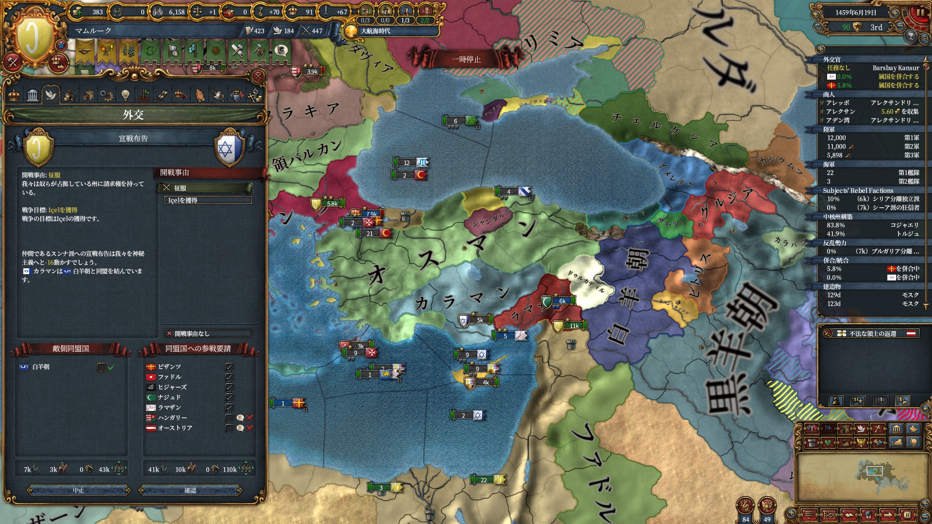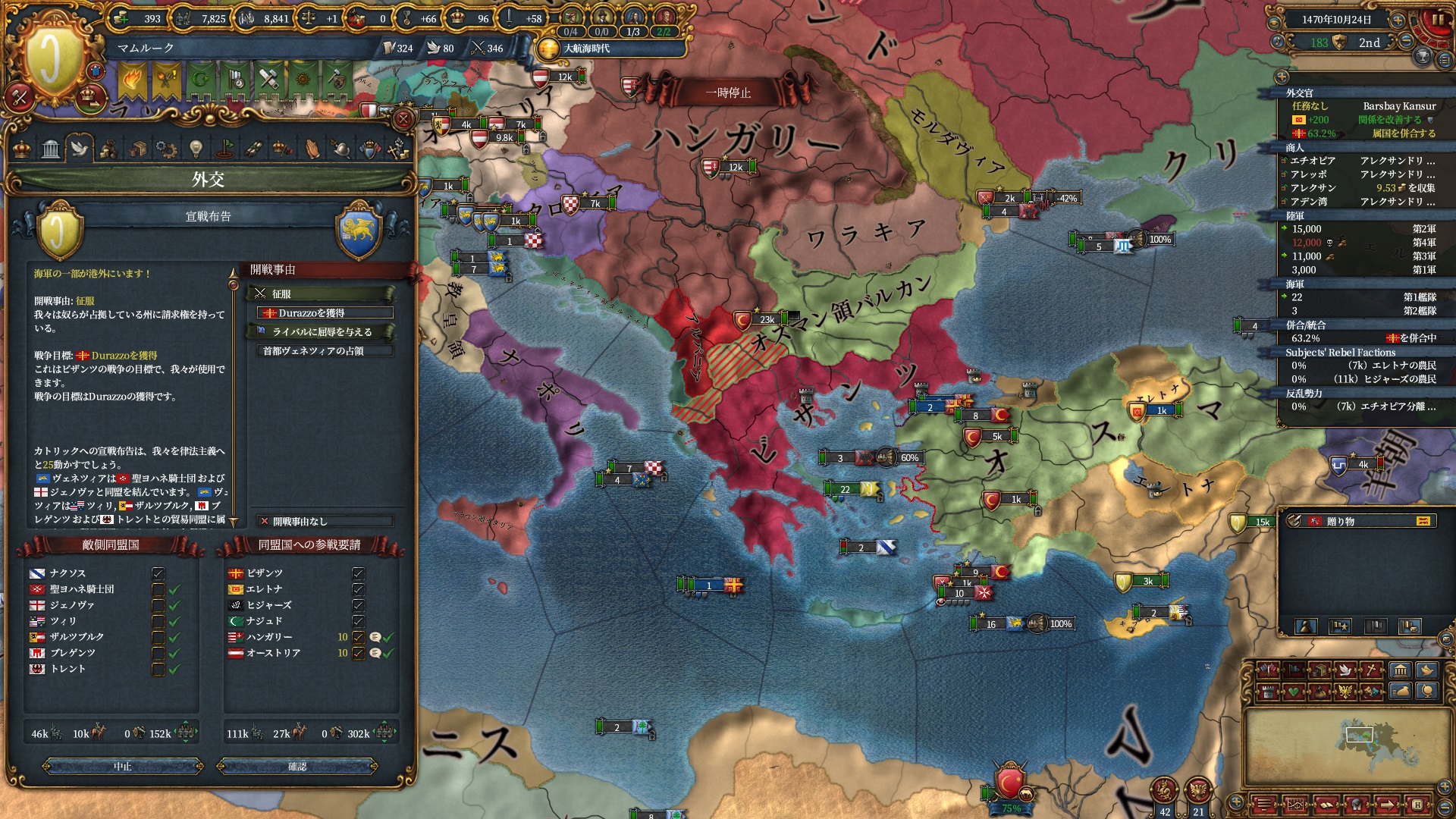 ブルガリアを属国解放しオスマン戦です。エレトナも既にいるため再征服対象は非常に豊富です。