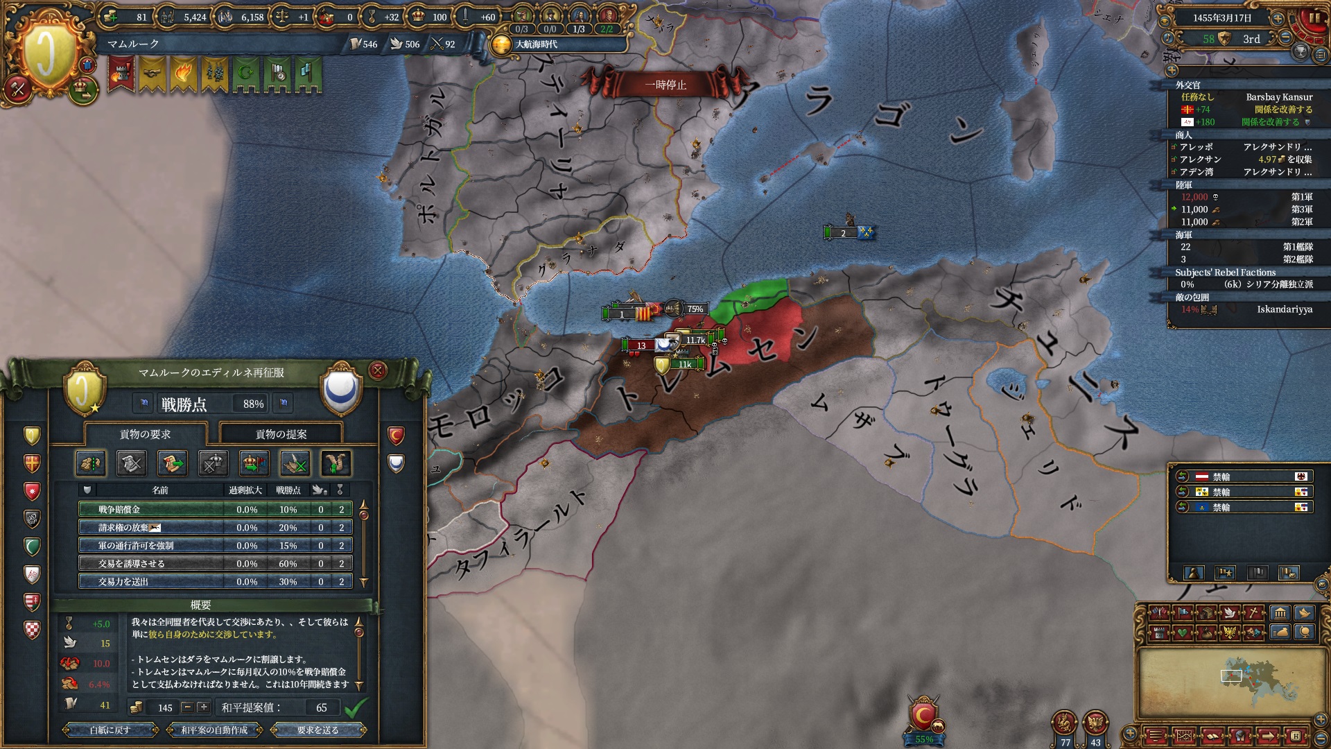 付いてきたトレムセンからは1州奪いスペイン・グラナダに近付き隙あらば仕掛けられるようにしておきます。