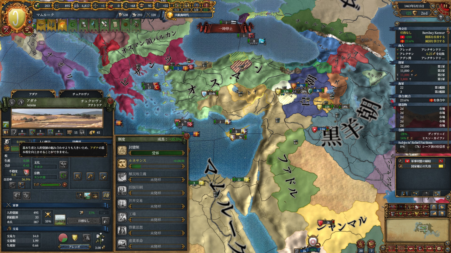 オスマンと異なりルネサンスを持ってくる手段に欠けているので、アダナをdevポチしルネサンス受容の地とします。