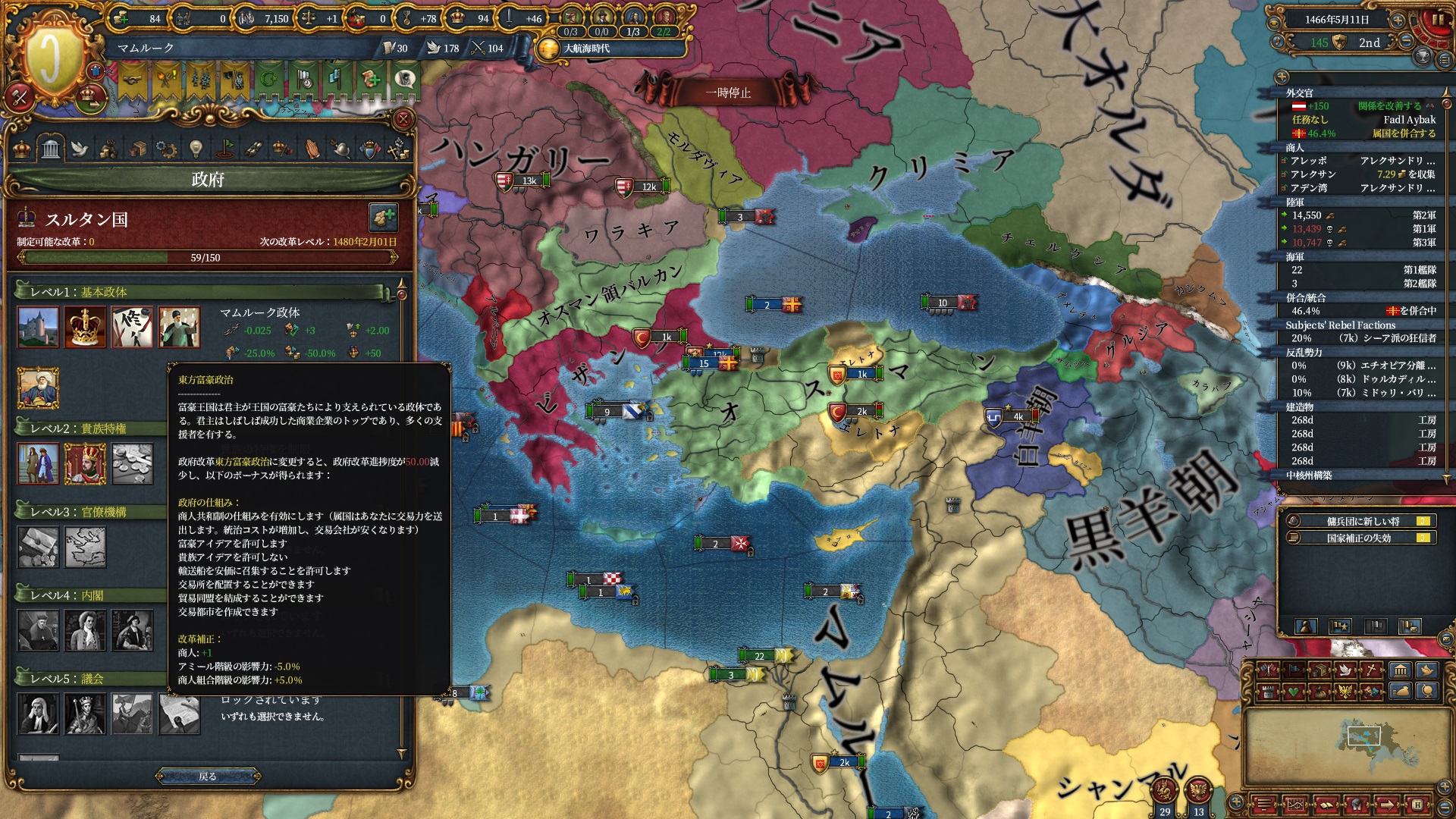 このゲームは一部の例外を除いて基本的に技術グループの変更が行えず、オスマン(アナトリア技術)はこの政府改革が使用できない為マムルーク→ルームのプレイスタイル観点としては大きな差別化要素ではあります。