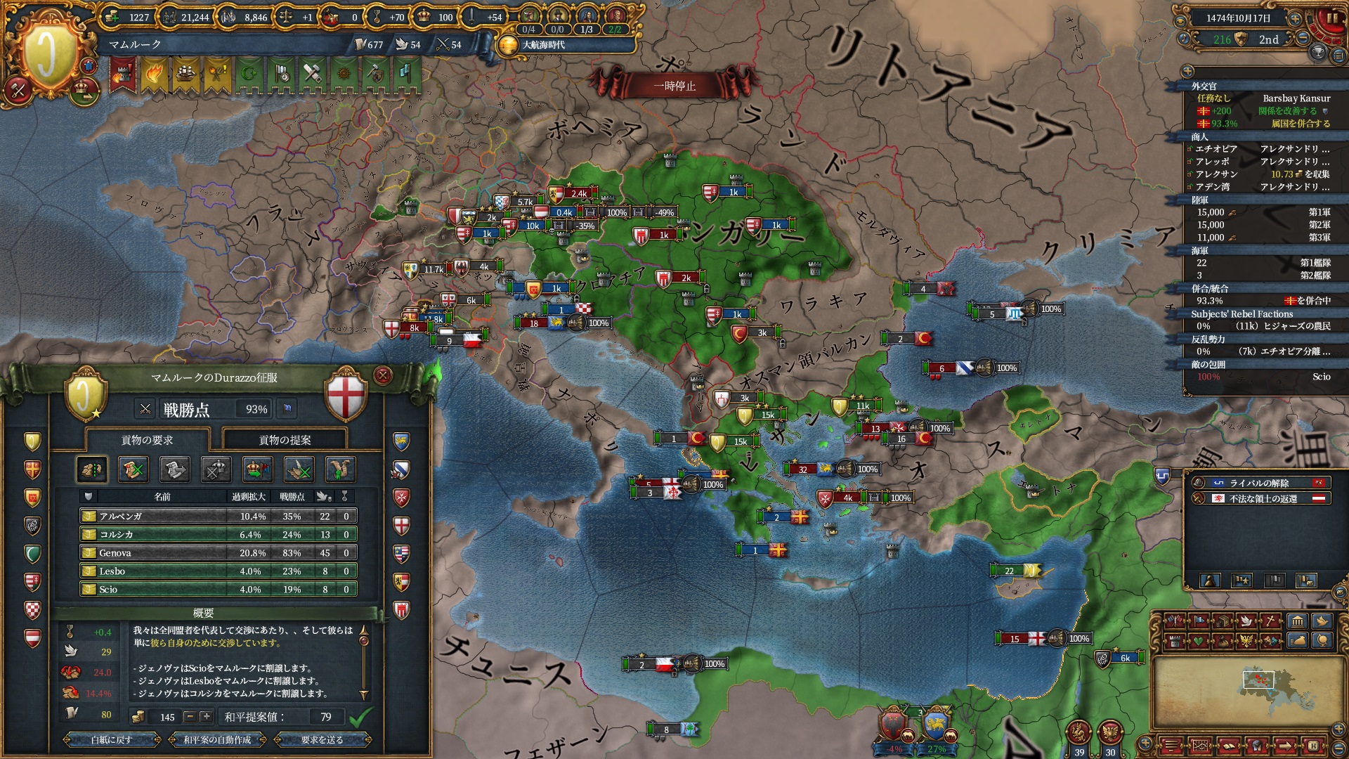 この辺りはイタリア諸国の飛び地なおかげで非共戦国から州を奪ってもヴェネツィア・ジェノヴァ・ロードスぐらいしか怒らないのはとても楽で、それでいてネグロポンテやクレタ島は要塞がなく戦勝点さえあれば取れるいうのも良いですね。