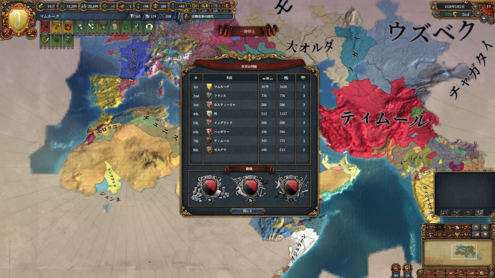 一応ティムールはまだインド側にそれなりの国力を持つ土地が残っていますがデリー(元ジャウンプル)のコアが大量に埋まっている場所でもあり、このあと向こうでは一悶着あったようでまともな会戦としてはこれが最後になります。