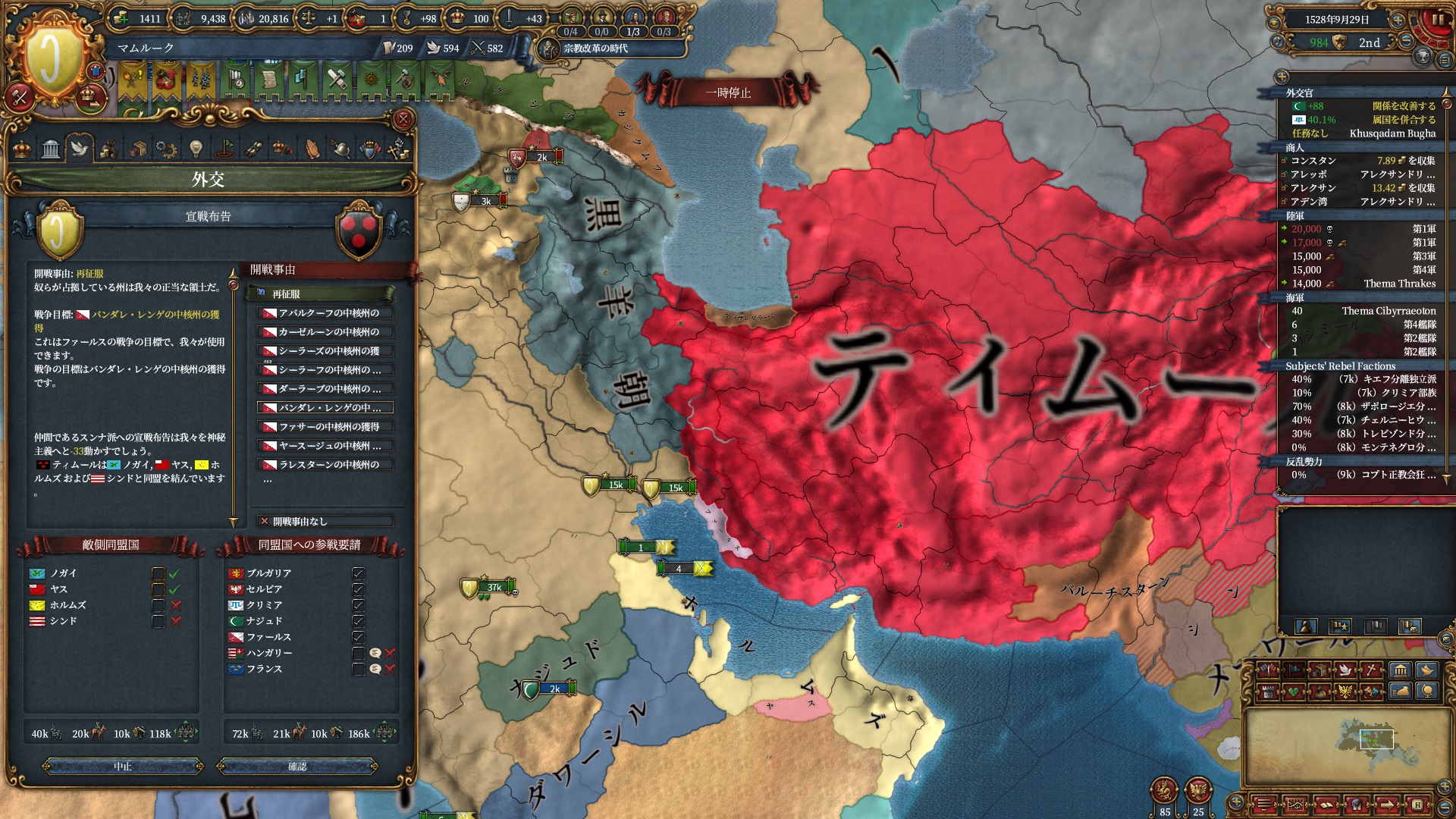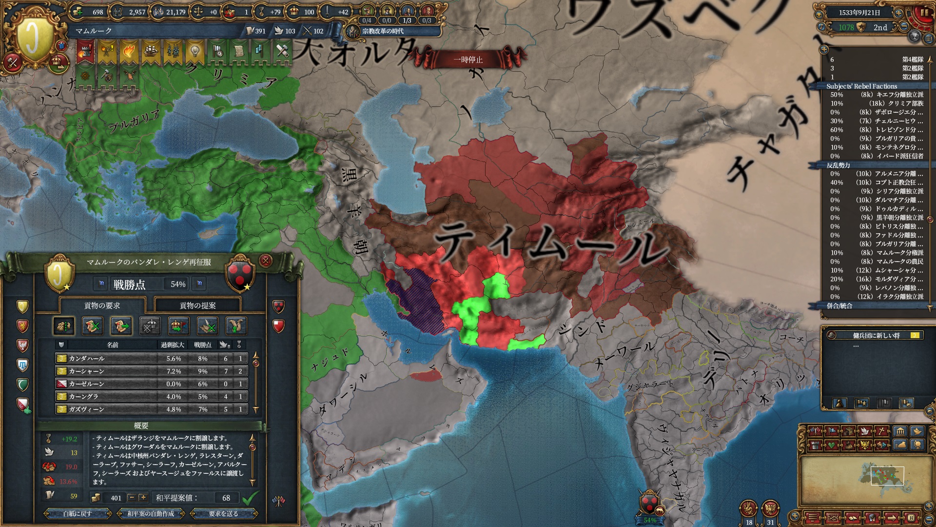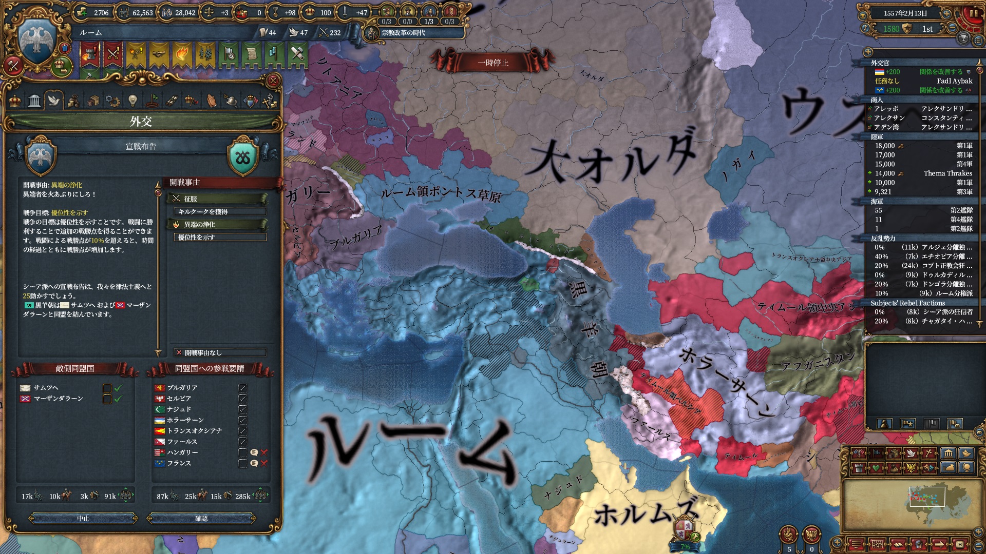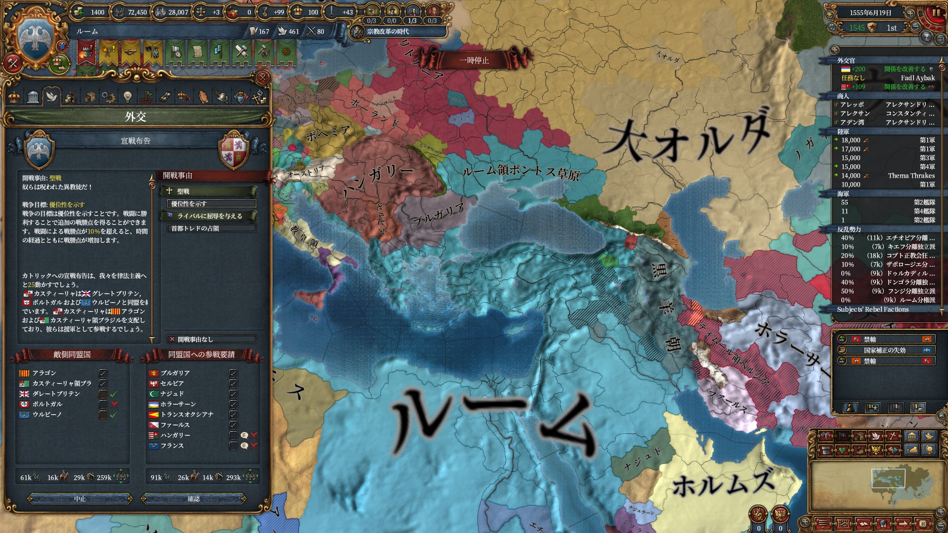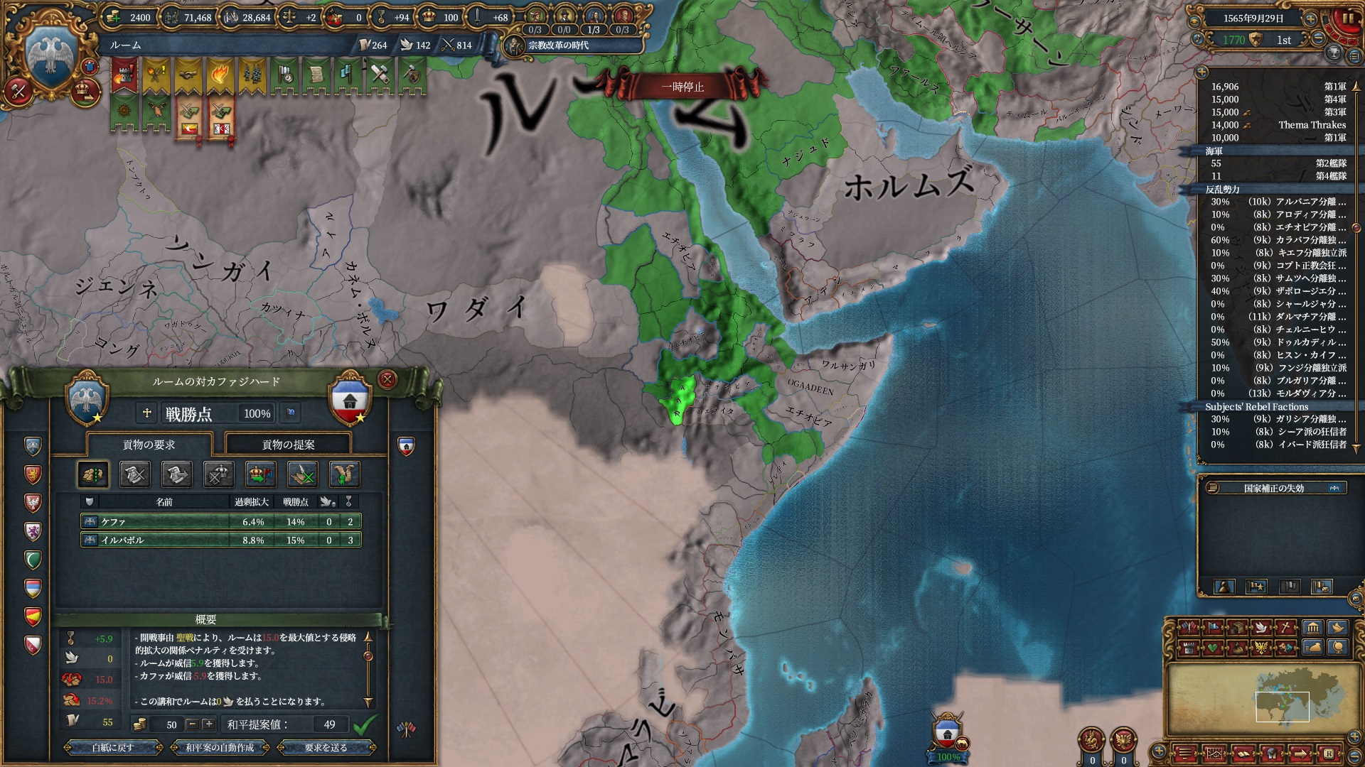 ほか、同盟国を引き連れ宣戦した時にわざわざこちらに解放しに来てくれそのまま反乱軍撃破したり、属国領に反乱軍が突っ込んで返り討ちにあったり(インド聖戦用の突端に行こうとしていた?)グダグダな事に。。