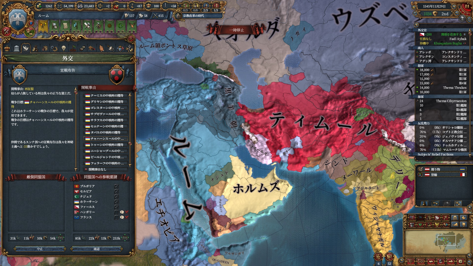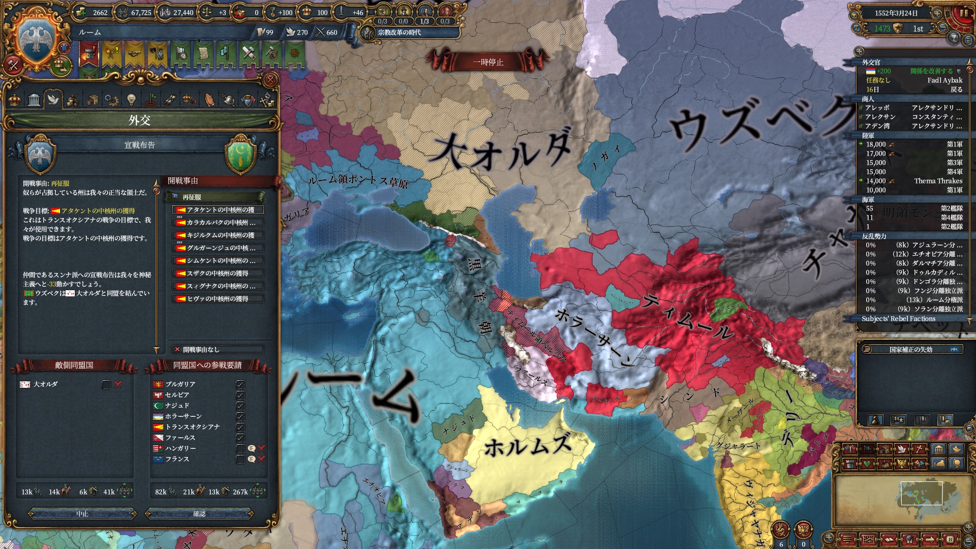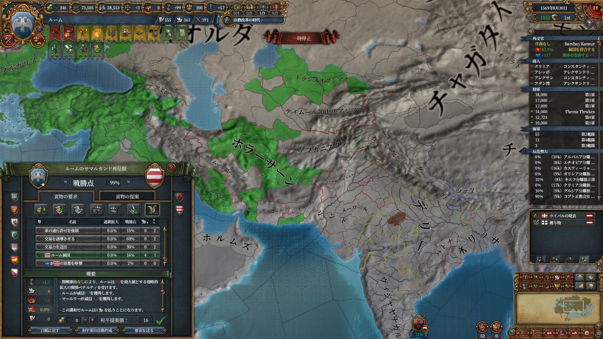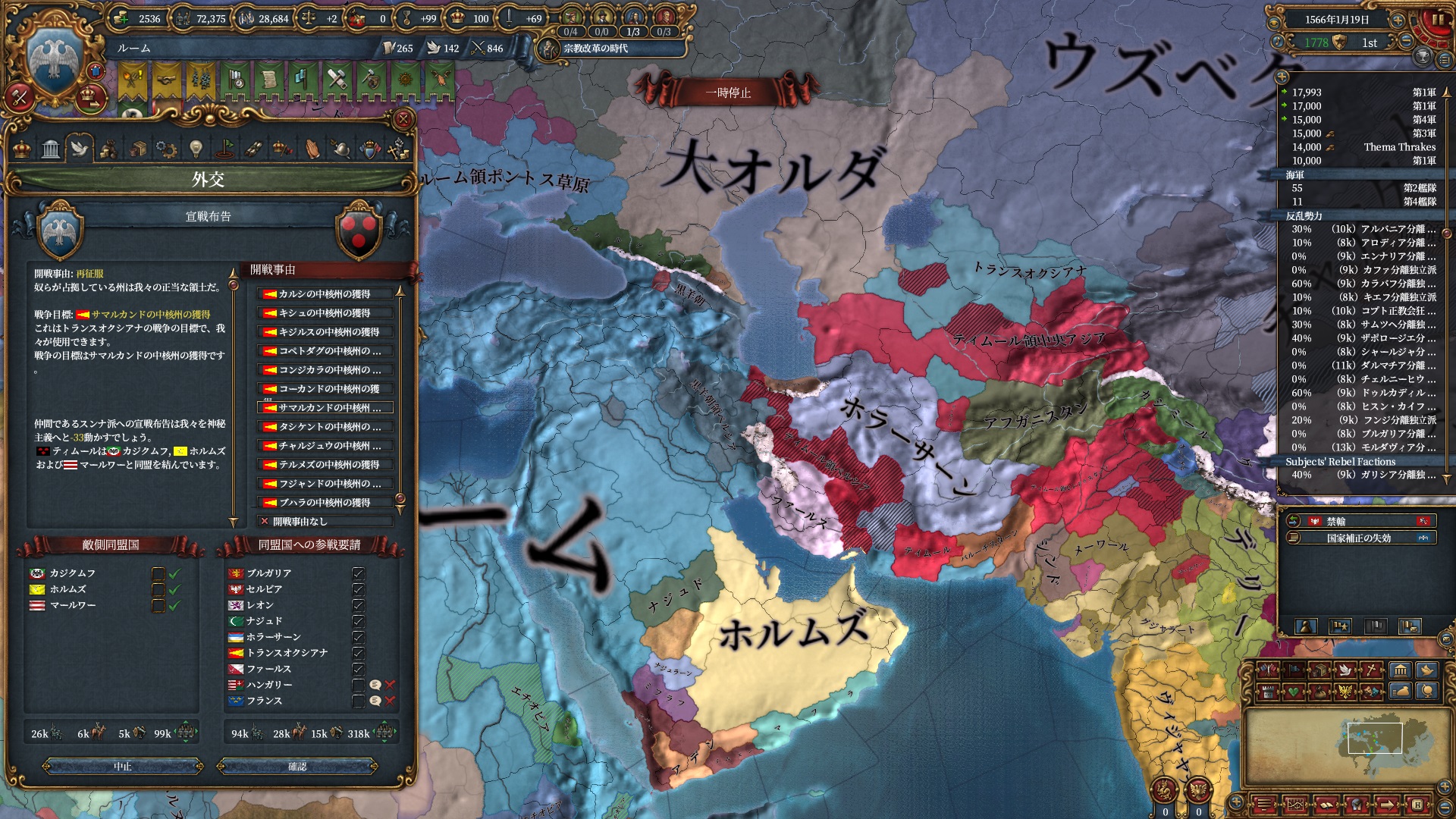 ほか、同盟国を引き連れ宣戦した時にわざわざこちらに解放しに来てくれそのまま反乱軍撃破したり、属国領に反乱軍が突っ込んで返り討ちにあったり(インド聖戦用の突端に行こうとしていた?)グダグダな事に。。