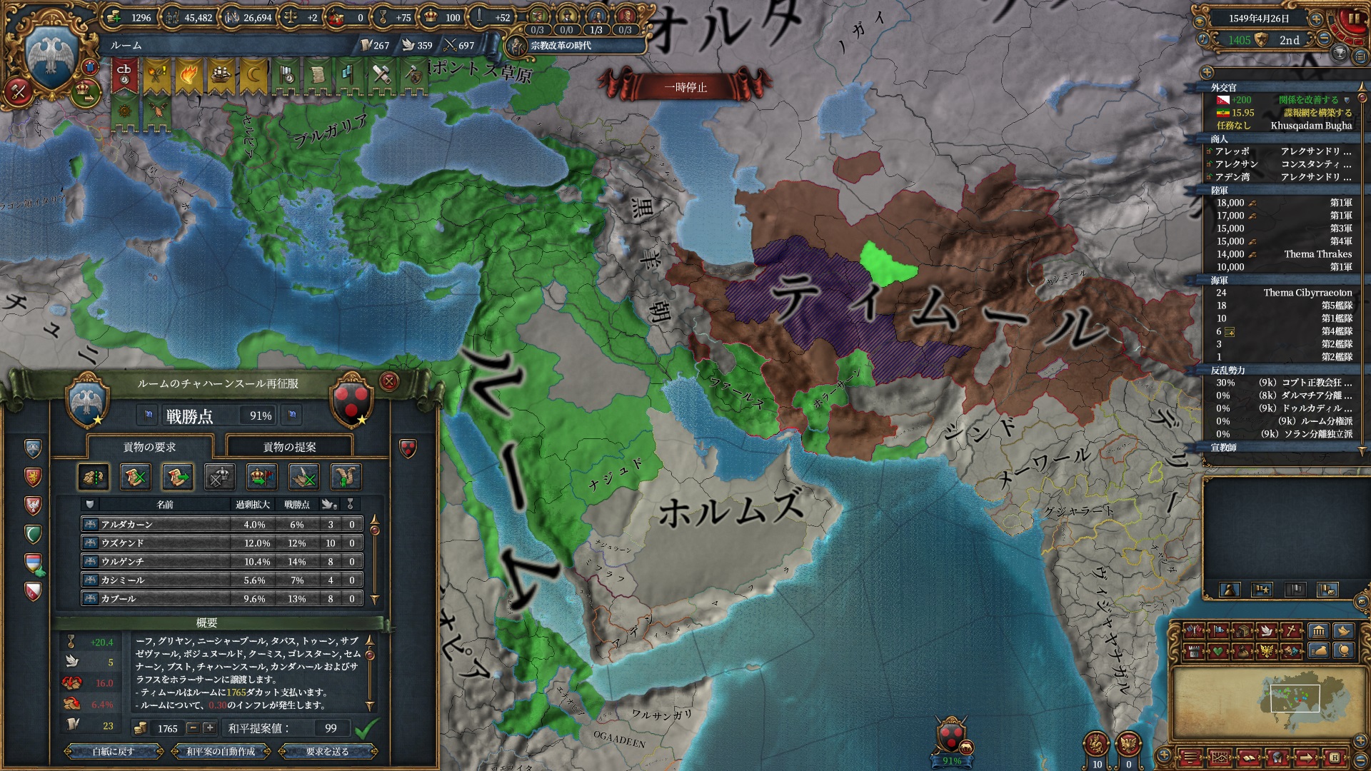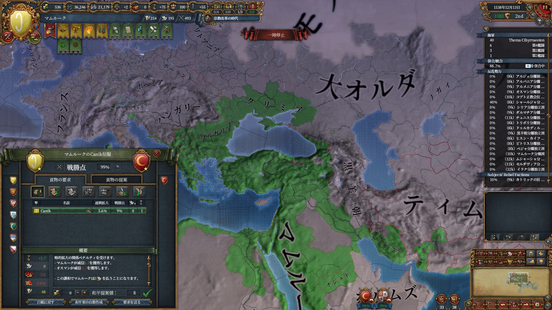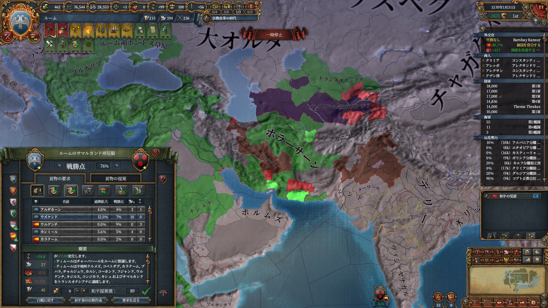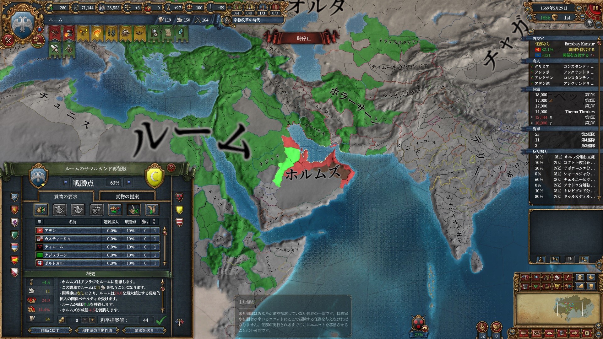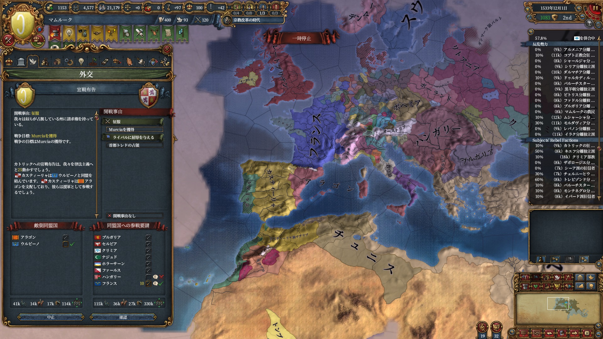 ほか、同盟国を引き連れ宣戦した時にわざわざこちらに解放しに来てくれそのまま反乱軍撃破したり、属国領に反乱軍が突っ込んで返り討ちにあったり(インド聖戦用の突端に行こうとしていた?)グダグダな事に。。