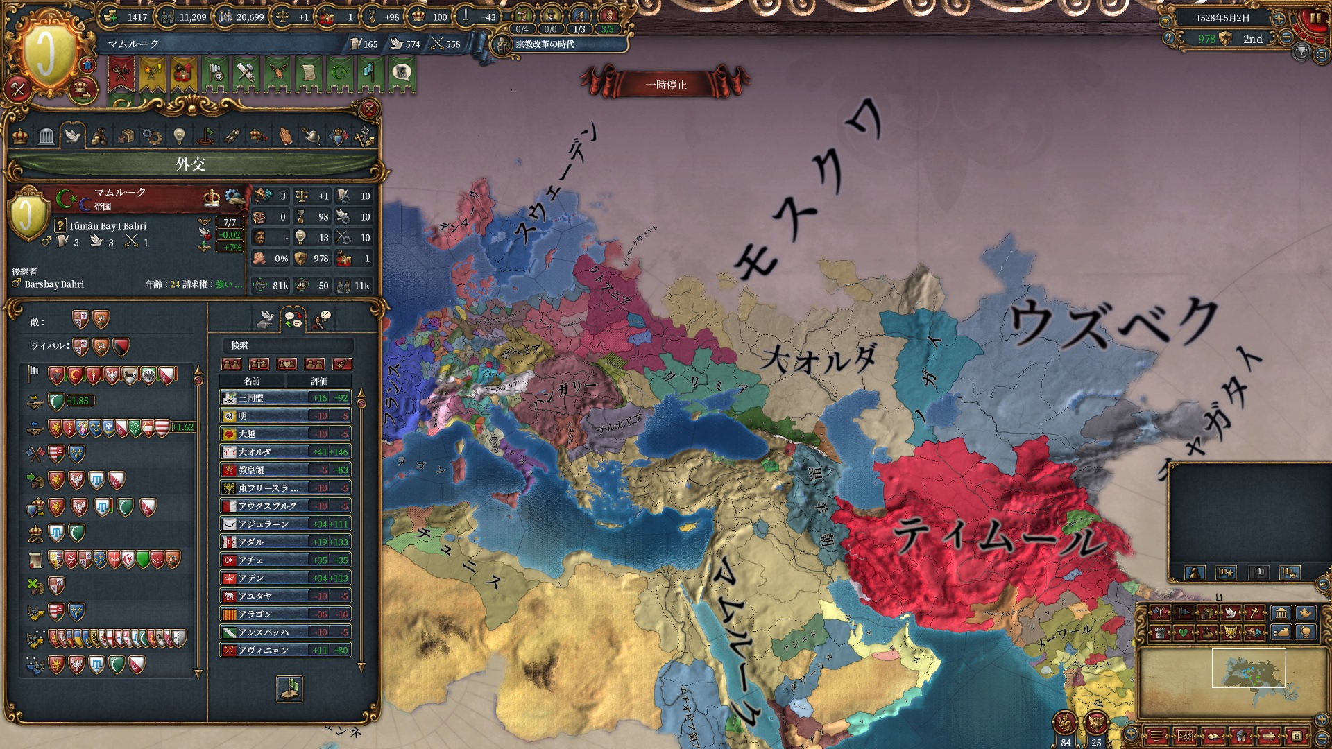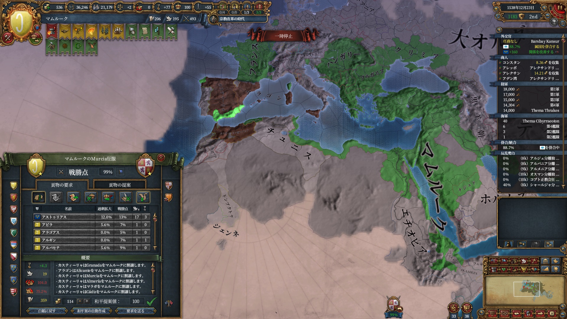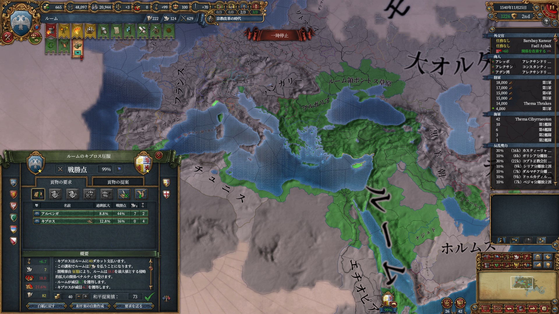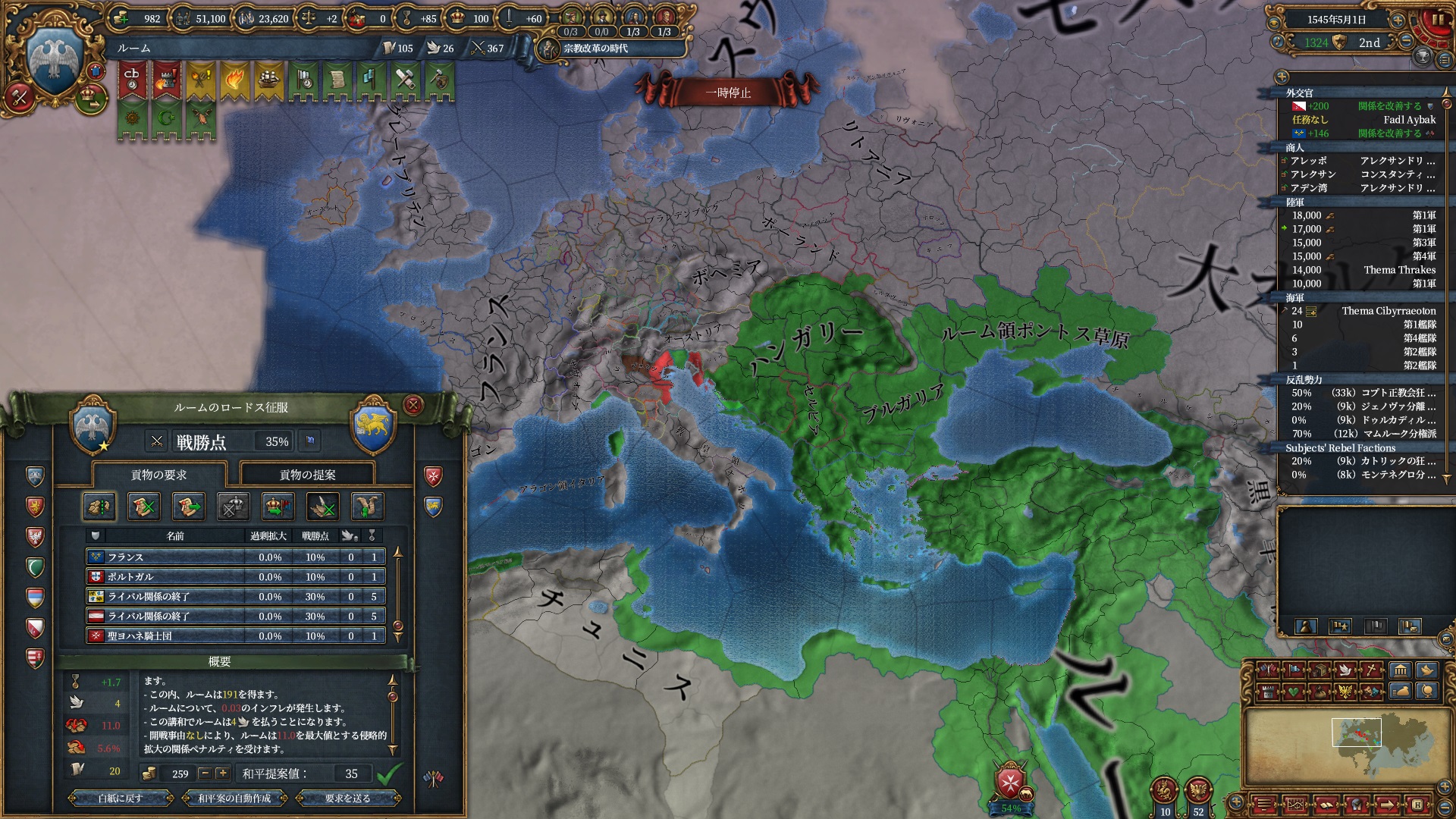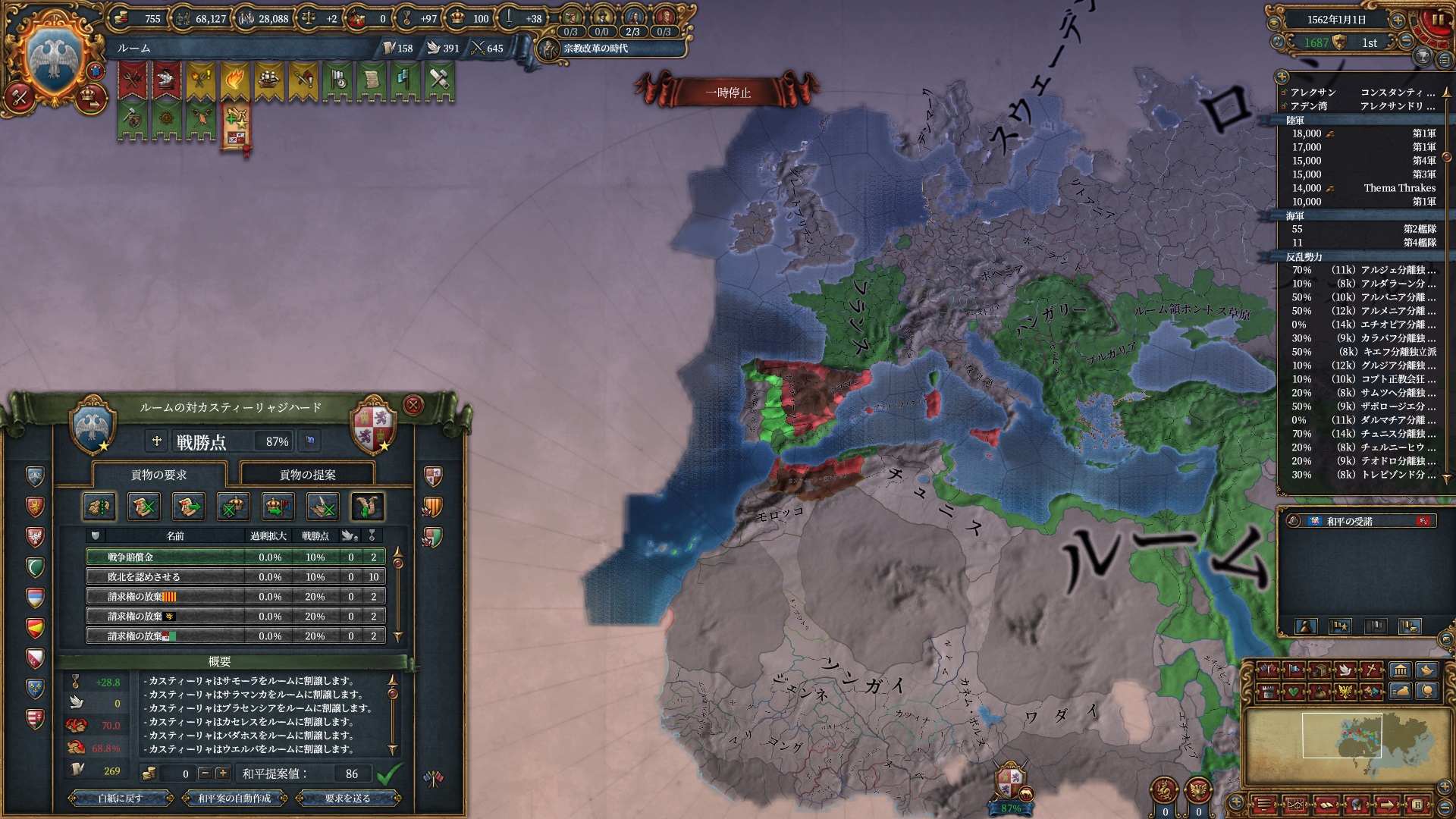ほか、同盟国を引き連れ宣戦した時にわざわざこちらに解放しに来てくれそのまま反乱軍撃破したり、属国領に反乱軍が突っ込んで返り討ちにあったり(インド聖戦用の突端に行こうとしていた?)グダグダな事に。。