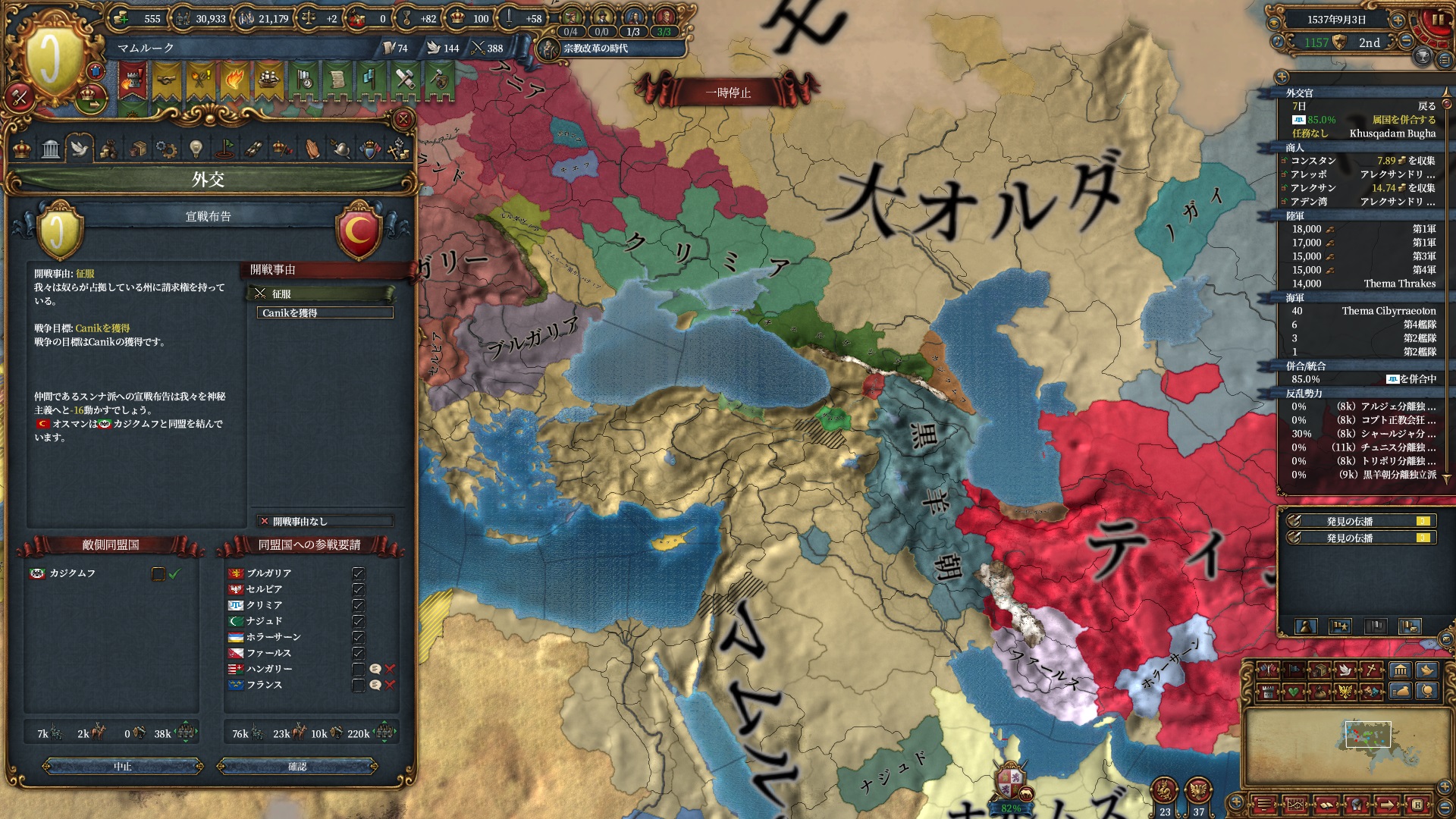 またこのタイミングで停戦明けとなったオスマンに宣戦し滅ぼしました。あとは戦争状態が終われば変態可能になります。