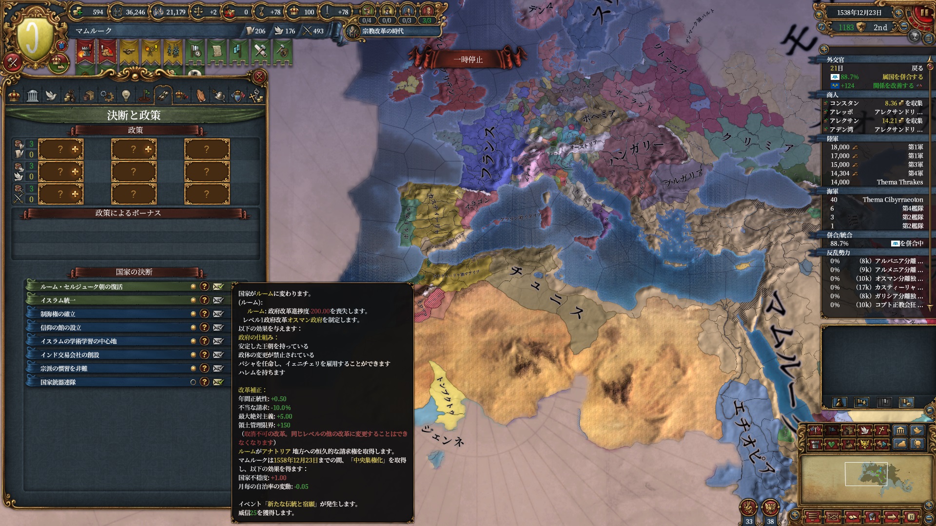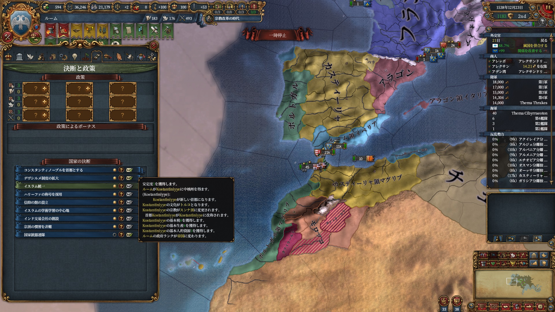 さて早速コンスタンティノープルに首都を移すディシジョンを実行します。これ以上スンナ派の州が増えるのも考え物ですが首都兼交易首都をノーコストで移転したいので我慢です。