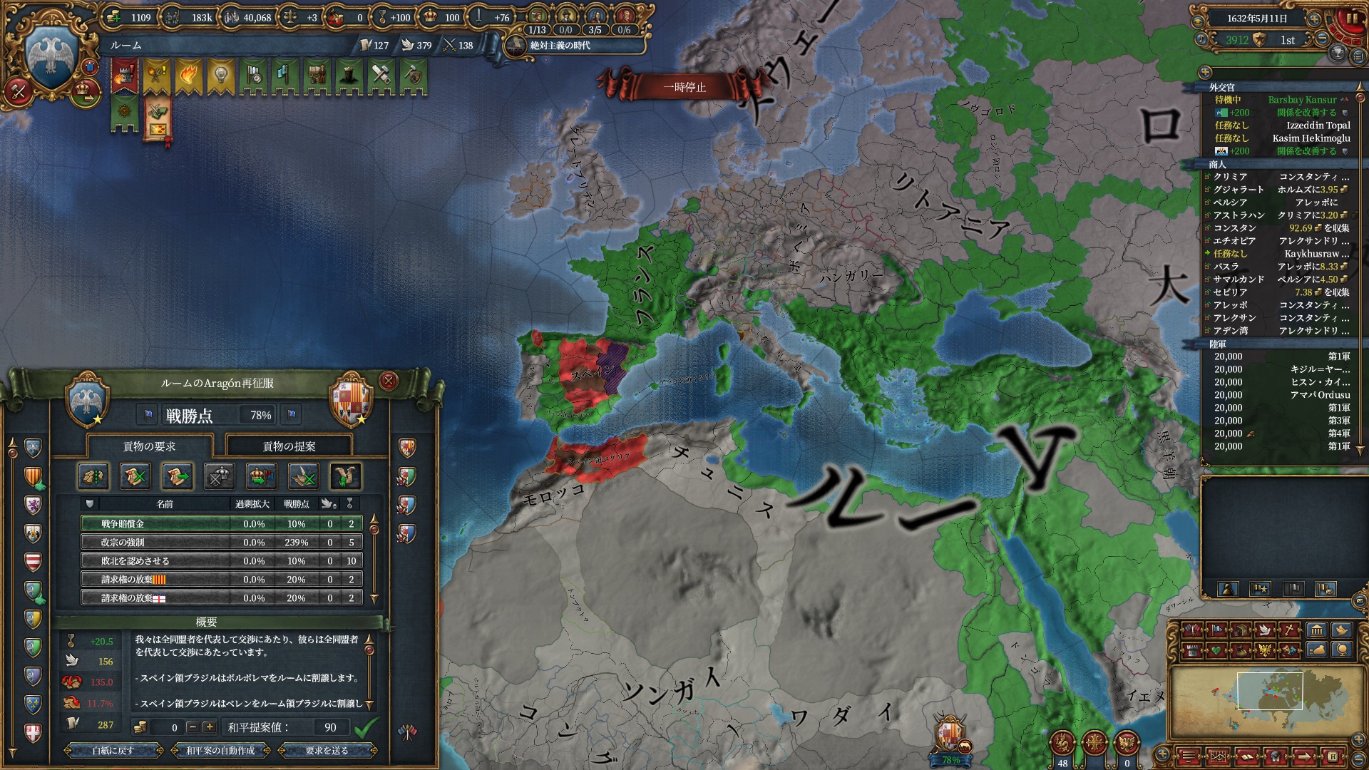 各国戦略の汎用戦略(既に1.32用に更新されているようです)に「コアロンダリング」と呼ばれるHRE州を奪った際の返還要求が平和時にしか行われない事を活用したテクニックがありましたが、現verでは現在のスペイン戦でも返還要求が来る事が確認されました。