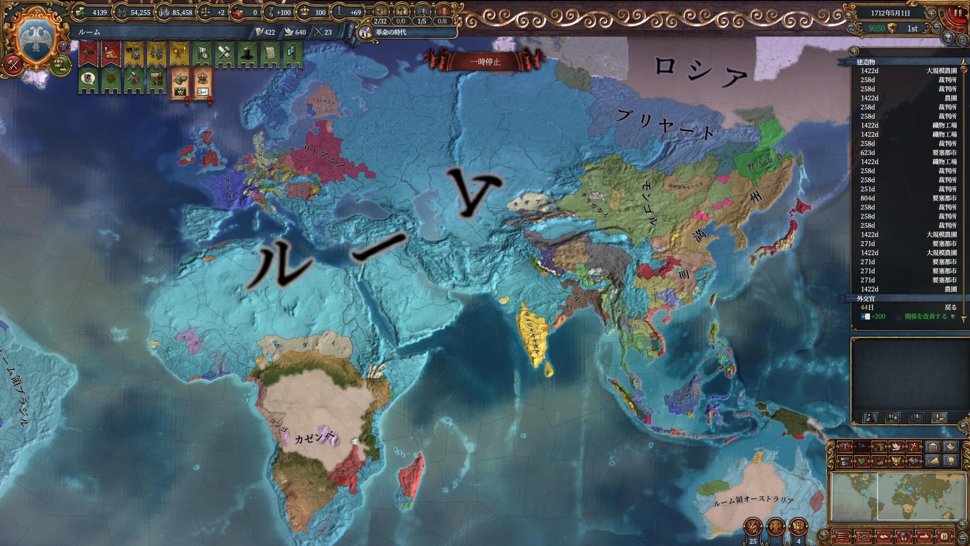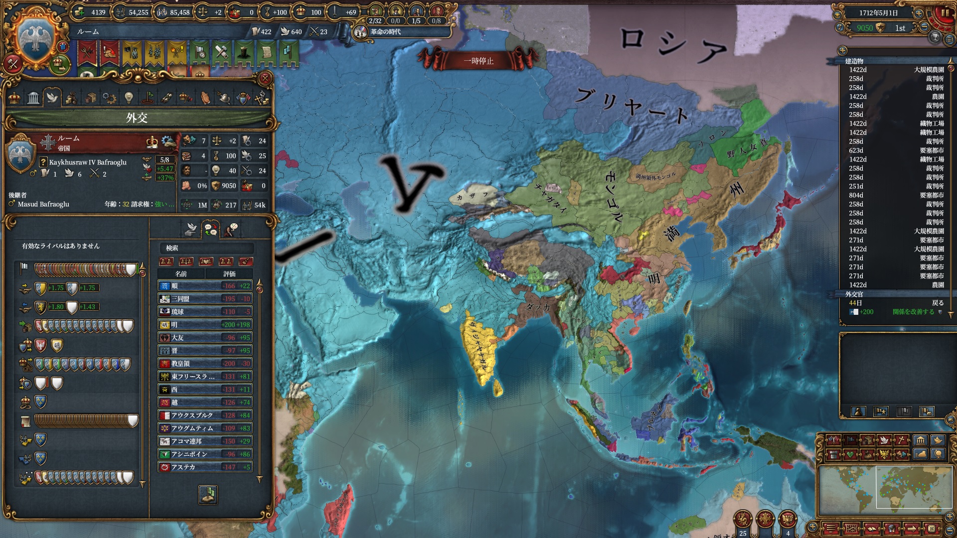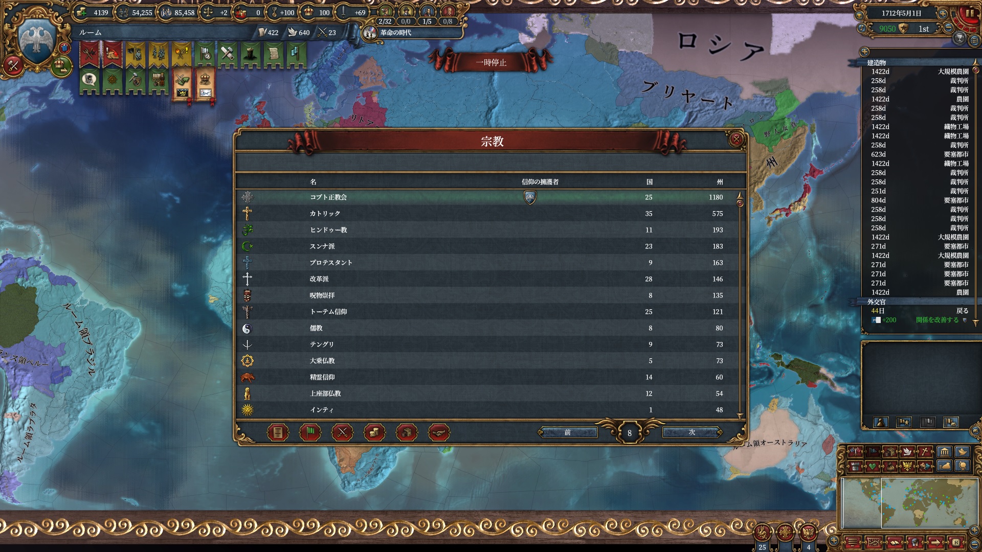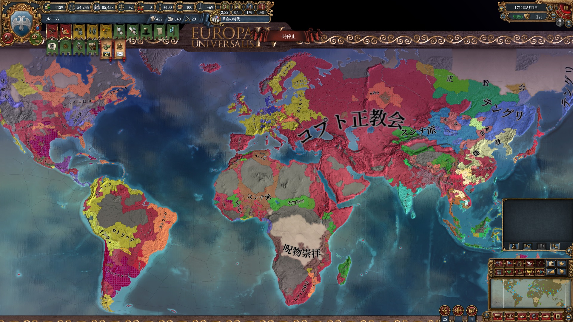 体感では(反乱改宗に手間取ったので仕方ないのですが)改宗状況はう~~んという感じに。とりあえず現verの高い布教強度に期待です。