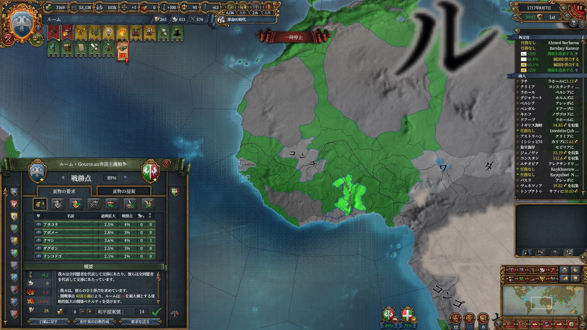 カゼンベが占めるところが高すぎて土地奪取としては微妙な結果ですが一旦落ち着いたらコンゴ側から殴りたいところ。