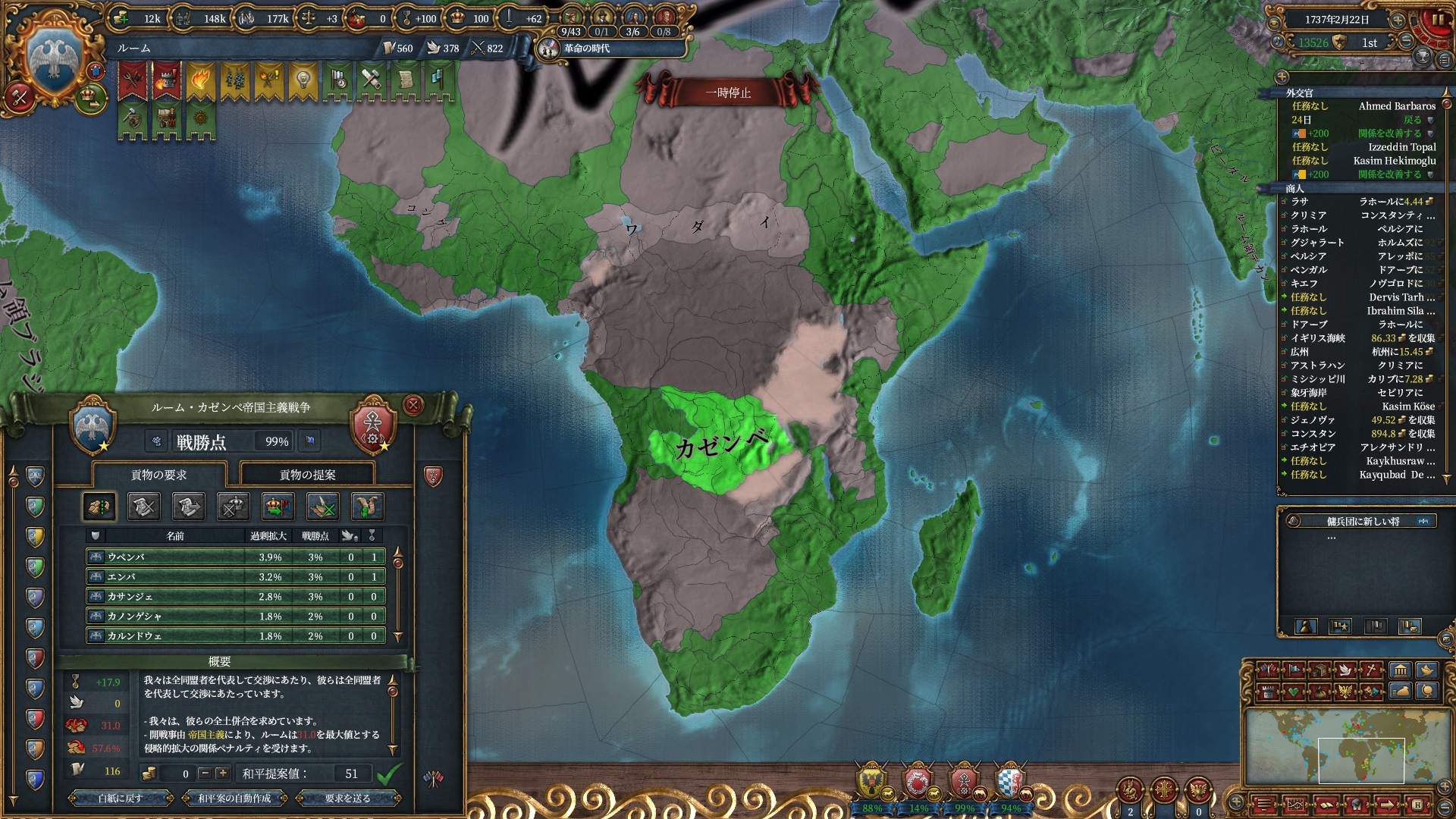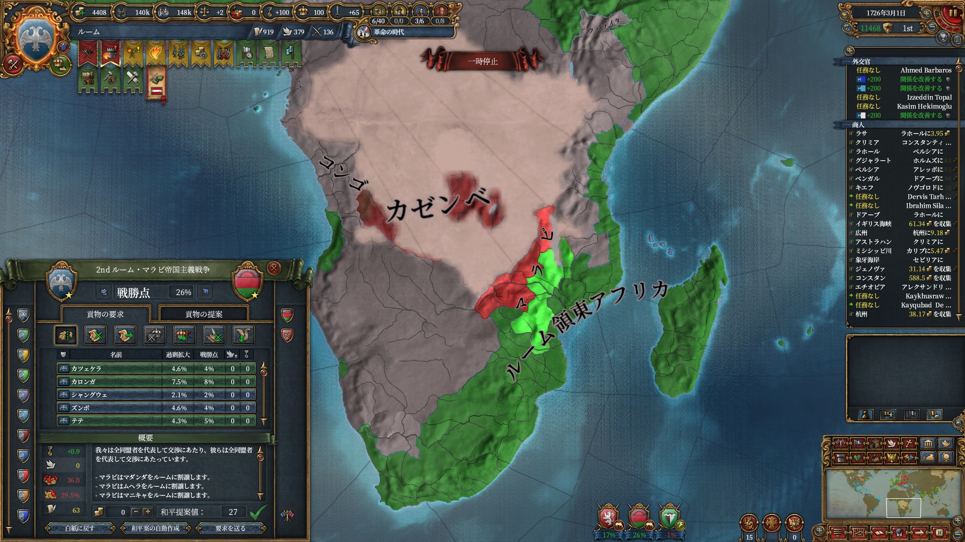 並行して進めていたコンゴ戦ですが、ここら一帯を手に入れたことでカゼンベへのアクセスが楽になりました。